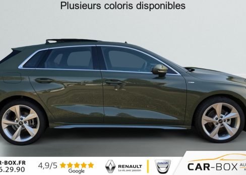 Accoudoir central coulissant en longueur, avec inclinaison réglable, Airbags latéraux, Applications décoratives en aluminium spectre foncé, Applications en aluminium sur la tableau de bord, Audi Drive Select, Audi Hold Assist, Audi Park Assist, Audi park assist plus avec affichage 360°, Audi phone box light, Audi pre sense front, Caméra de recul, Clé Confort, Contrôle de pression des pneus ( TPMS ), Désactivation de lairbag du passager avant, Détecteur de pluie et allumage automatique des projecteurs, Détection signalisation panneaux routiers par caméra, Direction assistée électromécanique asservie à la vitesse, Dispositif de limitation de vitesse, Habillage tableau de bord noir, I-Size et Top Tether pour les sièges arrière extérieurs, Jantes en alliage léger, style dynamique à 5 bras, dimension 8,0J x 18 avec pneus 225/40 R18, Lave-phares haute pression, MMI Radio Plus, Pack Assistance Route (Avertisseur de changement de voie et assistant de circulation transversale, Système de sécurité étendu), Pack Brillance Extérieur (Baguettes en aluminium entourages de vitre, Revêtement noir brillant sur les montants), Pack Climatisation (Climatisation automatique Confort 1 zone), Pack Confort (Appui lombaire à 4 axes, Rétroviseur intérieur jour/nuit automatique, Rétroviseurs extérieurs rabattables électriquement), Pack Connectivité (Audi smartphone interface, Audi virtual cockpit plus), Pack Eclairage dambiance pro, Pack Extérieur S line, Pack intérieur S line #1 (Sièges sport à lavant, Ciel de pavillon en tissu noir, Sellerie tissu Pouls/matériaux synthétiques avec estampagne S monopur 550), Pare-brise à vitrage acoustique, Peinture métallisée Vert District, Phares Matrix LED avec clignotants dynamiques à l?avant et à l?arrière, Préparation pour crochet dattelage, Réception radio numérique (DAB), Rétroviseur extérieur passager indexé au passage de la marche arrière, Rétroviseurs extérieurs couleur carrosserie, Rétroviseurs extérieurs réglables électriquement et dégivrants, Sécurité enfant électrique, Sièges avant chauffants, Sièges avant réglables manuellement, Suspensions sport, Système audio SONOS premium avec son 3D, Système d?assistance au maintien dans la voie, Tapis de sol noir, Toit ouvrant panoramique en verre, Vitres arrières surteintées (vitrage privacy), Volant cuir multifonctions Plus 3 branches avec palettes de commande au volant