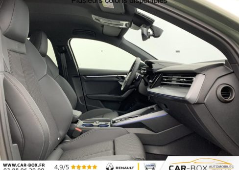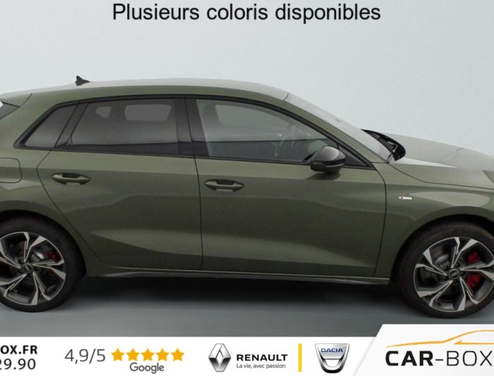 Siège conducteur réglable électriquement : option incluse (valeur : 300 Eur TTC), Commande de désactivation de l'airbag passager AV, Boîtiers de rétroviseurs extérieurs dans la couleur de la carrosserie, ABS, Réception radio numérique (DAB), Boîtiers de rétroviseurs extérieurs en Noir, Condamnation centralisée des portes, Appel d'urgence Audi connect, Détecteur de pluie et de luminosité, Volant cuir Sport multifonctions Plus 3 branches avec méplat et palettes de commande au volant, Vitrage Privacy : lunette AR, vitres de portières AR et vitres latérales AR surteintées, Audi Drive Select, Direction assistée électromécanique, asservie à la vitesse, Rétroviseur intérieur jour/nuit automatique sans encadrement, Kit réparation, Sécurité enfant électrique, Contrôle de la pression des pneus, Peinture métallisées : option incluse (valeur : 900 Eur TTC), ESP, Phares à LED avec clignotants dynamiques AR, Appui lombaire à 4 axes pour les sièges AV : réglages électrique, horizontal et vertical, Audi phone box light, Audi Hold Assist, Jantes en alliage léger 18'', 5 branches en Y, Gris Graphite, tournées brillantes 8,0 J x 18" 225/40 R18, Clé confort incluant déverrouillage du coffre par capteur (sans safelock) - Accès et démarrage du véhicule mains libres (keyless access) - Déverrouillage du hayon via la touche "coffre" de la télécommande ou en simulant un mouvement de pied dans la zone à l'AR du véhicule (ouverture et fermeture)., Rétroviseurs extérieurs réglables, dégivrants, rabattables électriquement avec fonction rabat automatique, Accoudoir central coulissant en longueur, avec inclinaison réglable, Pare-brise à vitrage acoustique, MMI Radio Plus, Audi pre sense front, Dispositif de limitation de vitesse, Rappel de ceinture de sécurité avec dispositif AR de détection d'occupation du siège, Pack extérieur S line, 2 ports de charge USB AR, I-Size et Top Tether pour les sièges AR extérieurs, Pack intérieur S line, Airbags latéraux à l'AV et système d'airbags de tête, Hayon assisté électriquement pour l'ouverture et la fermeture : option incluse (valeur : 450 Eur TTC), Sellerie tissu "Pouls" / Combinaison tissue pouls/en matière synthétiques avec estampage S, Pack Esthétique Noir Plus Reprend tous les éléments de Pack Esthétique Noir + anneaux Audi en noir sur l'AV et l'AR du véhicule et identification du modèle/moteur en noir : Pack Esthétique Noir Anneaux Audi en noir AV et AR du véhicule et identification modèle/moteur en noir, Applications décoratives en aluminium Spectre foncé (au tableau de bord), Détection de signalisation routière par caméra, Pack assistance M Caméra de recul : Caméra de recul, Pack climatisation plus Sièges AV chauffants, Climatisation confort automatique 3 zones : Sièges AV chauffants Climatisation automatique Confort 3 zones, Assistant de vitesse adaptatif, Pack connectivité Audi virtual cockpit plus, MMI Navigation plus, Audi Connect, Audi sound system, Audi Smartphone Interface : Audi Sound System Audi Virtual Cockpit Plus MMI Navigation plus avec MMI touch Audi connect Navigation & Infotainment Audi smartphone interface, Pack éclairage d'ambiance plus 30 couleurs diff. pour le profil de couleur personnalisé. l'éclairage de contour du tableau de bord, l'éclairage d'ambiance des portes AV et AR, l'éclairage de contour des portes AV et AR, le compartiment de rangement de la console centrale, l'éclairage des contours de la console centrale, porte-gobelets éclairés. en blanc :éclairage d'entrée sous les portes et des caves à pieds AV et AR - Miroirs de courtoisie éclairés, module de toit, à l'AV/AR, y les liseuses, Eclairage du compartiment : Miroirs de courtoisie éclairés 30 couleurs au choix pour un profil de couleur personnalisable Module de toit à LED, AV/AR y compris liseuses Eclairage du compartiment à bagages Eclairage des caves à pieds, à l'AV et à l'AR, en blanc Eclairage d'entrée sous les portes, à l'AV et à l'AR, en blanc Eclairage des contours de la console centrale Eclairage des contours du tableau de bord Eclairage d'ambiance des portes AV/AR Eclairage de contour des portes AV et AR Eclairage du compartiment de rangement de la console centrale Porte-gobelets éclairés, Assistant de maintien dans la voie, Etriers de freins rouges, Câble de recharge mode 3 pour recharge publique 11kW, Câble de recharge prise domestique, Vitres AR surteintées, Contrôle de la traction (TCS), Clé à fréquence radio (sans safelock) Verrouillage central "Keyless-Go" verrouille et déverrouille les portes, le capot de coffre et la trappe à carburant ; incluant ouverture/fermeture confort des vitres, Boîte automatique S Tronic 6 vitesses, Audi park assist plus avec caméra. L'aide au stationnement plus peut aider à entrer et à sortir des places de stationnement qui peuvent être limitées par des véhicules ou des objets. Le système prend le contrôle de la direction, de l'accélération, du freinage et du changement de vitesse, Pack intérieur sport combinaison tissu/matière synthétique Sièges sport à l'AV, Sellerie en combinaison tissu Pouls/similicuir avec estampagne S, Pédalier en acier inoxydable, Enjoliveurs de seuil de porte avec inserts en aluminium à l'AV, Dossier de banquette AR rabattable 60/40, Application de volant en style chrome, emblème S, poignées de volant en cuir perforé et couture contrastée, Pavillon en tissu noir, Accoudoir en matériaux synthétiques, Style aluminium à l'intérieur : Ciel de pavillon en tissu Noir Sièges AV Sport Pédalier et repose-pieds en acier inoxydable Style aluminium à l'intérieur Dossier de banquette AR rabattable 40:60 Enjoliveurs de seuil de porte avec inserts en aluminium à l'AV, éclairés, monogramme S Accoudoir de portière en matière synthétiques Sellerie tissu "Pouls" / Combinaison tissue pouls/en matière synthétiques avec estampage S Application de volant en style chrome, emblème S, p