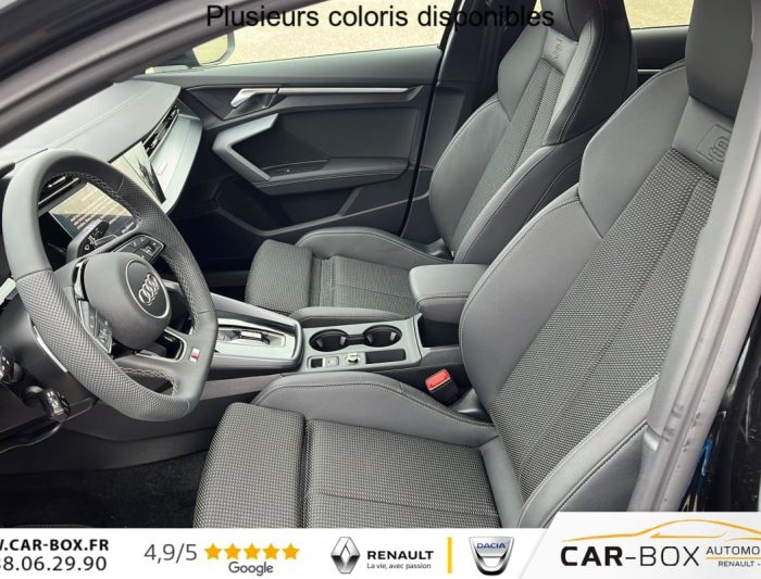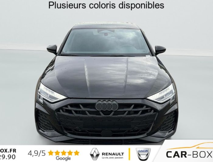 Siège conducteur réglable électriquement : option incluse (valeur : 300 Eur TTC), Commande de désactivation de l'airbag passager AV, Boîtiers de rétroviseurs extérieurs dans la couleur de la carrosserie, ABS, Réception radio numérique (DAB), Boîtiers de rétroviseurs extérieurs en Noir, Condamnation centralisée des portes, Appel d'urgence Audi connect, Détecteur de pluie et de luminosité, Volant cuir Sport multifonctions Plus 3 branches avec méplat et palettes de commande au volant, Vitrage Privacy : lunette AR, vitres de portières AR et vitres latérales AR surteintées, Audi Drive Select, Direction assistée électromécanique, asservie à la vitesse, Rétroviseur intérieur jour/nuit automatique sans encadrement, Kit réparation, Sécurité enfant électrique, Contrôle de la pression des pneus, Peinture métallisées : option incluse (valeur : 900 Eur TTC), ESP, Phares à LED avec clignotants dynamiques AR, Appui lombaire à 4 axes pour les sièges AV : réglages électrique, horizontal et vertical, Audi phone box light, Audi Hold Assist, Jantes en alliage léger 18'', 5 branches en Y, Gris Graphite, tournées brillantes 8,0 J x 18" 225/40 R18, Clé confort incluant déverrouillage du coffre par capteur (sans safelock) - Accès et démarrage du véhicule mains libres (keyless access) - Déverrouillage du hayon via la touche "coffre" de la télécommande ou en simulant un mouvement de pied dans la zone à l'AR du véhicule (ouverture et fermeture)., Rétroviseurs extérieurs réglables, dégivrants, rabattables électriquement avec fonction rabat automatique, Accoudoir central coulissant en longueur, avec inclinaison réglable, Pare-brise à vitrage acoustique, MMI Radio Plus, Audi pre sense front, Dispositif de limitation de vitesse, Outillage de bord, Rappel de ceinture de sécurité avec dispositif AR de détection d'occupation du siège, Pack extérieur S line, 2 ports de charge USB AR, I-Size et Top Tether pour les sièges AR extérieurs, Pack intérieur S line, Airbags latéraux à l'AV et système d'airbags de tête, Hayon assisté électriquement pour l'ouverture et la fermeture : option incluse (valeur : 450 Eur TTC), Sellerie tissu "Pouls" / Combinaison tissue pouls/en matière synthétiques avec estampage S, Pack Esthétique Noir Plus Reprend tous les éléments de Pack Esthétique Noir + anneaux Audi en noir sur l'AV et l'AR du véhicule et identification du modèle/moteur en noir : Pack Esthétique Noir Anneaux Audi en noir AV et AR du véhicule et identification modèle/moteur en noir, Applications décoratives en aluminium Spectre foncé (au tableau de bord), Détection de signalisation routière par caméra, Pack assistance M Caméra de recul : Caméra de recul, Pack climatisation plus Sièges AV chauffants, Climatisation confort automatique 3 zones : Sièges AV chauffants Climatisation automatique Confort 3 zones, Assistant de vitesse adaptatif, Pack connectivité Audi virtual cockpit plus, MMI Navigation plus, Audi Connect, Audi sound system, Audi Smartphone Interface : Audi Sound System Audi Virtual Cockpit Plus MMI Navigation plus avec MMI touch Audi connect Navigation & Infotainment Audi smartphone interface, Pack éclairage d'ambiance plus 30 couleurs diff. pour le profil de couleur personnalisé. l'éclairage de contour du tableau de bord, l'éclairage d'ambiance des portes AV et AR, l'éclairage de contour des portes AV et AR, le compartiment de rangement de la console centrale, l'éclairage des contours de la console centrale, porte-gobelets éclairés. en blanc :éclairage d'entrée sous les portes et des caves à pieds AV et AR - Miroirs de courtoisie éclairés, module de toit, à l'AV/AR, y les liseuses, Eclairage du compartiment : Miroirs de courtoisie éclairés 30 couleurs au choix pour un profil de couleur personnalisable Module de toit à LED, AV/AR y compris liseuses Eclairage du compartiment à bagages Eclairage des caves à pieds, à l'AV et à l'AR, en blanc Eclairage d'entrée sous les portes, à l'AV et à l'AR, en blanc Eclairage des contours de la console centrale Eclairage des contours du tableau de bord Eclairage d'ambiance des portes AV/AR Eclairage de contour des portes AV et AR Eclairage du compartiment de rangement de la console centrale Porte-gobelets éclairés, Assistant de maintien dans la voie, Etriers de freins rouges, Câble de recharge mode 3 pour recharge publique 11kW, Câble de recharge prise domestique, Vitres AR surteintées, Contrôle de la traction (TCS), Clé à fréquence radio (sans safelock) Verrouillage central "Keyless-Go" verrouille et déverrouille les portes, le capot de coffre et la trappe à carburant ; incluant ouverture/fermeture confort des vitres, Boîte automatique S Tronic 6 vitesses, Audi park assist plus avec caméra. L'aide au stationnement plus peut aider à entrer et à sortir des places de stationnement qui peuvent être limitées par des véhicules ou des objets. Le système prend le contrôle de la direction, de l'accélération, du freinage et du changement de vitesse, Pack intérieur sport combinaison tissu/matière synthétique Sièges sport à l'AV, Sellerie en combinaison tissu Pouls/similicuir avec estampagne S, Pédalier en acier inoxydable, Enjoliveurs de seuil de porte avec inserts en aluminium à l'AV, Dossier de banquette AR rabattable 60/40, Application de volant en style chrome, emblème S, poignées de volant en cuir perforé et couture contrastée, Pavillon en tissu noir, Accoudoir en matériaux synthétiques, Style aluminium à l'intérieur : Ciel de pavillon en tissu Noir Sièges AV Sport Pédalier et repose-pieds en acier inoxydable Style aluminium à l'intérieur Dossier de banquette AR rabattable 40:60 Enjoliveurs de seuil de porte avec inserts en aluminium à l'AV, éclairés, monogramme S Accoudoir de portière en matière synthétiques Sellerie tissu "Pouls" / Combinaison tissue pouls/en matière synthétiques avec estampage S Application de volant en style ch