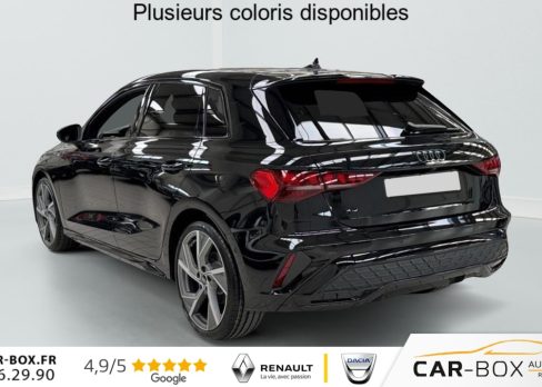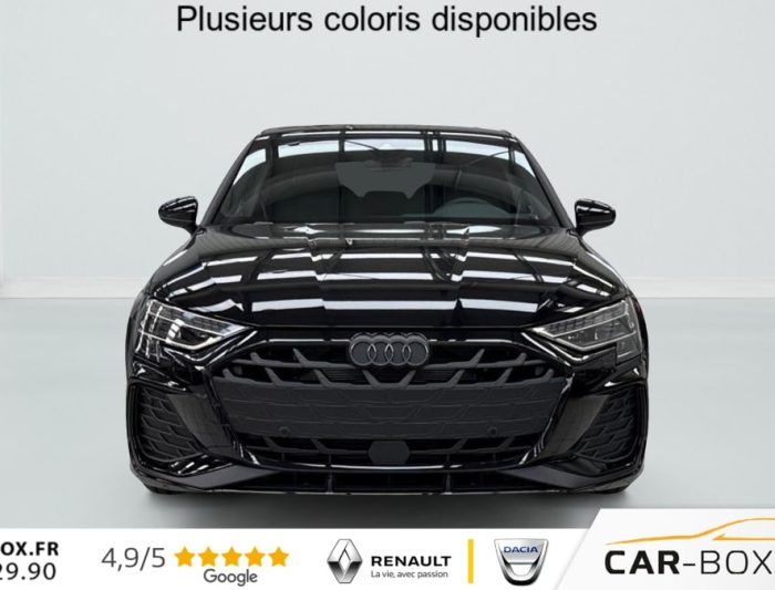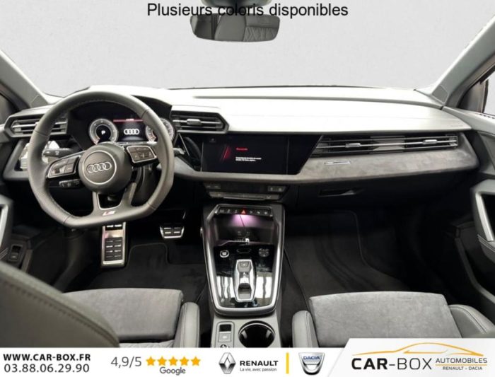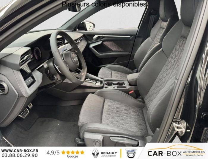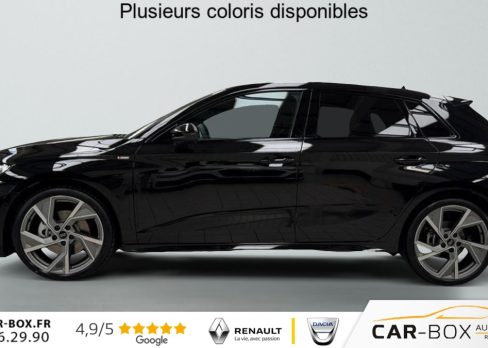 Assistant de maintien dans la voie, Clé confort incluant déverrouillage du coffre par capteur (sans safelock) - Accès et démarrage du véhicule mains libres (keyless access) - Déverrouillage du hayon via la touche "coffre" de la télécommande ou en simulant un mouvement de pied dans la zone, Fixation siège enfant conforme à la norme i-Size côté passager avant et sur les sièges extérieurs arrières, Top Tether pour les sièges extérieurs arrières, Phares avant LED et feux arrière LED avec clignotants arrière dynamiques Feux arrière LED avec clignotant dynamique Phares LED : option incluse (valeur : 1 170 Eur TTC), Sécurité enfant manuelle, Commande de désactivation de l'airbag passager AV, Boîtiers de rétroviseurs extérieurs dans la couleur de la carrosserie, Réception radio numérique (DAB), Peinture métallisée Noir Mythic : option incluse (valeur : 900 Eur TTC), Appel d'urgence Audi connect, Ecrous de roues antivol, Tapis de sol AV/AR, Détecteur de pluie et de luminosité, Volant cuir Sport multifonctions Plus 3 branches avec méplat et palettes de commande au volant, Vitrage Privacy : lunette AR, vitres de portières AR et vitres latérales AR surteintées, Audi Drive Select, Appuis lombaires à 4 axes pour les sièges AV, Direction assistée électromécanique, asservie à la vitesse, Rétroviseur intérieur jour/nuit automatique sans encadrement, Kit réparation, Contrôle de la pression des pneus, Sièges AV réglables manuellement : hauteur d'assise, positionnement en longueur, inclinaison du dossier, hauteur des appuie-tête et hauteur des ceintures, Audi phone box light, Jantes en alliage léger Audi Sport 19", structure 5 bras en Y, Gris Titane mat, tournées brillant, 8,0J x 19", pneus 235/35 R19 : option incluse (valeur : 1 400 Eur TTC), Hayon ou coffre assisté électriquement pour l'ouverture et la fermeture : option incluse (valeur : 450 Eur TTC), Rétroviseurs extérieurs réglables, dégivrants, rabattables électriquement avec fonction rabat automatique, Audi park assist : cherche à l'aide de capteurs à ultrasons les places de stationnement (bataille et créneau) appropriées le long de la chaussée, calcule le créneau idéal et gère le braquage automatiquement, Accoudoir central coulissant en longueur, avec inclinaison réglable, Pare-brise à vitrage acoustique, Audi Connect Appel d'urgence, MMI Radio Plus, Alerte de sortie de voie, Audi pre sense front, Dispositif de limitation de vitesse, Outillage de bord, Rappel de ceinture de sécurité avec dispositif AR de détection d'occupation du siège, 2 ports de charge USB AR, Airbags latéraux AV et système d'airbags de tête, Pack Esthétique Noir Plus -Anneaux Audi en noir sur AV/AR du véhicule et identification du modèle/moteur en noir Anneaux Audi en noir AV/AR du véhicule et identification modèle/moteur en noir : option incluse (valeur : 840 Eur TTC), Détection de signalisation routière par caméra, Pack assistance et stationnement M : Caméra de recul Pack assistance , Pack connectivité : Audi connect Navigation & Infotainment Audi smartphone interface Audi sound system : 10 HP incluant un HP central et un subwoofer, amplificateur à 6 canaux avec une puissance totale de 180 watts Audi Virtual Cockpit Plus Navigation MMI plus avec MMI touch , Pack intérieur S line 3 Sièges Sport à l'AV, Sellerie Dinamica micro-fibre/mat. synthé.monopur 550, Style aluminium à l'intérieur, Pack éclairage d'ambiance pro, Pédalier et repose-pieds en acier inoxydable, Dossier de banquette arrière, rabattable 40/20/40, Application de volant en style chrome, emblème S, poignées de volant en cuir perforé et coutures ontrastées, Ciel de pavillon en tissu Noir, Accoudoir en matériaux synthétiques, Enjoliveurs de seuil de porte avec inserts en aluminium à l'AV, Accoudoir de portière en matière synthétiques Application de volant en style chrome, emblème S, poignées de volant en cuir perforé et couture contrastée Ciel de pavillon en tissu Noir Dossier de banquette AR, rabattable en trois parties Enjoliveurs de seuil de porte avec inserts en aluminium AV, éclairés, monogramme S Pack éclairage d'ambiance pro Module de toit à AV et AR, y compris liseuses, Miroir de courtoisie éclairé, Éclairage d'ambiance des portes AV/AR, Eclairage des seuils de porte, Compartiment de rangement éclairé de la console centrale, Eclairage du plancher AV Pédalier et repose-pieds en acier inoxydable Sellerie Dinamica/matériaux synthétiques monopur 550 Sièges AV Sport Style aluminium à l'intérieur : option incluse (valeur : 1 200 Eur TTC), Système Start & Stop avec récupération d'énergie au freinage