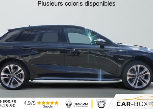 ABS, Accoudoir central coulissant en longueur, avec inclinaison reglable, Aide au stationnement avant et arriere , Airbags lateraux a l'AV et systeme d'airbags de tete, Alerte de fatigue , Alerte de survitesse , Appel d'urgence & service Audi connect, Appui lombaire a 4 axes pour les sieges AV, Audi Drive Select, Audi phone box light, Audi pre sense , Audi smartphone interface, Avertissement de franchissement de ligne , Avertissement distance de securite , Boitiers de retroviseurs exterieurs dans la couleur de la carrosserie, Cle confort incluant deverrouillage du coffre par capteur (avec Safelock) + Alarme antivol : option incluse (valeur : 500 Eur TTC), Commande de desactivation de l'airbag passager AV, Condamnation centralisee des portes, Controle de la pression des pneus, Detecteur de pluie et de luminosite, Detection de signalisation routiere par camera, Direction assistee electromecanique, asservie a la vitesse, Dossier de banquette AR rabattable 60/40, ESP, Extension de garantie 2 ans supplementaires (2 + 2) ou 120000 km : option incluse (valeur : 658 Eur TTC), Hayon assiste electriquement pour l'ouverture et la fermeture : option incluse (valeur : 450 Eur TTC), I-Size et Top Tether pour les sieges AR exterieurs, Jantes en alliage leger 18'', 5 branches en Y, Gris Graphite, tournees brillantes, Kit reparation, Leve-vitres avant et arriere electriques , MMI Radio Plus, Pack climatisation plus (Climatisation automatique Confort 3 zones, Sieges AV chauffants), Pack eclairage d'ambiance (pares-soleil avec miroirs de courtoisie eclaires, spots de lecture a LED) : option incluse (valeur : 0 Eur TTC), Pack exterieur S line, Park assist , Phares a LED avec clignotants dynamiques AV et AR, Prise 12V avant , Reception radio numerique (DAB), Regulateur de vitesse et limiteur de vitesse , Retroviseur interieur jour/nuit manuel, Retroviseurs exterieurs reglables electriquement, degivrants, Securite enfants electriques des vitres AR , Siege conducteur a reglage electrique : option incluse (valeur : 0 Eur TTC), Style aluminium a l'interieur, Systeme Start & Stop avec recuperation d'energie au freinage, Vitrage Privacy : lunette AR, vitres de portieres AR et vitres laterales AR surteintees, Vitres AR surteintees, Volant cuir multifonctions plus 3 branches avec palettes de commande au volant, 2 ports de charge USB-C AR, 2 prises USB-C avant