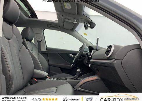 Applications décoratifs éclairés : Encarts décoratifs éclairés pour le tableau de bord côté passager ainsi que pour les flancs de la console centrale Poignées de porte laquées gris ardoise : option incluse (valeur : 240 Eur TTC), Intérieur Plus avec sièges sport en cuir/similicuir noir [PWE] : option incluse (valeur : 670 Eur TTC), Pack Esthétique Noir : Touche noire à l'extérieur au niveau des pare-chocs AV et AR Baquettes d'appuis de vitres en noir : option incluse (valeur : 450 Eur TTC), Sécurité enfants manuelle [4H3], Sièges AV chauffants : option incluse (valeur : 370 Eur TTC), Système de lecture des panneaux de signalisation par caméra, Hayon électrique : option incluse (valeur : 550 Eur TTC), Régulateur de vitesse, Vitres surteintées (Privacy glass) : option incluse (valeur : 450 Eur TTC), Sièges AV Sport, Volant en cuir style 3 branches avec multifonctions, Audi Smartphone Interface, Réception radio numérique DAB, Blade dans la teinte de la carrosserie : option incluse (valeur : 0 Eur TTC), Toit ouvrant coulissant/relevable électriquement en verre de sécurité simple, vitrage teinté et pare-soleil manuel : option incluse (valeur : 1 175 Eur TTC), Audi Hold Assist, Climatisation automatique 2 zones, Audi Virtual Cockpit, Airbags latéraux AV avec système d'airbags de tête, Rétroviseurs extérieurs réglables, dégivrants et rabattables électriquement, jour/nuit automatiques des deux côtés, Peinture métallisée / nacrée : option incluse (valeur : 850 Eur TTC), Feux AR à LED, Jantes en aluminium, 5 branches design dynamique, contrastées gris, 7J x 18" avec pneus 215/50 R18, Direction progressive, Détecteur d'occupation de sièges, Audi pre sense front, MMI navigation avec MMI touch : option incluse (valeur : 2 460 Eur TTC), Avertissement de sortie de voie, Set de réparation pour pneus, Appuis lombaires à 4 axes pour les sièges AV, Projecteurs AV à LED, Pack Assistance Stationnement : Caméra de recul Audi Parking System Plus : option incluse (valeur : 570 Eur TTC), Contrôle de pression de pneus, Système d'aide au stationnement AR, Audi connect Remote & Control (pour MMI Radio plus), Clé à fréquence radio sans SAFELOCK, MMI radio plus avec MMI touch réception radio de haute qualité, une réception radio numérique, un écran central tactile de 8,8", une interface Bluetooth pour la connexion d'un téléphone portable ainsi que 2 interfaces USB-C avec fonction de chargement et de données pour l'écoute de la musique d'un support de stockage portable, Moulures de seuil avec insert en aluminium, éclairées, Sièges AV à réglage manuel, Châssis standard, Pédalier standard, 6 HPs à l'AV, Rétroviseur intérieur jour/nuit automatique