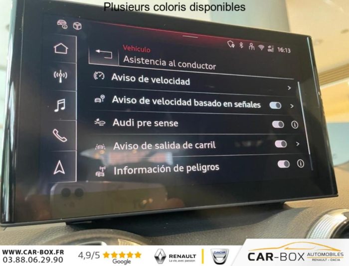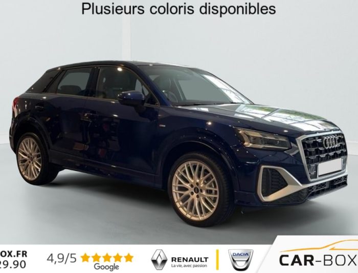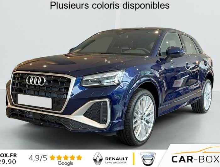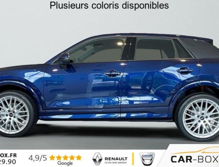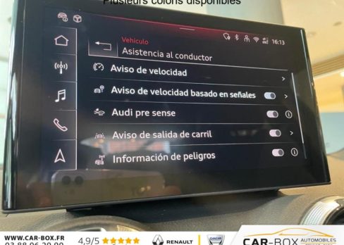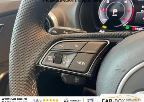 Hors frais de dossier35 TFSI 150 S tronic 7 S line, essence, bleu, 31/03/2026, freins à disques avant 15" et arrière 16", jantes alu 19" à 10 branches (U40), Jantes en aluminium Audi Sport Gmbh, 5 doubles branches design trapèzoidale, 7J x 18, MMI radio plus avec MMI touch réception radio de haute qualité, une réception radio numérique, un écran central tactile de 8, 8, sideblades gris manhattan, Boîtiers de rétroviseurs extérieurs laqués dans la teinte carrosserie, Système de lecture des panneaux de signalisation par caméra, Régulateur de vitesse, Sièges AV Sport, Volant en cuir style 3 branches avec multifonctions, Audi Smartphone Interface, Audi Sound System avec 10 HP, Réception radio numérique DAB, Sellerie mixte cuir/tissu, Audi Drive Select, Audi Hold Assist, Trousse de secours et triangle de présignalisation, Climatisation automatique 2 zones, Audi Virtual Cockpit, Airbags latéraux AV avec système d’airbags de tête, Rétroviseurs extérieurs réglables, dégivrants et rabattables électriquement, jour/nuit automatiques des deux côtés, Feux AR à LED, Direction progressive, Détecteur d?occupation de sièges, Audi pre sense front, Avertissement de sortie de voie, Set de réparation pour pneus, Appuis lombaires à 4 axes pour les sièges AV, Tapis de sol à l’AV et à l’AR, Pack Eclairage d’ambiance plus : Rétroéclairage de couleur sur le tableau de bord et sur le repose-genoux de la console centrale : option incluse (valeur : 270 Eur TTC), Pack assistance stationnement : Audi Parking System Plus Caméra de recul, Contrôle de pression de pneus, Audi connect Remote & Control (pour MMI Radio plus), Clé confort sans SAFELOCK, Moulures de seuil avec insert en aluminium et emblème S, éclairées, Applications intérieures en style aluminium, Pack intérieur S line tissu/cuir, Pack extérieur S line en peinture intégrale, Pédalier en acier inoxydable, Sièges AV à réglage manuel, Sécurité enfant électrique, Châssis standard, Clignotants dynamiques à l’AR, Pare-chocs en peinture intégrale, Phares Matrix LED avec clignotants dynamiques à l’AR, Ciel de pavillon en Tissu Noir, Rétroviseur intérieur jour/nuit automatique, Applications décoratives en Aluminium brossé mat