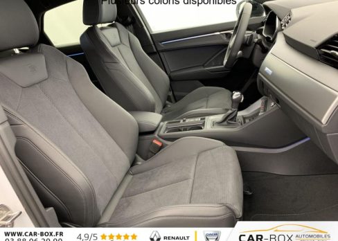 Audi phone box light (chargeur sans fil avec standard QI) : option incluse (valeur : 190 Eur TTC), Climatisation automatique confort 3 zones : option incluse (valeur : 350 Eur TTC), Interface Bluetooth, Pack Aluminium Intérieur, Réception radio numérique (DAB), Audi Sound System : option incluse (valeur : 330 Eur TTC), Caméra de recul, Audi Park Assist : option incluse (valeur : 110 Eur TTC), Audi Hold Assist, Appui lombaire à 4 axes pour les sièges AV: réglages électrique, horizontal et vertical, Applications décoratives en aluminium mat Brossé Foncé, Affichage de contrôle de pression des pneus, Audi Parking System Plus, Audi Smartphone Interface, Audi Connect Navigation et Divertissement Plus, Sièges AV sport, Détecteur de pluie et de luminosité, Jantes en aluminium coulé 20" Audi Sport 5 branches en V en étoile, finition titane mat, polies brillant, 8.5Jx20", pneus 255/40 R20 : option incluse (valeur : 2 500 Eur TTC), Volant cuir Sport multifonctions Plus 3 branches avec méplat et palettes de commande au volant, Boitiers de rétroviseurs extérieurs noir, Vitrage Privacy : lunette AR, vitres de portières AR et vitres latérales AR surteintées, Suppression d'identification moteur : option incluse (valeur : 0 Eur TTC), Pare-chocs S line dans une peinture intégrale (couleur de la carrosserie) : option incluse (valeur : 300 Eur TTC), Audi Drive Select, Suspensions Sport, Clé confort incluant déverrouillage du coffre par capteur (sans Safelock), Assistant de maintien de vitesse adaptatif : option incluse (valeur : 490 Eur TTC), Rétroviseur intérieur jour/nuit automatique sans encadrement, Sièges AV réglables manuellement Hauteur et positionnement en longueur, Inclinaison de dossier, Hauteur des appuie-tête et des ceintures, Fixation pour sièges enfants ISOFIX et Top Tether pour les sièges extérieurs AR, Kit réparation, Outillage de bord, Banquette AR avec porte-gobelet dans l'accoudoir de la place centrale, Hayon de coffre à ouverture et fermeture électrique, Interface USB pour chargement d'appareils externes, Audi Virtual cockpit plus, Accoudoir central coulissant en longueur, avec inclinaison réglable et vide-poches relevable, Phares Matrix LED avec clignotants dynamiques AR : option incluse (valeur : 800 Eur TTC), Pare-brise en verre acoustique avec verre feuilleté athermique, Rétroviseurs extérieurs réglables, dégivrants, rabattables électriquement avec fonction rabat automatique côté passager AV, marche AR enclenchée) et fonction jour/nuit automatique des 2 côtés : option incluse (valeur : 80 Eur TTC), 2 prises USB AR (type-C) et prise 12V dans la console centrale AR, Avertisseur de franchissement de ligne et avertisseur de changement de voie, MMI Navigation plus avec MMI touch, Peinture métallisée : option incluse (valeur : 900 Eur TTC), Audi Pre Sense front Détecte la zone située devant le véhicule et avertit le conducteur par des signaux visuels et sonores en cas de potentielle situation dangereuse avec des véhicules qui précèdent ou qui sont arrêtés. Le système avertit alors le conducteur par un signal sonore et visuel. Simultanément, le système prépare un éventuel freinage complet, et engage un freinage d'urgence automatisé, dans le cas où celui-ci s'avérerait nécessaire, Audi Pre Sense Basic Déploie automatiquement, lorsque nécessaire, des mesures préventives pour votre sécurité et celle de vos passagers, parmi lesquelles: Resserrement des ceintures de sécurité à l'avant afin de limiter tout déplacement des passagers vers l'avant ou les côtés, Activation des feux de détresse clignotants, Sellerie Cuir/matériaux synthétiques Monopur 550 style Dinamica Fréquence : option incluse (valeur : 450 Eur TTC), Détection de signalisation routière par caméra, Accoudoirs des contre-portes en matériaux synthétiques monopur 550, Pack Eclairage d'ambiance plus : Eclairage dans la zone des pieds AV/AR Eclairage du porte-boissons AV Eclairage du compartiment de rangement sous le tableau de bord Choix parmi 30 couleurs Eclairage des seuils de portières AV Eclairage d'ambiance latéral de la console centrale AV Miroirs de courtoisie éclairés pour conducteur et passager AV Inscription éclairée sur le tableau de bord passager AV (anneaux Audi), Pack Rangement : Prise 12V dans le coffre Filet de rangement au dos des sièges AV Filet de coffre Insert de coffre dans les garnitures latérales Eclairage LED dans le coffre Bac de rangement sous siège passager : option incluse (valeur : 240 Eur TTC), Pack S line extérieur : Diffuseur en Noir Titane mat Pare-chocs S line dans une peinture contrastée (Gris Manhattan) Lamelles en Argent Aluminium mat Encadrement des prises d'air latérales AV en Gris Platine mat Becquet AV en peinture intégrale (couleur de la carrosserie) avec lame Gris Platine mat Grille de diffuseur Noir mat grenue Châssis Sport Emblème S line sur les ailes extérieures Barrette du diffuseur noir titane mat Calandre en noir titane, lames intérieures grises Moulures de seuil avec insert en aluminium à l'AV, éclairées, avec inscription S Protection du seuil de chargement en acier inoxydable Enjoliveurs de passage de roue et extensions de bas de caisse en peinture contrastée, Pack S line intérieur : Pédalier et repose-pieds en acier inoxydable Sièges AV sport Frein à main avec surpiqûres contrastées, couleur assortie à celle de l'habitacle Estampillage S line sur le dossier des sièges AV Surfaces d'accentuation sur la console centrale et poignées intérieures de portières AV couleur laque fine gris ardoise Sellerie en Tissu/matériaux synthétiques mono pur 550, Pack Esthétique Noir plus : Pare-chocs AV/AR Noirs Entourage des vitres latérales avec des baguettes enjoliveuses Noir Calandre Singleframe Noire Lames intérieurs de la calandre Singleframe nid d'abeille noires au lieu de grises Anneaux Audi et monogrammes en Noir Brillant, Sièges AV chauffants : option incluse (valeur : 38