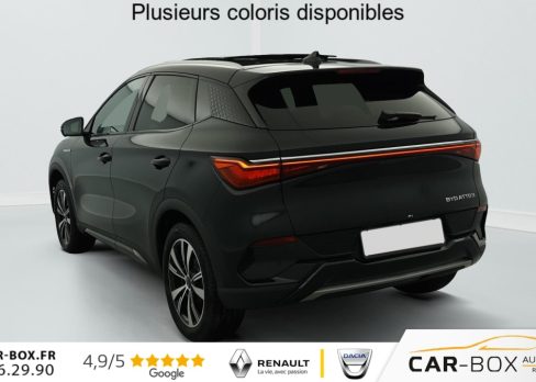 Câbles d'alimentation charge domestique & rapide : option incluse (valeur : 0 Eur TTC), Hayon électrique, Jantes en alliage 18", Phares à LED, Phares à allumage automatique, Feux AR à LED, Feux de jour à LED, Eclairage d'accompagnement, Assistance feux de route, Eclairages de sol dans les rétroviseurs extérieurs, Tablette AR du coffre, Sortie électrique 12 V, Sellerie en similicuir vegan (Noir) : option incluse (valeur : 0 Eur TTC), Siège du conducteur avec réglage électrique dans 6 directions, Siège du passager AV avec réglage électrique dans 4 directions, Sièges AV chauffants, Sièges AR rabattables séparément - 40:60, Appuie-tête central des sièges AR, 2 x port de charge USB AV (1 x Type A, 1 x Type C), 2 x port de charge USB AR (1 x Type A, 1 x Type C), Lampe de lecture à LED AV, Lampe de lecture à LED latérale AR, Eclairage d'ambiance rythme multicolore (Poignée de porte), Eclairage d'ambiance rythme multicolore (Panneau de porte et tablette), 4 x lève-vitre à impulsion avec fonction anti-pincement, Rétroviseur à atténuation automatique, Tableau de bord TFT 5" tout LCD, Radio DAB et Radio FM, Ecran tactile rotatif électrique 15,6", Système audio à 8 HP, Airbag conducteur, Airbag passager AV avec contacteur de désactivation, Airbag central AV, Airbag latéral AV, Airbag rideau latéral AV, Détection d'angle mort (BSD), Programme électronique de stabilité (ESP), Frein de stationnement intégré (IPB), Système antipatinage (TCS), Distribution électronique de la force de freinage (EBD), Arrêt confort (CST), Contrôle de descente en pente (HDC), Système de frein de stationnement électrique (EPB), Maintien automatique du véhicule (AVH), Avertissement d'ouverture de porte (DOW), Régulateur de vitesse adaptatif (ACC) et régulateur de vitesse intelligent (ICC), Informations intelligentes de limite de vitesse (ISLI) et Contrôle intelligent de limite de vitesse, Reconnaissance des panneaux de signalisation (TSR), Système de freinage anti-blocage (ABS), Avertissement de collision AV (FCW), Freinage d'urgence automatique (AEB), Avertissement de collision AR (RCW), Alerte de trafic transversal AR (RCTA) et Freinage en cas de trafic transversal AR (RCTB), Assistance au maintien sur la voie (LKA), Assistance au changement de voie (LCA), Maintien d'urgence dans la voie (ELK), Verrouillage de sécurité enfant mécanique, Système d'appel d'urgence E-Call, Fonction Véhicule à chargement (V2L), Entrée sans clé et démarrage sans clé, Pompe à chaleur, Chargeur embarqué 11 kW (OBC), Siège conducteur avec appuie-tête intégré, Siège passager AV avec appuie-tête intégré, Peinture métallisée : option incluse (valeur : 750 Eur TTC), Volant multifonction similicuir vegan, Climatisation automatique, Apple CarPlay / Android Auto, Toit ouvrant panoramique en verre avec fonction anti-pincement, avec pare-soleil à réglage électrique, Rétroviseurs extérieurs réglables électriquement, rabattables électriquement, chauffants, Eclairage de coffre, Eclairages de sol de siège AV, Pare-soleil AV avec éclairage du miroir, Commande vocale intelligente - "Hi, BYD", ISOFIX et i-Size, siège passager AV et sièges AR externes, Système de surveillance de la pression des pneus (TPMS), Radars de stationnement AR, Navigation, Cloud service - BYD APP, 2 x clé intelligente, Eclairages de portes AV à LED, Sièges AV ventilés, Boîte à gants éclairé, Eclairage de la console centrale, Accoudoir central avec double porte-gobelet, AV et AR, Modes de conduite : Eco, Normal, Sport, Radars de stationnement AV, Pneus 235/50 R18, Caméra de vue à 360°