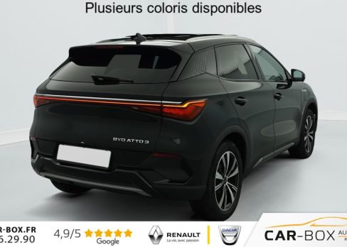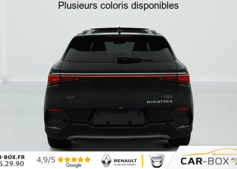 Hors frais de dossier60 5 kWh 204 ch Design, électrique, gris, 30/09/2025, Câbles d’alimentation charge domestique & rapide : option incluse (valeur : 0 Eur TTC), Hayon électrique, Jantes en alliage 18", Phares à LED, Phares à allumage automatique, Feux AR à LED, Feux de jour à LED, Eclairage d’accompagnement, Assistance feux de route, Eclairages de sol dans les rétroviseurs extérieurs, Tablette AR du coffre, Sortie électrique 12 V, Sellerie en similicuir vegan (Noir) : option incluse (valeur : 0 Eur TTC), Siège du conducteur avec réglage électrique dans 6 directions, Siège du passager AV avec réglage électrique dans 4 directions, Sièges AV chauffants, Sièges AR rabattables séparément – 40:60, Appuie-tête central des sièges AR, 2 x port de charge USB AV (1 x Type A, 1 x Type C), 2 x port de charge USB AR (1 x Type A, 1 x Type C), Lampe de lecture à LED AV, Lampe de lecture à LED latérale AR, Eclairage d’ambiance rythme multicolore (Poignée de porte), Eclairage d’ambiance rythme multicolore (Panneau de porte et tablette), 4 x lève-vitre à impulsion avec fonction anti-pincement, Rétroviseur à atténuation automatique, Tableau de bord TFT 5" tout LCD, Radio DAB et Radio FM, Ecran tactile rotatif électrique 15, 6", Système audio à 8 HP, Airbag conducteur, Airbag passager AV avec contacteur de désactivation, Airbag central AV, Airbag latéral AV, Airbag rideau latéral AV, Détection d’angle mort (BSD), Programme électronique de stabilité (ESP), Frein de stationnement intégré (IPB), Système antipatinage (TCS), Distribution électronique de la force de freinage (EBD), Arrêt confort (CST), Contrôle de descente en pente (HDC), Système de frein de stationnement électrique (EPB), Maintien automatique du véhicule (AVH), Avertissement d’ouverture de porte (DOW), Régulateur de vitesse adaptatif (ACC) et régulateur de vitesse intelligent (ICC), Informations intelligentes de limite de vitesse (ISLI) et Contrôle intelligent de limite de vitesse, Reconnaissance des panneaux de signalisation (TSR), Système de freinage anti-blocage (ABS), Avertissement de collision AV (FCW), Freinage d’urgence automatique (AEB), Avertissement de collision AR (RCW), Alerte de trafic transversal AR (RCTA) et Freinage en cas de trafic transversal AR (RCTB), Assistance au maintien sur la voie (LKA), Assistance au changement de voie (LCA), Maintien d’urgence dans la voie (ELK), Verrouillage de sécurité enfant mécanique, Système d’appel d’urgence E-Call, Fonction Véhicule à chargement (V2L), Entrée sans clé et démarrage sans clé, Pompe à chaleur, Chargeur embarqué 11 kW (OBC), Siège conducteur avec appuie-tête intégré, Siège passager AV avec appuie-tête intégré, Peinture métallisée : option incluse (valeur : 750 Eur TTC), Volant multifonction similicuir vegan, Climatisation automatique, Apple CarPlay / Android Auto, Toit ouvrant panoramique en verre avec fonction anti-pincement, avec pare-soleil à réglage électrique, Rétroviseurs extérieurs réglables électriquement, rabattables électriquement, chauffants, Eclairage de coffre, Eclairages de sol de siège AV, Pare-soleil AV avec éclairage du miroir, Commande vocale intelligente – "Hi, BYD", ISOFIX et i-Size, siège passager AV et sièges AR externes, Système de surveillance de la pression des pneus (TPMS), Radars de stationnement AR, Navigation, Cloud service – BYD APP, 2 x clé intelligente, Eclairages de portes AV à LED, Sièges AV ventilés, Boîte à gants éclairé, Eclairage de la console centrale, Accoudoir central avec double porte-gobelet, AV et AR, Modes de conduite : Eco, Normal, Sport, Radars de stationnement AV, Pneus 235/50 R18, Caméra de vue à 360°