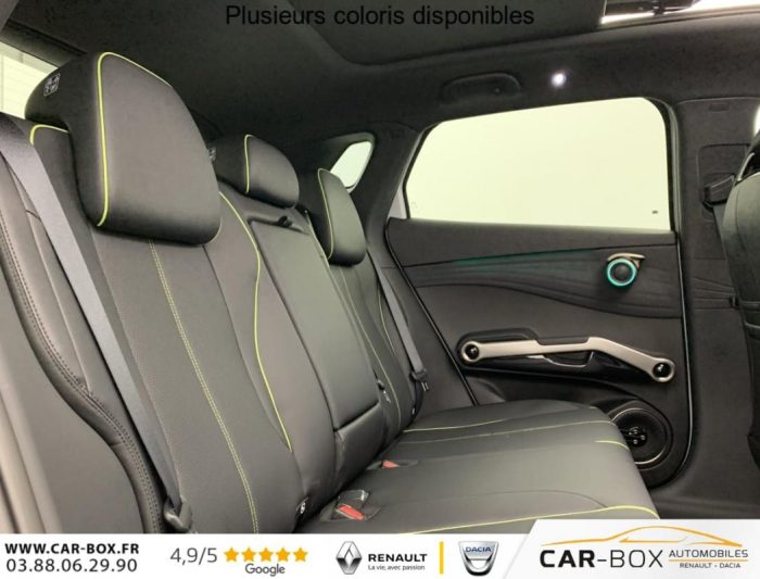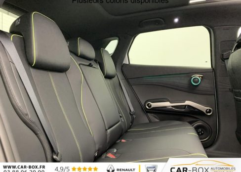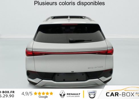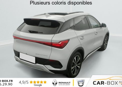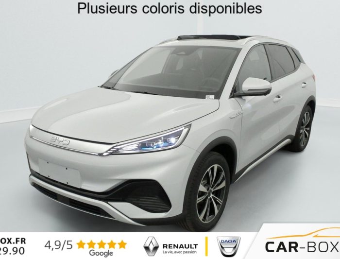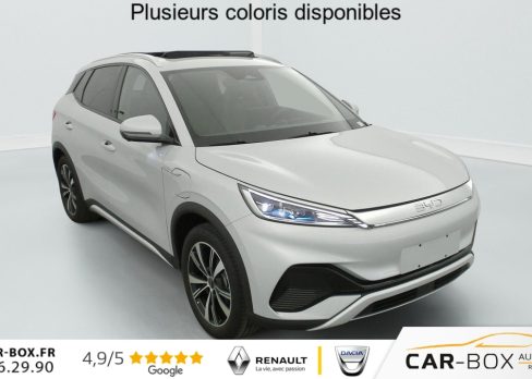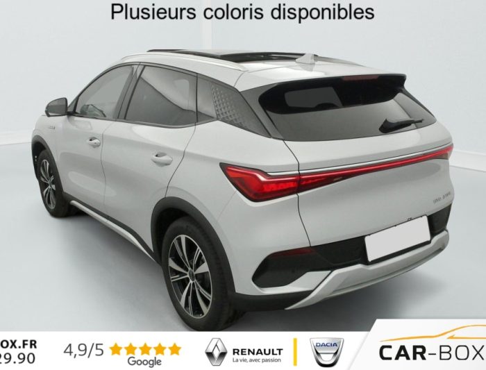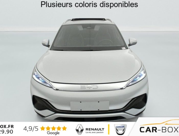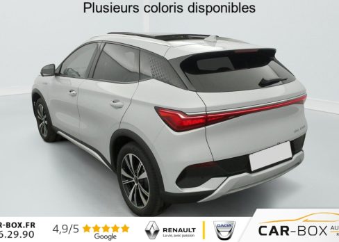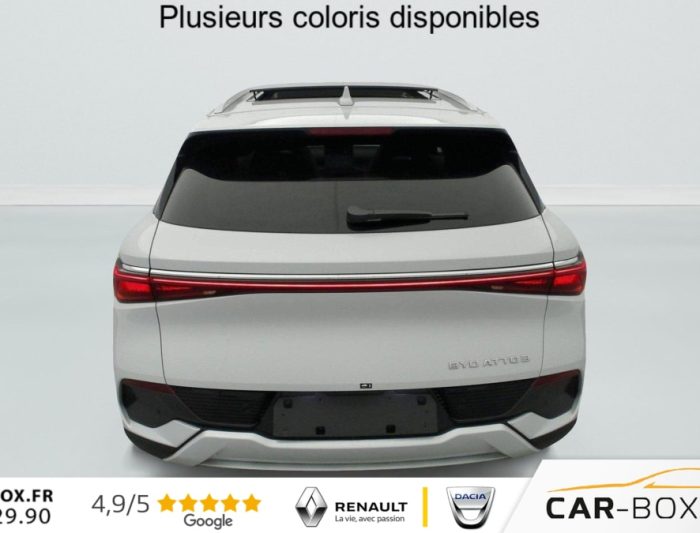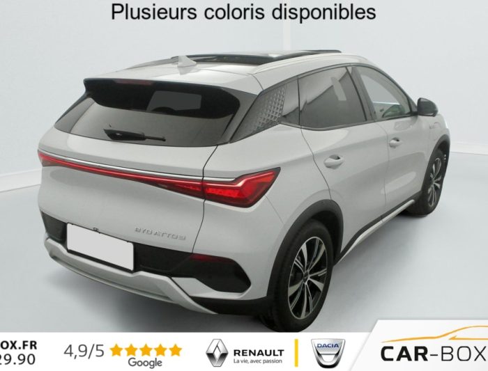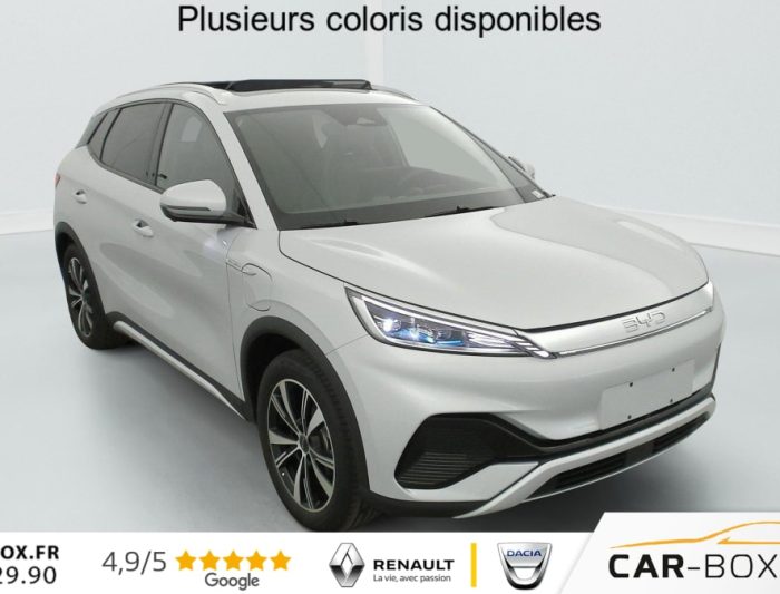Hayon électrique, Jantes en alliage 18", Phares à LED, Phares à allumage automatique, Feux AR à LED, Feux de jour à LED, Eclairage d'accompagnement, Assistance feux de route, Eclairages de sol dans les rétroviseurs extérieurs, Tablette AR du coffre, Sortie électrique 12 V, Sellerie en similicuir vegan (Noir) : option incluse (valeur : 0 Eur TTC), Siège du conducteur avec réglage électrique dans 6 directions, Siège du passager AV avec réglage électrique dans 4 directions, Sièges AV chauffants, Sièges AR rabattables séparément - 40:60, Appuie-tête central des sièges AR, 2 x port de charge USB AV (1 x Type A, 1 x Type C), 2 x port de charge USB AR (1 x Type A, 1 x Type C), Lampe de lecture à LED AV, Lampe de lecture à LED latérale AR, Eclairage d'ambiance rythme multicolore (Poignée de porte), Eclairage d'ambiance rythme multicolore (Panneau de porte et tablette), 4 x lève-vitre à impulsion avec fonction anti-pincement, Rétroviseur à atténuation automatique, Tableau de bord TFT 5" tout LCD, Charge sans fil de smartphone, Radio DAB et Radio FM, Ecran tactile rotatif électrique 15,6", Système audio à 8 HP, Airbag conducteur, Airbag passager AV avec contacteur de désactivation, Airbag central AV, Airbag latéral AV, Airbag rideau latéral AV, Détection d'angle mort (BSD), Programme électronique de stabilité (ESP), Frein de stationnement intégré (IPB), Système antipatinage (TCS), Distribution électronique de la force de freinage (EBD), Arrêt confort (CST), Contrôle de descente en pente (HDC), Système de frein de stationnement électrique (EPB), Maintien automatique du véhicule (AVH), Avertissement d'ouverture de porte (DOW), Régulateur de vitesse adaptatif (ACC) et régulateur de vitesse intelligent (ICC), Informations intelligentes de limite de vitesse (ISLI) et Contrôle intelligent de limite de vitesse, Reconnaissance des panneaux de signalisation (TSR), Système de freinage anti-blocage (ABS), Avertissement de collision AV (FCW), Freinage d'urgence automatique (AEB), Avertissement de collision AR (RCW), Alerte de trafic transversal AR (RCTA) et Freinage en cas de trafic transversal AR (RCTB), Assistance au maintien sur la voie (LKA), Assistance au changement de voie (LCA), Maintien d'urgence dans la voie (ELK), Verrouillage de sécurité enfant mécanique, Système d'appel d'urgence E-Call, Fonction Véhicule à chargement (V2L), Entrée sans clé et démarrage sans clé, Pompe à chaleur, Chargeur embarqué 11 kW (OBC), Siège conducteur avec appuie-tête intégré, Siège passager AV avec appuie-tête intégré, Peinture métallisée : option incluse (valeur : 750 Eur TTC), Volant multifonction similicuir vegan, 360° caméra, Apple CarPlay / Android Auto, Toit ouvrant panoramique avec fonction anti-pincement, avec pare-soleil à réglage électrique, Rétroviseurs extérieurs réglables électriquement, rabattables électriquement, chauffants, Eclairage de coffre, Eclairages de sol de siège AV, Pare-soleil AV avec éclairage du miroir, Commande vocale intelligente - "Hi, BYD", ISOFIX et i-Size, siège passager AV et sièges AR externes, Système de surveillance de la pression des pneus (TPMS), Radars de stationnement AR, Navigation, Cloud service - BYD APP, 2 x clé intelligente, Eclairages de portes AV à LED, Boîte à gants éclairé, Eclairage de la console centrale, Accoudoir central avec double porte-gobelet, AV et AR, Modes de conduite : Eco, Normal, Sport, Radars de stationnement AV, Toit panoramique en verre, Pneus 235/50 R18