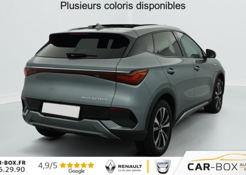 Hayon électrique, Jantes en alliage 18", Phares à LED, Phares à allumage automatique, Feux AR à LED, Feux de jour à LED, Eclairage d'accompagnement, Assistance feux de route, Eclairages de sol dans les rétroviseurs extérieurs, Tablette AR du coffre, Sortie électrique 12 V, Sellerie en similicuir vegan (Bleu & Gris) : option incluse (valeur : 0 Eur TTC), Siège du conducteur avec réglage électrique dans 6 directions, Siège du passager AV avec réglage électrique dans 4 directions, Sièges AV chauffants, Sièges AR rabattables séparément - 40:60, Appuie-tête central des sièges AR, 2 x port de charge USB AV (1 x Type A, 1 x Type C), 2 x port de charge USB AR (1 x Type A, 1 x Type C), Lampe de lecture à LED AV, Lampe de lecture à LED latérale AR, Eclairage d'ambiance rythme multicolore (Poignée de porte), Eclairage d'ambiance rythme multicolore (Panneau de porte et tablette), 4 x lève-vitre à impulsion avec fonction anti-pincement, Rétroviseur à atténuation automatique, Tableau de bord TFT 5" tout LCD, Charge sans fil de smartphone, Radio DAB et Radio FM, Ecran tactile rotatif électrique 15,6", Système audio à 8 HP, Airbag conducteur, Airbag passager AV avec contacteur de désactivation, Airbag central AV, Airbag latéral AV, Airbag rideau latéral AV, Détection d'angle mort (BSD), Programme électronique de stabilité (ESP), Frein de stationnement intégré (IPB), Système antipatinage (TCS), Distribution électronique de la force de freinage (EBD), Arrêt confort (CST), Contrôle de descente en pente (HDC), Système de frein de stationnement électrique (EPB), Maintien automatique du véhicule (AVH), Avertissement d'ouverture de porte (DOW), Régulateur de vitesse adaptatif (ACC) et régulateur de vitesse intelligent (ICC), Informations intelligentes de limite de vitesse (ISLI) et Contrôle intelligent de limite de vitesse, Reconnaissance des panneaux de signalisation (TSR), Système de freinage anti-blocage (ABS), Avertissement de collision AV (FCW), Freinage d'urgence automatique (AEB), Avertissement de collision AR (RCW), Alerte de trafic transversal AR (RCTA) et Freinage en cas de trafic transversal AR (RCTB), Assistance au maintien sur la voie (LKA), Assistance au changement de voie (LCA), Maintien d'urgence dans la voie (ELK), Verrouillage de sécurité enfant mécanique, Système d'appel d'urgence E-Call, Fonction Véhicule à chargement (V2L), Entrée sans clé et démarrage sans clé, Pompe à chaleur, Chargeur embarqué 11 kW (OBC), Siège conducteur avec appuie-tête intégré, Siège passager AV avec appuie-tête intégré, Peinture métallisée : option incluse (valeur : 750 Eur TTC), Volant multifonction similicuir vegan, 360° caméra, Apple CarPlay / Android Auto, Toit ouvrant panoramique avec fonction anti-pincement, avec pare-soleil à réglage électrique, Rétroviseurs extérieurs réglables électriquement, rabattables électriquement, chauffants, Eclairage de coffre, Eclairages de sol de siège AV, Pare-soleil AV avec éclairage du miroir, Commande vocale intelligente - "Hi, BYD", ISOFIX et i-Size, siège passager AV et sièges AR externes, Système de surveillance de la pression des pneus (TPMS), Radars de stationnement AR, Navigation, Cloud service - BYD APP, 2 x clé intelligente, Eclairages de portes AV à LED, Boîte à gants éclairé, Eclairage de la console centrale, Accoudoir central avec double porte-gobelet, AV et AR, Modes de conduite : Eco, Normal, Sport, Radars de stationnement AV, Toit panoramique en verre, Pneus 235/50 R18
