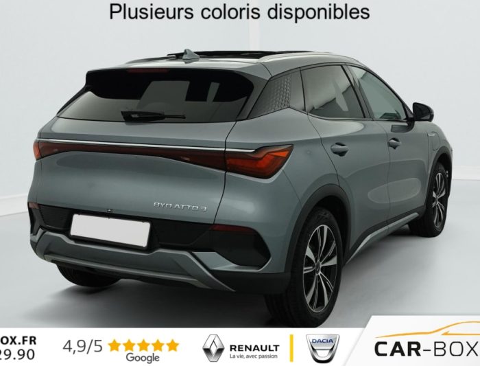 Hors frais de dossier60 5 kWh 204 ch Design, électrique, gris, 29/09/2025, Hayon électrique, Jantes en alliage 18", Phares à LED, Phares à allumage automatique, Feux AR à LED, Feux de jour à LED, Eclairage d’accompagnement, Assistance feux de route, Eclairages de sol dans les rétroviseurs extérieurs, Tablette AR du coffre, Sortie électrique 12 V, Sellerie en similicuir vegan (Bleu & Gris) : option incluse (valeur : 0 Eur TTC), Siège du conducteur avec réglage électrique dans 6 directions, Siège du passager AV avec réglage électrique dans 4 directions, Sièges AV chauffants, Sièges AR rabattables séparément – 40:60, Appuie-tête central des sièges AR, 2 x port de charge USB AV (1 x Type A, 1 x Type C), 2 x port de charge USB AR (1 x Type A, 1 x Type C), Lampe de lecture à LED AV, Lampe de lecture à LED latérale AR, Eclairage d’ambiance rythme multicolore (Poignée de porte), Eclairage d’ambiance rythme multicolore (Panneau de porte et tablette), 4 x lève-vitre à impulsion avec fonction anti-pincement, Rétroviseur à atténuation automatique, Tableau de bord TFT 5" tout LCD, Charge sans fil de smartphone, Radio DAB et Radio FM, Ecran tactile rotatif électrique 15, 6", Système audio à 8 HP, Airbag conducteur, Airbag passager AV avec contacteur de désactivation, Airbag central AV, Airbag latéral AV, Airbag rideau latéral AV, Détection d’angle mort (BSD), Programme électronique de stabilité (ESP), Frein de stationnement intégré (IPB), Système antipatinage (TCS), Distribution électronique de la force de freinage (EBD), Arrêt confort (CST), Contrôle de descente en pente (HDC), Système de frein de stationnement électrique (EPB), Maintien automatique du véhicule (AVH), Avertissement d’ouverture de porte (DOW), Régulateur de vitesse adaptatif (ACC) et régulateur de vitesse intelligent (ICC), Informations intelligentes de limite de vitesse (ISLI) et Contrôle intelligent de limite de vitesse, Reconnaissance des panneaux de signalisation (TSR), Système de freinage anti-blocage (ABS), Avertissement de collision AV (FCW), Freinage d’urgence automatique (AEB), Avertissement de collision AR (RCW), Alerte de trafic transversal AR (RCTA) et Freinage en cas de trafic transversal AR (RCTB), Assistance au maintien sur la voie (LKA), Assistance au changement de voie (LCA), Maintien d’urgence dans la voie (ELK), Verrouillage de sécurité enfant mécanique, Système d’appel d’urgence E-Call, Fonction Véhicule à chargement (V2L), Entrée sans clé et démarrage sans clé, Pompe à chaleur, Chargeur embarqué 11 kW (OBC), Siège conducteur avec appuie-tête intégré, Siège passager AV avec appuie-tête intégré, Peinture métallisée : option incluse (valeur : 750 Eur TTC), Volant multifonction similicuir vegan, 360° caméra, Apple CarPlay / Android Auto, Toit ouvrant panoramique avec fonction anti-pincement, avec pare-soleil à réglage électrique, Rétroviseurs extérieurs réglables électriquement, rabattables électriquement, chauffants, Eclairage de coffre, Eclairages de sol de siège AV, Pare-soleil AV avec éclairage du miroir, Commande vocale intelligente – "Hi, BYD", ISOFIX et i-Size, siège passager AV et sièges AR externes, Système de surveillance de la pression des pneus (TPMS), Radars de stationnement AR, Navigation, Cloud service – BYD APP, 2 x clé intelligente, Eclairages de portes AV à LED, Boîte à gants éclairé, Eclairage de la console centrale, Accoudoir central avec double porte-gobelet, AV et AR, Modes de conduite : Eco, Normal, Sport, Radars de stationnement AV, Toit panoramique en verre, Pneus 235/50 R18