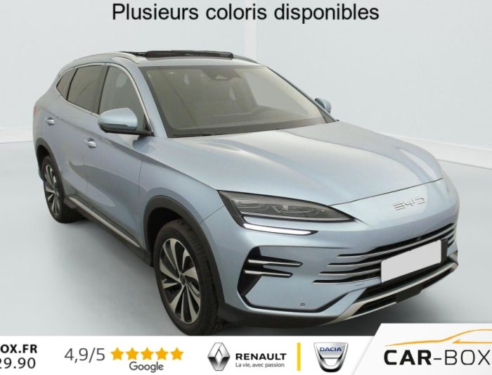 Câbles d'alimentation charge domestique & rapide : option incluse (valeur : 0 Eur TTC), 113 km d'autonomie 100% électrique en ville (EAER City) : option incluse (valeur : 0 Eur TTC), Hayon électrique, Barres de toit en aluminium, Feux AR à LED, Feux de jour à LED, Eclairages de sol dans les rétroviseurs extérieurs, Tablette AR du coffre, Sortie électrique 12 V, Sièges en similicuir vegan (Noir) : option incluse (valeur : 0 Eur TTC), Sièges AR rabattables séparément - 40:60, Lampe de lecture à LED AV, Lampe de lecture à LED latérale AR, 4 x lève-vitre à impulsion avec fonction anti-pincement, Rétroviseur à atténuation automatique, Filtre à air PM2.5, Système de purification d'air PM2.5, Ecran tactile rotatif électrique 15,6", Airbag conducteur, Airbag passager AV avec contacteur de désactivation, Airbag central AV, Airbag latéral AV, Détection d'angle mort (BSD), Système antipatinage (TCS), Distribution électronique de la force de freinage (EBD), Arrêt confort (CST), Contrôle de descente en pente (HDC), Avertissement d'ouverture de porte (DOW), Régulateur de vitesse adaptatif (ACC) et régulateur de vitesse intelligent (ICC), Reconnaissance des panneaux de signalisation (TSR), Avertissement de collision AV (FCW), Freinage d'urgence automatique (AEB), Avertissement de collision AR (RCW), Assistance au maintien sur la voie (LKA), Assistance au changement de voie (LCA), Verrouillage de sécurité enfant mécanique, Chargeur embarqué 11 kW (OBC), Phares à LED avec allumage/extinction automatique, Eclairage d'accueil dynamique, Siège conducteur avec appuie-tête intégré, Siège passager AV avec ventilation et chauffage, Siège passager AV avec appuie-tête intégré, Tableau de bord LCD 12,3" tout TFT, Affichage tête haute (HUD), Système de verrouillage automatique, Système antivol, Avertissement de sortie de voie (LDW), Peinture métallisée : option incluse (valeur : 1 100 Eur TTC), Assistance hydraulique au freinage (HBA), Volant multifonction similicuir vegan, Contrôle de la dynamique du véhicule (VDC), Contrôle de maintien en côte (HHC), Décélération contrôlée pour frein de stationnement (CDP), Feux antibrouillard AR, Eclairage d'accompagnement (fonction d'allumage anticipé et d'extinction différée des phares), Caméra à 360°, Frein de stationnement électronique (EPB), Alerte de trafic transversal AV (FCTA) et freinage en cas de trafic transversal AV (FCTB), Alerte de trafic transversal AR (RCTA) et freinage en cas de trafic transversal AR (RCTB), Apple CarPlay / Android Auto, Assistance feux de route (HMA), Toit ouvrant panoramique avec fonction anti-pincement, avec pare-soleil à réglage électrique, Jantes en alliage 19" bicolores avec pneus 235/50 R19, Rétroviseurs extérieurs réglables électriquement, rabattables électriquement, chauffants, Pare-brise AV, protection anti-UV, isolation thermique, insonorisation, Pare-brise AV, essuie-glaces a détection de pluie, Vitres AR et lunette AR, vitrage surteinté, Volant chauffant, Siège conducteur, réglable électriquement, 8 directions, mémoire de position, Siège conducteur, ventilé, chauffant, réglage mémorisé, Siège passager AV réglable éclectriquement, 4 directions, Sièges AR, appuie-tête réglable manuellement, Eclairage ambiant, multicolore, réagissant au rythme, Eclairages de sol de siège AV, Eclairages de porte AV à LED, Pare-soleil AV avec éclairage du miroir, Bouches d'aération AR, Accoudoir central AV, 2 porte-gobelet, Accoudoir AR, 2 porte-gobelet, DAB+ & FM, Système audio Infinity à 10 HP, Commande vocale intelligente - "Hi, BYD", Connectivité 4G embarquée, Service Cloud - Appli BYD, Ports USB AV, 1 x 18 W type C, 1 x 60 W type C, Ports USB AR, 2 x 18 W type C, Charge sans fil de smartphone, Airbags rideaux, Ceinture de sécurité AV avec prétensionneur et limiteur de force, Ceinture de sécurité à limitation de force de siége AR Médian, ISOFIX et i-Size, siège passager AV et sièges AR externes, Système de surveillance de la pression des pneus (TPMS), Détection de présence d'enfant (CPD), Appel d'urgence, Modes de conduite : Eco, Normal, Sport, Neige, 2 x clé intelligente, Accès et démarrage sans clé, Radars de stationnement AR, Détection de la fatigue du conducteur (DFM) indirecte, Régulateur de limite de vitesse intelligent (ISLC), Assistance dŽurgence au maintien dans la voie (ELKA), Avertissement prédictif de collision (PCW), Assistance à la sortie de voie (LDA), Prévention de sortie de voie (LDP), Fonction Auto Hold du freinage, Servo-frein hydraulique (HBB), Système de contrôle anti-renversement (RMI), Système de priorité au freinage sur les pédales (BOS), Radars de stationnement AV, Fonction Véhicule à chargement (V2L)
