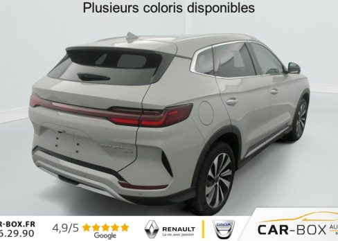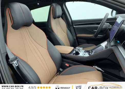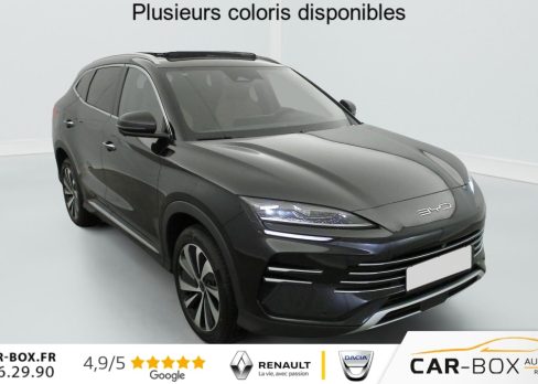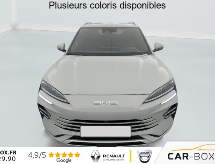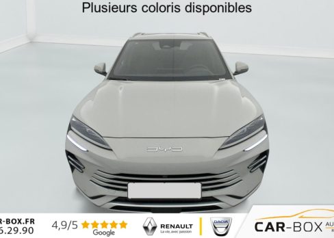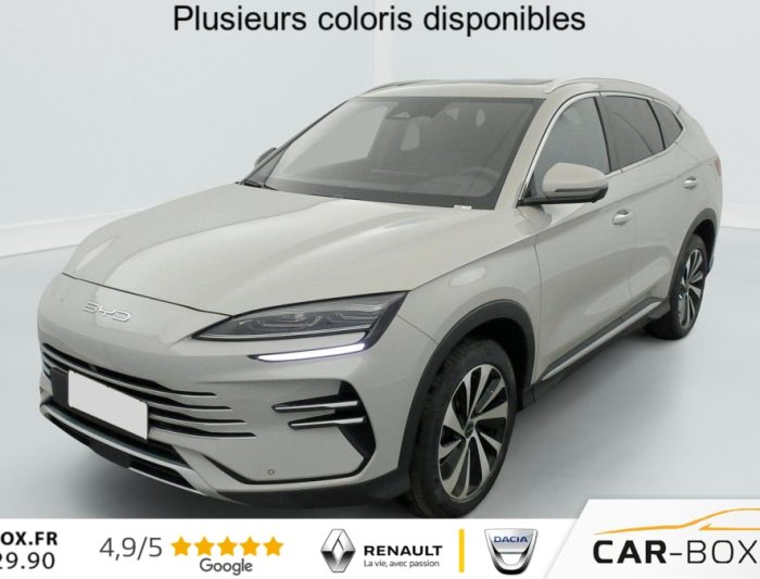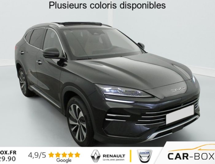 Câbles d'alimentation charge domestique & rapide : option incluse (valeur : 0 Eur TTC), Sellerie similicuir vegan (Black & Brown) : option incluse (valeur : 0 Eur TTC), 125 km d'autonomie 100% électrique (cycle mixte WLTP) avec une autonomie totale de plus de 1100 km 177 km d'autonomie 100% électrique en ville (EAER City) : option incluse (valeur : 0 Eur TTC), Hayon électrique, Barres de toit en aluminium, Feux AR à LED, Feux de jour à LED, Eclairages de sol par les rétroviseurs extérieurs, Tablette AR du coffre, Sortie électrique 12V, Sièges AR rabattables séparément - 40:60, Lampe de lecture à LED AV, Lampe de lecture à LED latérale AR, 4 x lève-vitre à impulsion avec fonction anti-pincement, Rétroviseur à atténuation automatique, Ecran tactile rotatif électrique 15,6", Airbag conducteur, Airbag passager AV avec contacteur de désactivation, Airbag central AV, Airbag latéral AV, Détection d'angle mort (BSD), Système antipatinage (TCS), Distribution électronique de la force de freinage (EBD), Arrêt confort (CST), Contrôle de descente en pente (HDC), Avertissement d'ouverture de porte (DOW), Régulateur de vitesse adaptatif (ACC) et régulateur de vitesse intelligent (ICC), Reconnaissance des panneaux de signalisation (TSR), Avertissement de collision AV (FCW), Freinage d'urgence automatique (AEB), Avertissement de collision AR (RCW), Assistance au maintien sur la voie (LKA), Assistance au changement de voie (LCA), Verrouillage de sécurité enfant mécanique, Chargeur embarqué 11 kW (OBC), Phares à LED avec allumage/extinction automatique, Eclairage d'accueil dynamique, Siège conducteur avec appuie-tête intégré, Siège passager AV avec ventilation et chauffage, Siège passager AV avec appuie-tête intégré, Tableau de bord LCD 12,3" tout TFT, Affichage tête haute (HUD), Système de verrouillage automatique, Système antivol, Avertissement de sortie de voie (LDW), Peinture métallisée : option incluse (valeur : 1 100 Eur TTC), Assistance hydraulique au freinage (HBA), Volant multifonction similicuir vegan, Contrôle de la dynamique du véhicule (VDC), Contrôle de maintien en côte (HHC), Décélération contrôlée pour frein de stationnement (CDP), Feux antibrouillard AR, Eclairage d'accompagnement (fonction d'allumage anticipé et d'extinction différée des phares), Caméra à 360°, Frein de stationnement électronique (EPB), Alerte de trafic transversal AV (FCTA) et freinage en cas de trafic transversal AV (FCTB), Alerte de trafic transversal AR (RCTA) et freinage en cas de trafic transversal AR (RCTB), Apple CarPlay / Android Auto, Assistance feux de route (HMA), Toit ouvrant panoramique avec fonction anti-pincement, avec pare-soleil à réglage électrique, Jantes en alliage 19" bicolores avec pneus 235/50 R19, Rétroviseurs extérieurs réglables électriquement, rabattables électriquement, chauffants, Pare-brise AV, protection anti-UV, isolation thermique, insonorisation, Pare-brise AV, essuie-glaces a détection de pluie, Vitres AR et lunette AR, vitrage surteinté, Volant chauffant, Siège conducteur, réglable électriquement, 8 directions, mémoire de position, Siège conducteur, ventilé, chauffant, réglage mémorisé, Siège passager AV réglable éclectriquement, 4 directions, Sièges AR, appuie-tête réglable manuellement, Eclairage ambiant, multicolore, réagissant au rythme, Eclairages de sol de siège AV, Eclairages de porte AV à LED, Pare-soleil AV avec éclairage du miroir, Bouches d'aération AR, Accoudoir central AV, 2 porte-gobelet, Accoudoir AR, 2 porte-gobelets, DAB+ & FM, Système audio Infinity à 10 HP, Commande vocale intelligente - "Hi, BYD", Service Cloud - Appli BYD, Ports USB AV, 1 x 18 W type C, 1 x 60 W type C, Ports USB AR, 2 x 18 W type C, Charge sans fil de smartphone 2x15W, Airbags rideaux, Ceinture de sécurité AV avec prétensionneur et limiteur de force, Ceinture de sécurité à limitation de force de siége AR Médian, ISOFIX et i-Size, siège passager AV et sièges AR externes, Système de surveillance de la pression des pneus (TPMS), Détection de présence d'enfant (CPD), Appel d'urgence, Modes de conduite : Eco, Normal, Sport, Neige, 2 x clé intelligente, Accès et démarrage sans clé, Radars de stationnement AV/AR, Détection de la fatigue du conducteur (DFM) indirecte, Régulateur de limite de vitesse intelligent (ISLC), Assistance d'urgence au maintien dans la voie (ELKA), Avertissement prédictif de collision (PCW), Assistance à la sortie de voie (LDA), Prévention de sortie de voie (LDP), Fonction Auto Hold du freinage, Servo-frein hydraulique (HBB), Système de contrôle anti-renversement (RMI), Système de priorité au freinage sur les pédales (BOS), Fonction Véhicule à chargement (V2L)