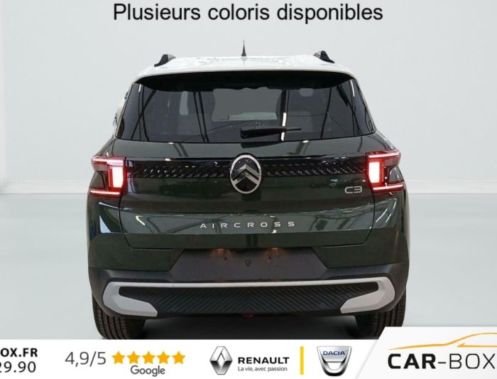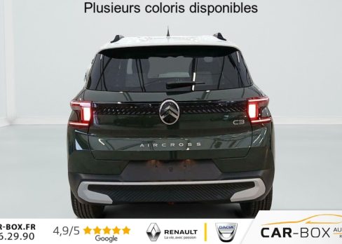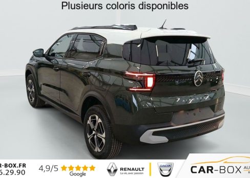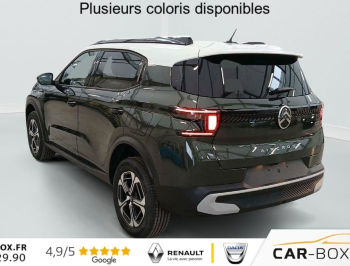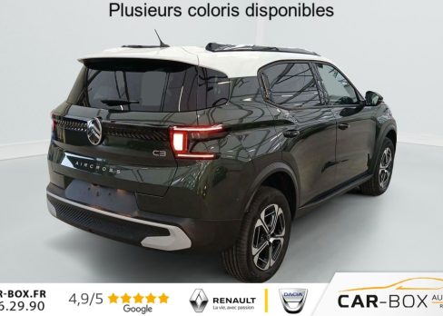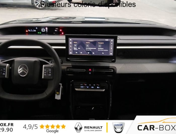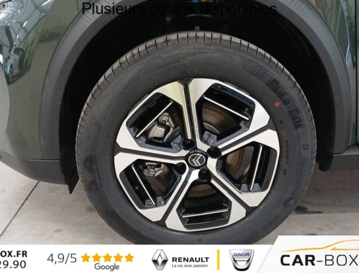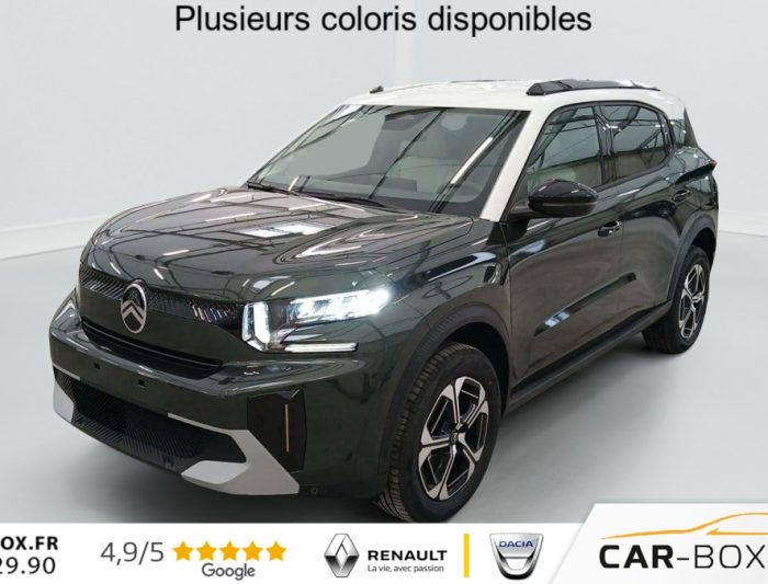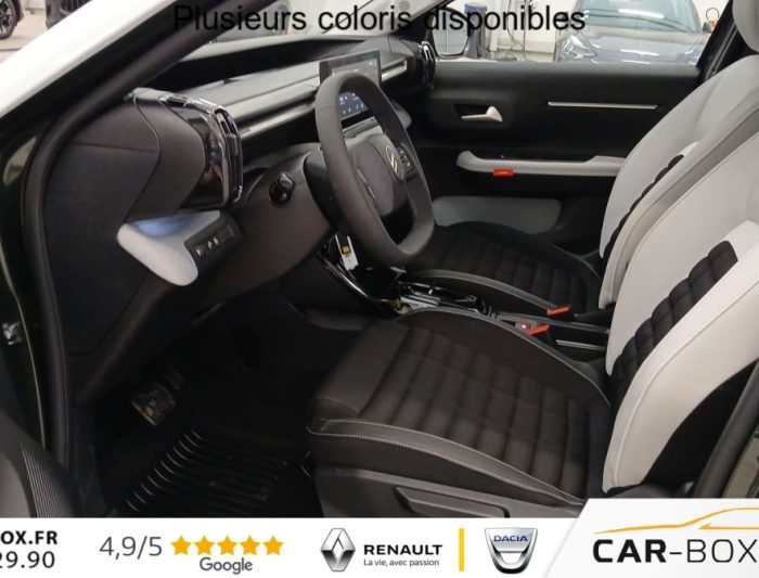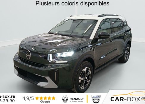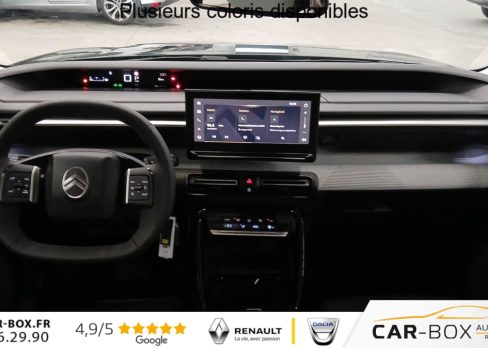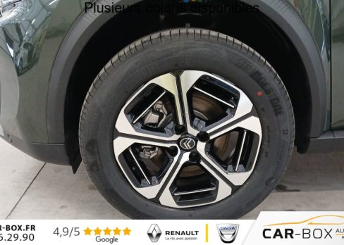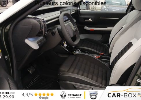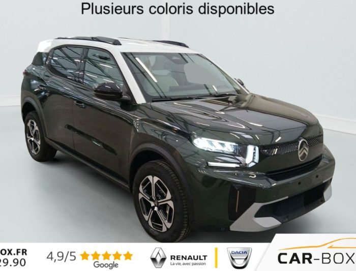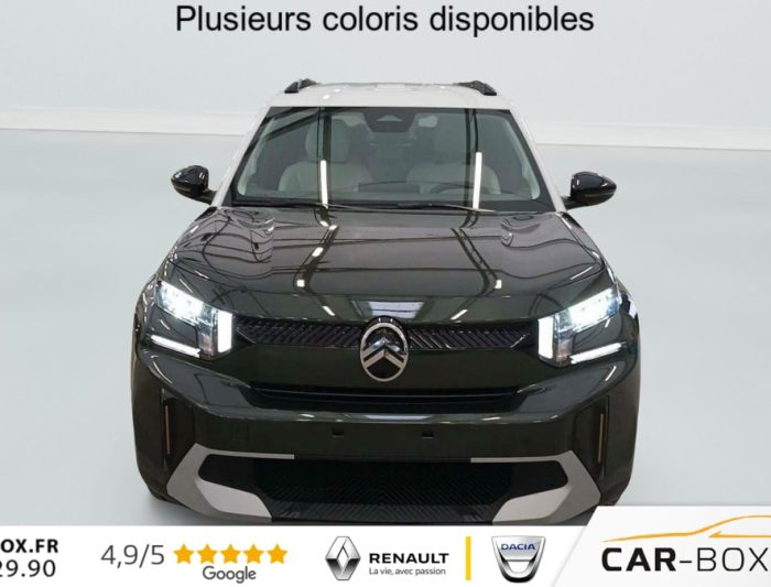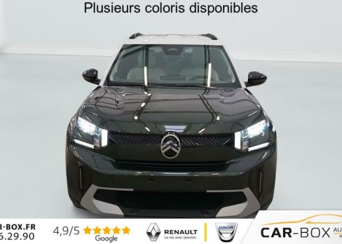 Hors frais de dossierHybride 136 e-DCS6 Max, hybride, vert, 27/01/2026, Aide au stationnement AR, Aide au stationnement AV, Allumage automatique des feux de croisement, Avertisseur sonore monoton, Banquette AR avec dossier fractionnable 2/3 et 1/3, Barres de toit Noir Brillant, Boîtier télématique : Appel d’urgence et Citroën Assistance, Caméra de recul, Centre de roue noir avec logo, Citroën Head up Display (affichage tête haute couleur) – TFT, Climatisation automatique, Condamnation centralisée avec PLIP, Configuration 7 places : option incluse (valeur : 850 Eur TTC), Console centrale haute avec accoudoir et rangement fermé, Coques de rétroviseurs extérieurs Noir Brillant, Décors extérieurs des portes Noir Brillant, Eclairage d’accompagnement et d’accueil, Eclairage d’ambiance monochromatique, Ecran central 10, 25 " tactile: Apple CarPlay et Android Auto sans fil, Elargisseurs d’ailes Noir Mat, Equipements de sécurité, Essuie-vitre AV automatique (capteur de pluie), Feux AR 3D à LED, Feux diurnes à LED, Fixations ISOFIX sur les deux places latérales, Frein de stationnement électrique, Garnissage Maille Hello Noire /Toile enduite Gris clair, Jantes alliage 17" ARAGONITE Diamantées, Lève-vitres AR électriques (descente séquentielle), Lève-vitres AV électriques (descente séquentielle), Malus CO2 : 360€, Navigation 3D sur écran central 10, 25" tactile, Ordinateur de bord, Pack Safety, Pare-brise acoustique, Plafonnier à LED, Plancher de coffre escamotable, Poches aumônières au dos des sièges AV, Prise 12 V à l’AR de console centrale, Projecteurs LED, Recharge sans fil pour smartphone (puissance 15W), Répétiteur de clignotant dans le rétroviseur à LED, Rétroviseur intérieur électrochrome, Rétroviseurs extérieurs électriques, Rétroviseurs extérieurs rabattables électriquement et dégivrants, Sabots AV et AR, Siège conducteur réglable en hauteur, Sièges Advanced Comfort, Station d’accueil Smartphone, Suspension Citroën Advanced Comfort, Système de surveillance d’angle mort, Teinte de caisse métallisée : option incluse (valeur : 0 Eur TTC), Toit bi-ton Noir Perla Nera : option incluse (valeur : 0 Eur TTC), Vitres et lunette AR surteintées, Vitres latérales teintées, Volant Gainé avec décor chrome, Volant réglable en hauteur et en profondeur, 1 Prise USB type-C (charge rapide 3A) en rang 2, 1 Prise USB type-C (charge rapide 3A) sur la console centrale, 1 Prise USB type-C (charge standard et data) sur la planche de bord