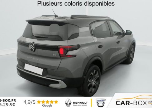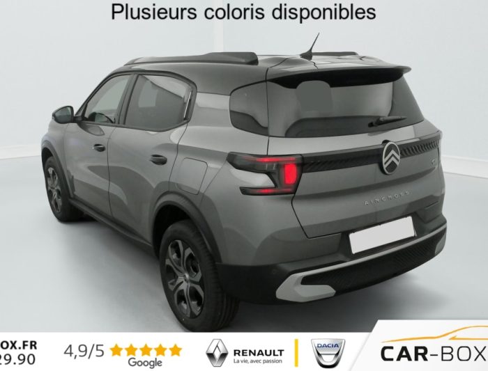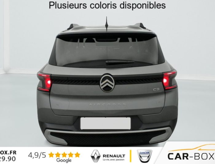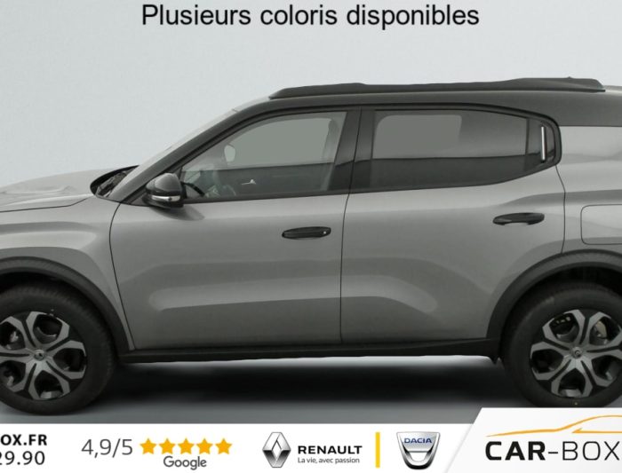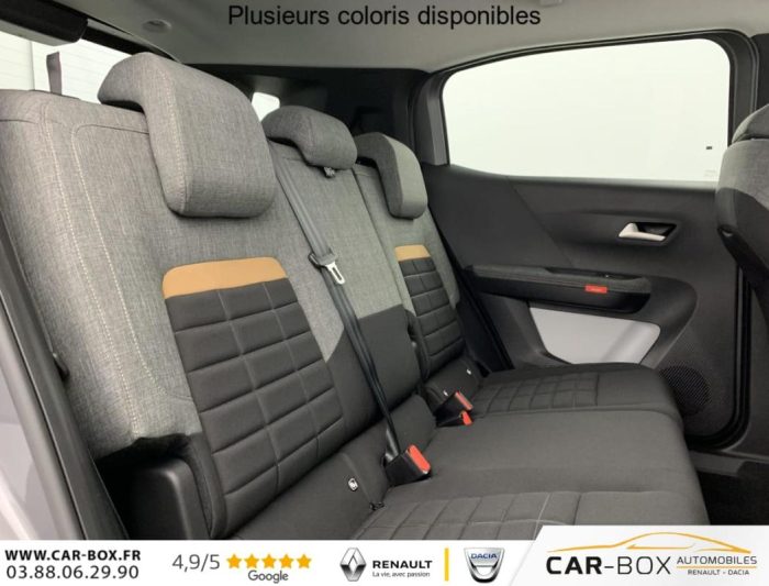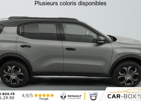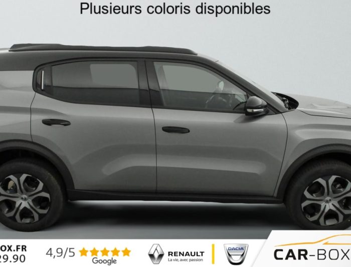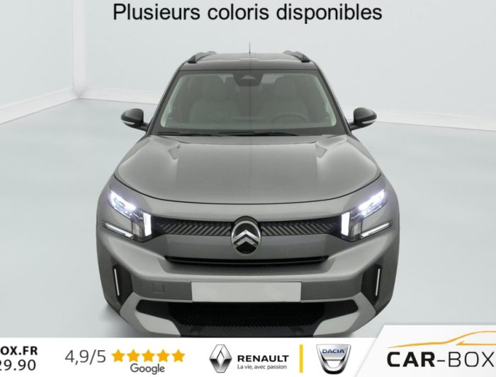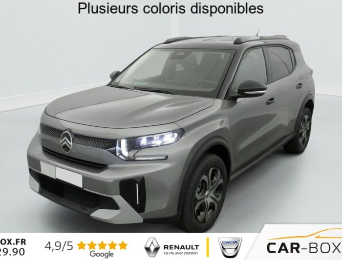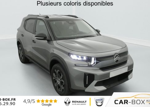 Hors frais de dossierNouveau Hybride 145 e-DCS6 Plus, hybride, gris, 16/12/2025, Teinte de caisse métallisée : option incluse (valeur : 700 Eur TTC), Toit bi-ton : option incluse (valeur : 300 Eur TTC), Détection de sous-gonflage, Caméra de recul, Feux diurnes à LED, Feux AR 3D à LED, Aide au stationnement AR, Commutation automatique des feux de route, Allumage automatique des feux de croisement, Barres de toit Noir Brillant, Coques de rétroviseurs extérieurs Noir Brillant, Pare-brise acoustique, Témoin de non-bouclage des ceintures de sécurité conducteur et passagers, Vitres et lunette AR surteintées, Pack Safety : Alerte attention conducteur Alerte active de Franchissement Involontaire de ligne Reconnaissance des panneaux de vitesse Régulateur – limiteur de vitesse Active Safety Brake (freinage automatique d’urgence), Direction assistée, Volant réglable en hauteur et en profondeur, Projecteurs LED, Plancher de coffre escamotable, Prise 12 V à l’AR de console centrale, Poignées de portes extérieures Noir Brillant, Elargisseurs d’ailes Noir Mat, Décors extérieurs Noir Brillant, Suspension Citroën Advanced Comfort, Fixations ISOFIX sur les deux places latérales, Climatisation automatique, Condamnation centralisée avec PLIP, Poches aumônières au dos des sièges AV, Lève-vitres AV électriques (descente séquentielle), Rétroviseurs extérieurs rabattables électriquement et dégivrants, Lève-vitres AR électriques (descente séquentielle), Boîtier télématique: Appel d’urgence, Essuie-vitre AV automatique (capteur de pluie), Rétroviseurs extérieurs électriques, Citroën Head up Display (affichage tête haute) – LCD, Configuration 7 places : – Banquette 2 places en rang 3 avec dossiers rabattables 50/50, appuie-têtes réglables, accoudoirs et portes-gobelet individuels – Mise en portefeuille du rang 2 pour faciliter l’accès au rang 3 – 1 Prise USB type-C supplémentaire au rang 3 (charge rapide 3A) – Plancher de coffre plat avec banquette rang 2 et 3 rabattues : option incluse (valeur : 850 Eur TTC), Banquette AR avec dossier fractionnable 2/3 et 1/3, Eclairage d’accompagnement et d’accueil, Vitres latérales teintées, 1 Prise USB type-C (charge rapide 3A) sur la console centrale, Console centrale haute avec accoudoir et rangement fermé, 1 Prise USB type-C (charge standard et data) sur la planche de bord, 2 Prises USB type-C (charge rapide 3A) en rang 2, Eclairage d’ambiance monochromatique, Sabots AV et AR, Volant Gainé avec décor chrome, Ecran central 10, 25 " tactile: Apple CarPlay et Android Auto sans fil Système audio 6 HPs (DAB), Enjoliveurs 17" SYLVANITE, Garnissage Tissu Noir /Tissu Quadric Ambiance Urban Bronze avec Sièges Advanced Comfort, Kit de dépannage provisoire des pneumatiques : option incluse (valeur : 20 Eur TTC), Poignées de maintien au rang 2, ABS, ESP, Boîte automatique 6 rapports, 6 Airbags (frontaux, latéraux AV et rideaux), AFU, REF, Plafonnier AV à LED avec lecteurs de cartes, Ordinateur de bord multifonctions avec indicateur de température exterieure, Aérateurs latéraux en noir brillant et 2 aérateurs en zone centrale sur planche de bord, Anneau de remorquage AV et AR, Volet d’occultation du miroir de courtoise conducteur et passager, Appuis-tête AV intégrés réglables en hauteur, Décors sur les panneaux de portes AV/AR et sur la planche de bord Bronze, Siège conducteur réglable en hauteur, Aide au démarrage en pente, Frein de stationnement électrique