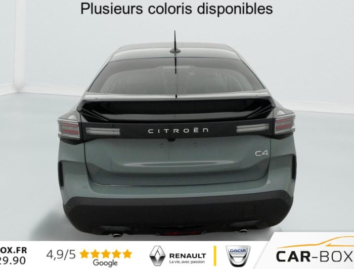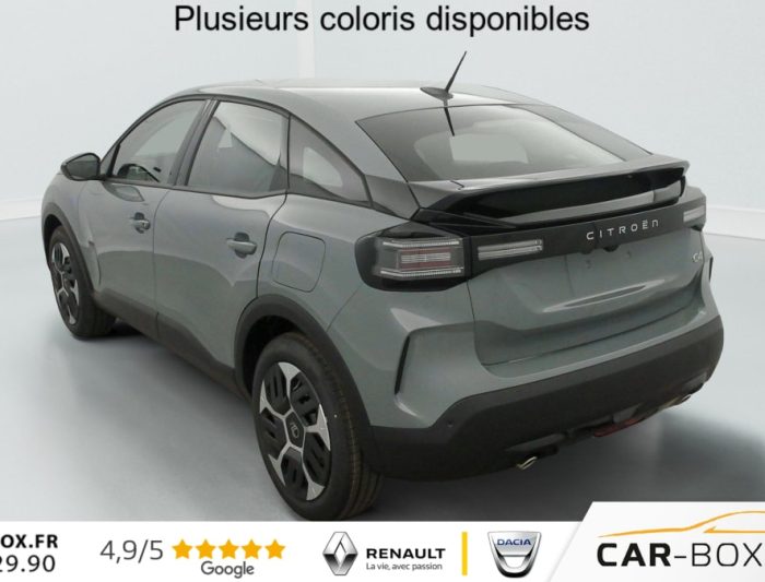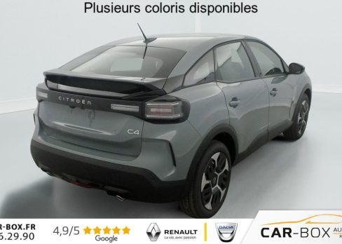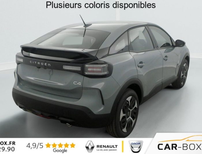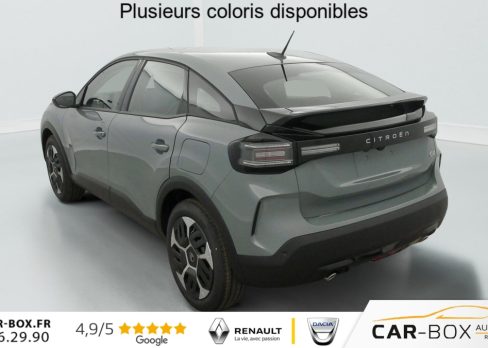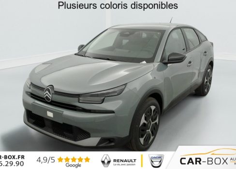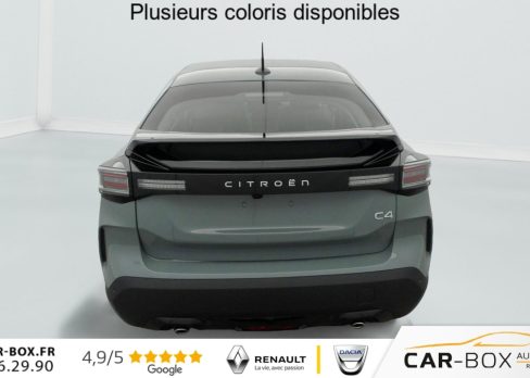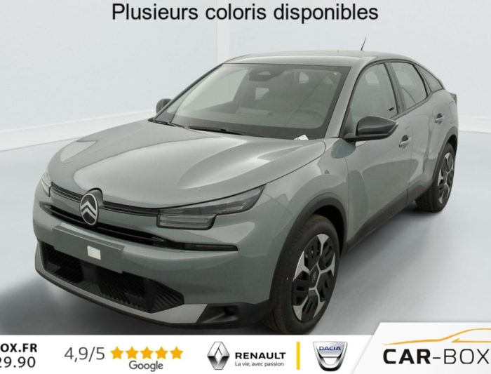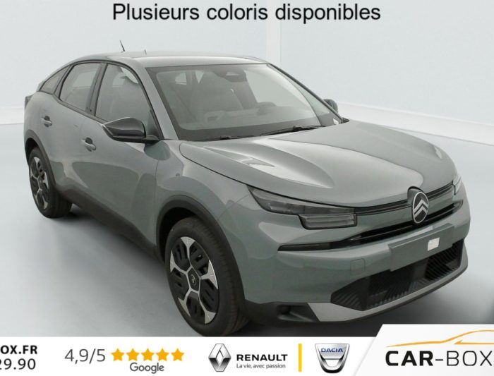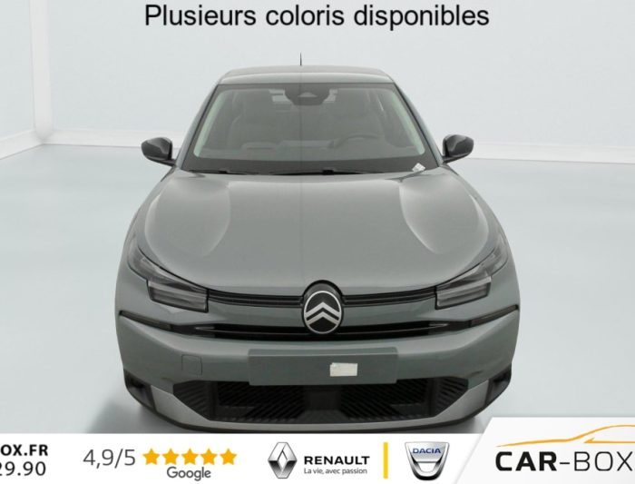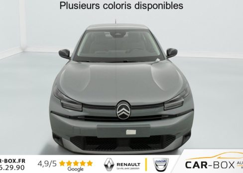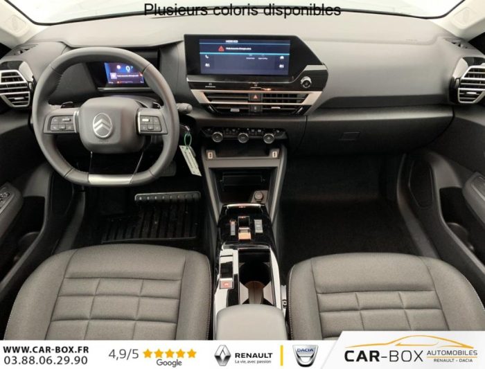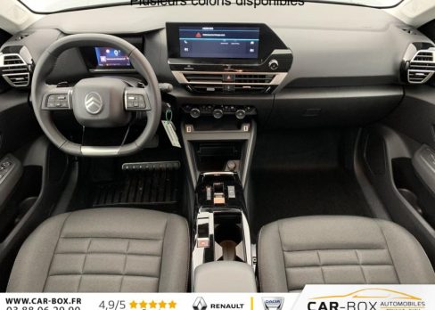 Détection de sous-gonflage, Volant croûte de cuir, Caméra de recul, Aide au stationnement AR, Rétroviseurs extérieurs rabattables électriquement, Coques de rétroviseurs extérieurs Noir Brillant, Elargisseurs d'aile et bas de caisse Noir Mat, Lève-vitres AV et AR électriques et séquentiels, Clignotants impulsionnels, Rétroviseurs extérieurs électriques et dégivrants, Jupe AR Noir Brilliant, Volant réglable en hauteur et en profondeur, Projecteurs LED, Prise 12V à l'AV, Enjoliveurs 18" AEROTECH, Aérateurs centraux en rang 2, ABS + AFU + ESP + REF, Poche aumônière au dos des sièges AV, Suspension Citroën Advanced Comfort, Direction à assistance électrique variable, Palette de changement de vitesse au volant, Siège conducteur avec réglage lombaire, Eclairage d'accueil et d'accompagnement, Pare-soleil avec miroir occultable côtés conducteur et passager, Teinte de caisse opaque : option incluse (valeur : 300 Eur TTC), 2 Prises USB au rang 1 (1 type A + 1 type C pour fonction Mirror Screen) + 1 Prise USB au rang 2 (type A), Airbags frontaux, latéraux AV et rideaux, Banquette AR fractionnable 2/3 - 1/3, Combiné numérique couleur 5.5" TFT, Ecran central 10" tactile: - Système audio numérique (DAB) 6 haut-parleurs - Apple CarPlay et Android Auto - Reconnaissance vocale - Kit mains libres Bluetooth - Boîtier télématique : Appel d'urgence et Citroën Assistance, Sièges conducteur et passager réglables en hauteur, Condamnation centralisée avec Plip et condamnation automatique du coffre et des portes en roulant, Console centrale haute avec rangements fermés et 2 porte-gobelets et accoudoir coulissant, Fixations ISOFIX sur sièges latéraux AR (3 points d'encrage avec Top TetherTether), Plafonniers AV et AR à lampes, Commande au volant du système audio et du régulateur - limiteur de vitesse, Feux diurnes à LED avec nouvelle signature lumineuse, Feux AR à LED avec nouvelle signature lumineuse, Pack Safety - Active Safety Brake (fonctionne de 30 à 80 km/h et détecte les piétons et les cyclistes) - Alerte active de Franchissement Involontaire de Ligne - Alerte Attention Conducteur - Alerte Risque Collision - Allumage automatique des feux de croisement - Coffee Break Alert - Reconnaissance des panneaux de vitesse et recommandation - Régulateur-limiteur de vitesse - Témoin de non-bouclage des ceintures de sécurité conducteur et passagers : Allumage automatique des feux de croisement Régulateur - limiteur de vitesse Coffee Break Alert Alerte attention conducteur Alerte Risque Collision Alerte active de Franchissement Involontaire de ligne Reconnaissance des panneaux de vitesse et recommandation Témoin de non-bouclage des ceintures de sécurité conducteur et passager Active Safety Brake (fonctionne de 30 à 80 km/h et détecte les piétons et les cyclistes), Garnissage Tissu Hello Noir/Toile enduite Gris Ambiance Urban Grey + Sièges Advanced Comfort, Décor de panneaux de porte injecté Gris Horizon, Bande de dossiers en Tissu Curitiba Blanc/Noir, Accoudoir en Tissu Brasilia - Noir Mistral, Médaillons de porte AV en Tissu Brasilia - Noir Mistral, Boîte automatique 6 rapports, Essuie-vitre AV automatique (capteur de pluie), Climatisation automatique bizone, Frein de stationnement électrique automatique, Aide au démarrage en pente, Poignées de portes extérieures couleur caisse, Kit de dépannage provisoire de pneumatiques