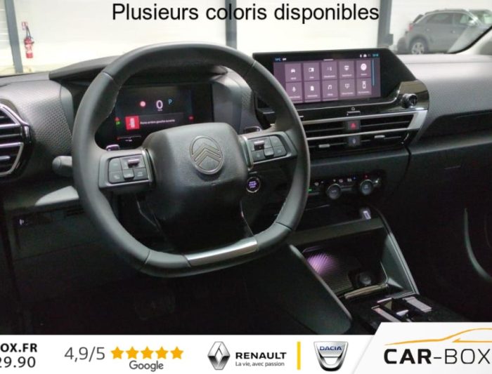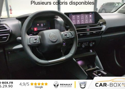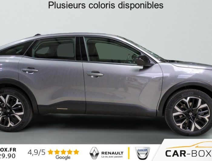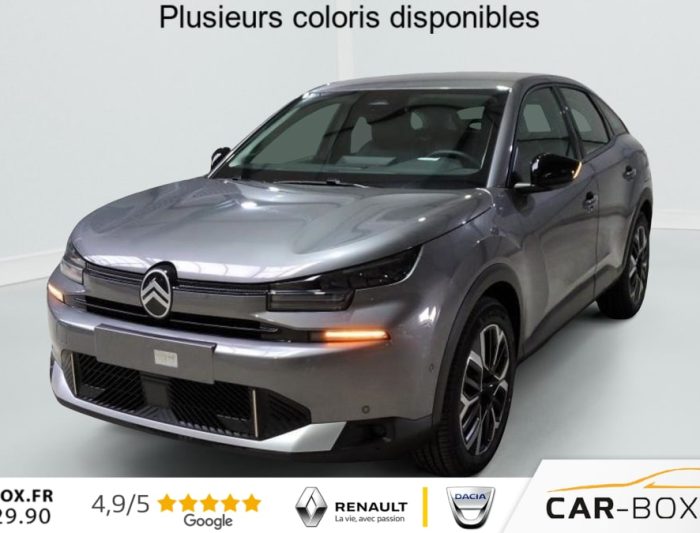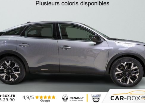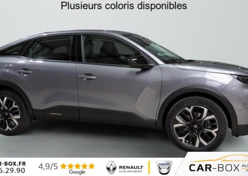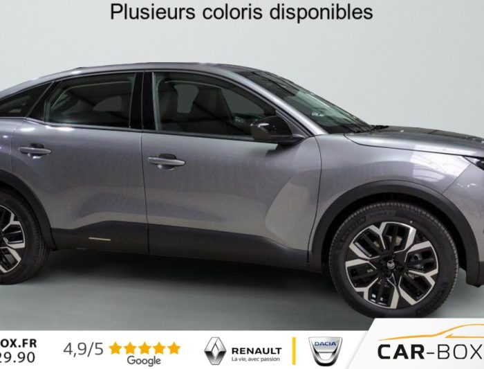 ABS + AFU + ESP + REF, Accès et démarrage mains libres Proximity, Aide au démarrage en pente, Aide au stationnement AR, Aide au stationnement AV et latéral, Airbags frontaux, latéraux AV et rideaux, Banquette AR fractionnable 2/3 - 1/3, Boîte automatique 6 rapports, Caméra de recul, Climatisation automatique, Combiné numérique couleur 7" TFT, Console centrale haute avec rangements et accoudoir, Coques de rétroviseurs extérieurs Noir Brillant, Détection de sous-gonflage, Direction assistée, Eclairage d'accompagnement sous les rétroviseurs extérieurs, Ecran central 10" tactile: - Système audio numérique (DAB) 6 HPs - Apple CarPlay et Android Auto sans fil - Reconnaissance vocale - Kit mains libres Bluetooth , Elargisseurs d'aile et bas de caisse Noir Mat, Essuie-vitre AV automatique, Feux AR à LED avec signature lumineuse, Feux diurnes à LED avec signature lumineuse, Frein de stationnement électrique automatique, Garnissage Tissu Hello Noir/Toile enduite Gris Ambiance Urban Grey + Sièges Advanced Comfort, Jantes alliage 18", Lécheurs de vitres latérales Noir, Lève-vitres AV et AR électriques et séquentiels, Navigation 3D Connectée sur écran central 10'' tactile - Système de navigation TomTom , Pack Drive Assist : Active Safety Brake 2.0 (fonctionne à l'aide d'un radar de 7 à 140 km/h, y compris de nuit) - Commutation automatique des feux de route - Reconnaissance étendue des panneaux et recommandation de vitesse - Régulateur de vitesse adaptatif avec fonction Stop & Go (dispositif ajustant la vitesse en fonction du véhicule précédent) - Système de surveillance d'angle mort, Pack Safety : Alerte active de Franchissement Involontaire de Ligne - Alerte Attention Conducteur - Alerte Risque Collision - Allumage automatique des feux de croisement - Coffee Break Alert - Reconnaissance des panneaux de vitesse et recommandation , Poignées de portes extérieures couleur caisse, Projecteurs LED, Rétroviseurs extérieurs électriques et dégivrants, Rétroviseurs extérieurs rabattables électriquement, Siège conducteur avec réglage lombaire, Sièges conducteur et passager réglables en hauteur, Suspension Citroën Advanced Comfort, Teinte de caisse métallisée Gris Mercury, Volant cuir pleine fleur, 2 prises USB au rang 1 (1 type C + 1 type A) + 1 prise USB en rang 2 (type A)