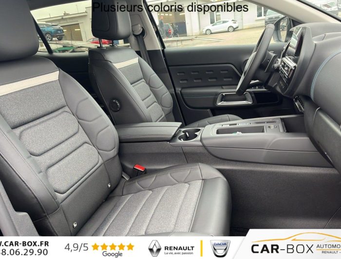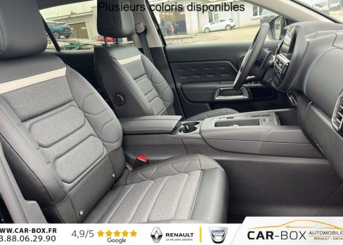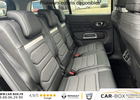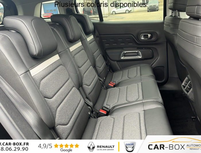 Malus payé, Projecteurs antibrouillard avec éclairage statique d'intersection, Détection de sous-gonflage, Airbags frontaux AV, latéraux AV et rideaux, Volant croûte de cuir, Feux AR 3D à LED, Aide au stationnement AR, Allumage automatique des feux de croisement, Coques de rétroviseurs extérieurs Noir Brillant, Barres de toit, Elargisseurs d'aile et bas de caisse Noir Mat, Lève-vitres AV et AR électriques et séquentiels, Vitres et lunette AR surteintées, Condamnation centralisée, Caméra de recul avec Top Rear Vision, Direction assistée, 3 sièges AR indépendants, coulissants, inclinables et escamotables, Enjoliveurs de contour de vitres latérales chromés, Essuie-vitres AV automatique Magic Wash, Fixations ISOFIX sur les sièges passager AV et latéraux AR, Sièges conducteur et passager réglables en hauteur, Combiné numérique 12,3" personnalisable, Volant réglable en hauteur et en profondeur, Custodes AR surteintées, Projecteurs LED, Plancher de coffre escamotable, Poignées de portes extérieures Noir Brillant, ABS + AFU + ESP + REF, Suspension Citroën Advanced Comfort, Siège conducteur avec réglage lombaire, Feux diurnes à LED avec clignotants à LED, Kit mains libres Bluetooth et 3 prises USB, Rétroviseurs extérieurs rabattables électriquement avec éclairage d'accueil, Teinte de caisse nacrée : option incluse (valeur : 0 Eur TTC), Jantes alliage 18" PULSAR Diamantées bi-ton, Accès mains libres, Apple CarPlay et Android Auto, Garnissage Tissu Bruneo chine/Toile enduite Noire/Ambiance Metropolitan Black avec Sièges Advanced Comfort, Navigation 3D sur écran central 10" tactile Comprend le système de navigation TomTom, la reconnaissance vocale avec langage naturel, Boîtier télématique : Appel d'urgence et Citroën Assistance , Pack Safety - Active Safety Brake - Alerte active de Franchissement Involontaire de Ligne - Coffee Break Alert - Reconnaissance étendue des panneaux et recommandation de vitesse - Régulateur-limiteur de vitesse : Régulateur-limiteur de vitesse Coffee Break Alert Alerte active de Franchissement Involontaire de ligne Active Safety Brake 2.0 Fonctionne à l'aide d'un Radar de 7 à 140 km/h, même de nuit et détecte les cyclistes Reconnaissance étendue des panneaux et recommandation de vitesse, Pack Safety + Système de surveillance d'angle mort : Système de surveillance d'angle mort, Kit de dépannage provisoire des pneumatiques : option incluse (valeur : 20 Eur TTC), Pack Color Noir Brillant Inserts colorés Noir Brillant sur Airbump et bouclier AV : Inserts colorés Noir Brillant sur Airbump et bouclier AV, Prise 12V sur la console centrale, Pack Drive Assist Aide maintien dans la voie, Alerte Attention Conducteur, Commutation automatique des feux de route, Highway Driver Assist (système de conduite autonome de niveau 2), Régulateur de vitesse adaptatif avec fonction Stop & Go : Alerte attention conducteur Commutation automatique des feux de route Régulateur de vitesse adaptatif avec fonction Stop&Go Highway Driver Assist (système autonome de niveau 2) Aide maintien dans la voie, Rétroviseur intérieur électrochrome, Rétroviseurs extérieurs électriques dégivrants, Boîte automatique 8 rapports, Aide au stationnement AV, Climatisation automatique bizone, Frein de stationnement électrique automatique
