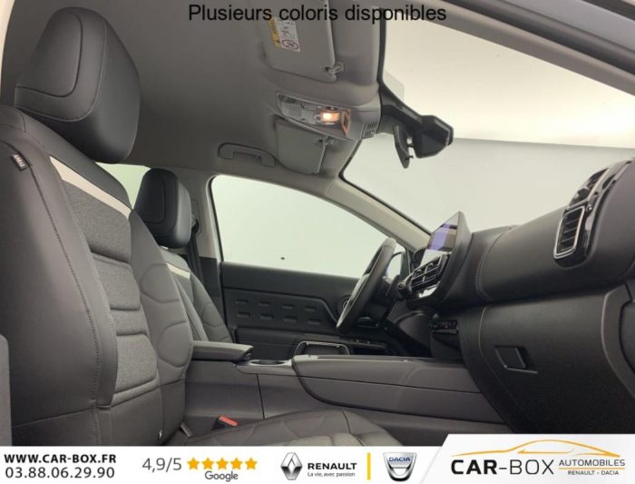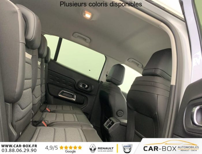 Ambiance Metropolitan Black : option incluse (valeur : 250 Eur TTC), Ni kit ni roue de secours, Sièges AV chauffants : option incluse (valeur : 250 Eur TTC), Détection de sous-gonflage, Airbags frontaux AV, latéraux AV et rideaux, Volant croûte de cuir, Démarrage mains libres, Feux AR 3D à LED, Aide au stationnement AR, Allumage automatique des feux de croisement, Coques de rétroviseurs extérieurs Noir Brillant, Elargisseurs d'aile et bas de caisse Noir Mat, Lève-vitres AV et AR électriques et séquentiels, Vitres et lunette AR surteintées, Caméra de recul avec Top Rear Vision, 3 sièges AR indépendants, coulissants, inclinables et escamotables, Enjoliveurs de contour de vitres latérales chromés, Essuie-vitres AV automatique Magic Wash, Fixations ISOFIX sur les sièges passager AV et latéraux AR, Calandre supérieure Noir Brillant, Combiné numérique 12,3" personnalisable, Volant réglable en hauteur et en profondeur, Custodes AR surteintées, Projecteurs LED, Plancher de coffre escamotable, Jantes alliage 18" SWIRL, Poignées de portes extérieures Noir Brillant, ABS + AFU + ESP + REF, Suspension Citroën Advanced Comfort, Feux diurnes à LED avec clignotants à LED, Kit mains libres Bluetooth et 3 prises USB, Sabot de protection Noir Brillant, Rétroviseurs extérieurs rabattables électriquement, Teinte de caisse métallisée : option incluse (valeur : 700 Eur TTC), Accès mains libres, Apple CarPlay et Android Auto, Navigation 3D sur écran central 10" tactile Comprend le système de navigation TomTom, la reconnaissance vocale avec langage naturel, l'interface personnalisable, et les services Connect PLUS additionnels, Boîtier télématique : Appel d'urgence et Citroën Assistance, Pack Safety - Active Safety Brake - Alerte active de Franchissement Involontaire de Ligne - Coffee Break Alert - Reconnaissance étendue des panneaux et recommandation de vitesse - Régulateur-limiteur de vitesse : Régulateur - limiteur de vitesse Coffee Break Alert Alerte active de Franchissement Involontaire de ligne Active Safety Brake 2.0 Fonctionne à l'aide d'un Radar de 7 à 140 km/h, même de nuit et détecte les cyclistes Reconnaissance étendue des panneaux et recommandation de vitesse, Pack Color Noir Brillant Inserts colorés Noir Brillant sur Airbump et bouclier AV : Inserts colorés Noir Brillant sur Airbump et bouclier AV, Rétroviseurs extérieurs électriques dégivrants, Aide au stationnement AV, Climatisation automatique bizone, Frein de stationnement électrique automatique