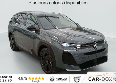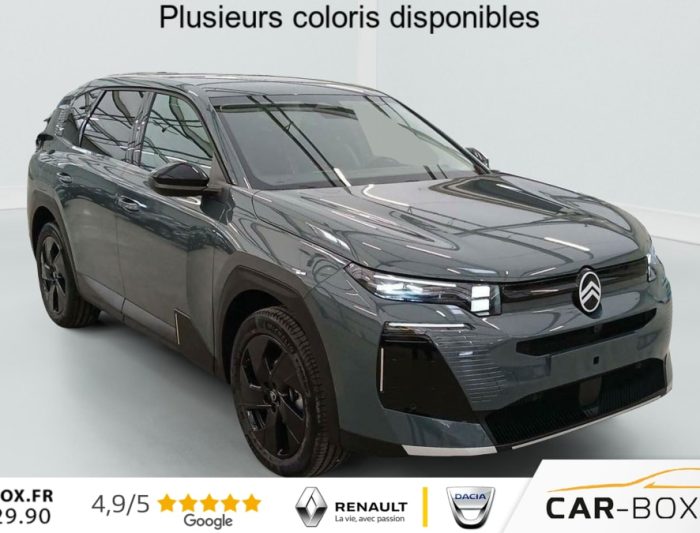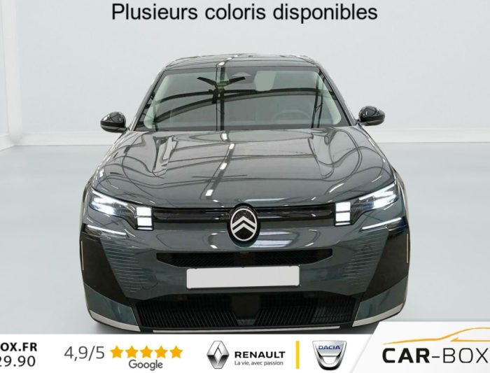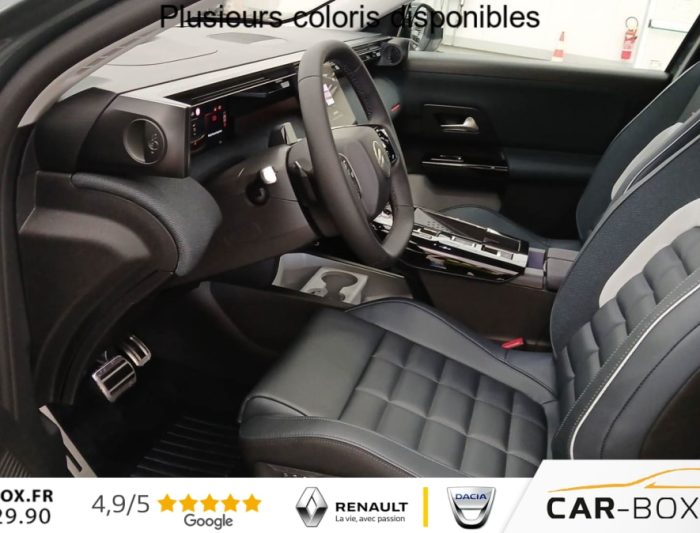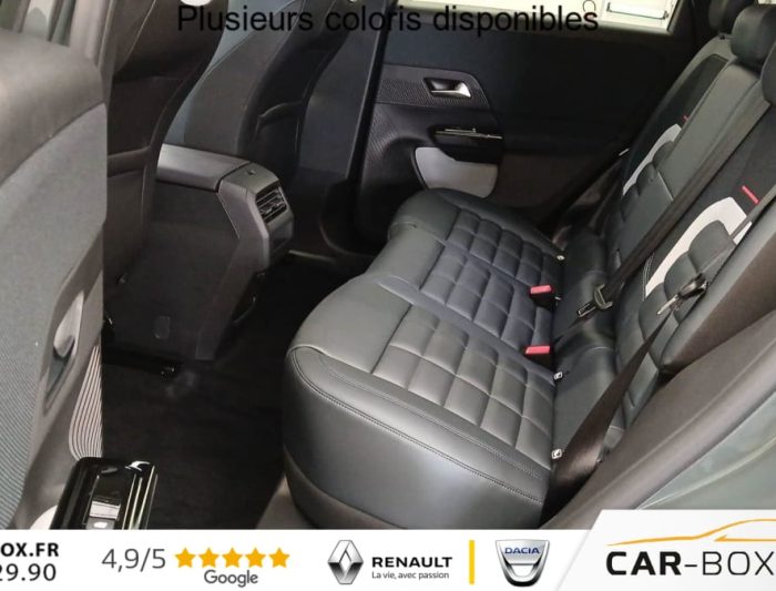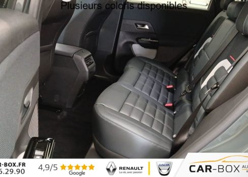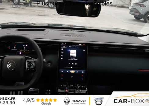 Hors frais de dossierHybride 145 e-DCS6 Max, hybride, vert, 21/01/2026, ABS, ESP, Accès et démarrage mains libres Proximity, Accoudoir central avant, Aérateurs de climatisation centraux pour les passagers AR, Affichage Tête Haute Etendu, Aide au stationnement AR, Aide au stationnement AV avec VisioPark 360°, Allumage automatique des feux de croisement, Apple CarPlay et Android Auto sans fil, Banquette AR avec dossier rabattable 40/20/40, Banquette AR avec dossiers inclinables et accoudoir central, Bluetooth (connexion simultanée 2 télephones), Boîte automatique 6 rapports, Boitier télématique: Appel d?urgence et Citroën Assistance, Calandre Noir Mat, Clean Cabin avec détecteur de qualité de l?air, Climatisation automatique bizone étendue, Color Clip Gold Satin, Combiné numérique 10" personnalisable, Contrôle de la presión des pneus, Coques de rétroviseurs extérieurs Noir Brillant, Démarrage mains libres, Direction assistée, Eclairage d?ambiance étendu, 8 couleurs, Eclairage intérieur LED, Ecran Cascade avec Navigation 3D Connectée, Ecran central vertical 13" tactile, Equipements de sécurité, Essuie-vitres AV automatique Magic Wash, Feux AR à LED Citroën Light Wings, Feux diurnes avec clignotants à LED, Frein de stationnement électrique, Garnissage Tissu Blue / Toile enduite Premium Blue, Hayons motorisé mains libres, Jantes alliage 19" ZIRCONE, Lève-vitres électriques AV/AR séquentiels anti-pincement, Malus 360€ cf CO2, Pack Design, Pack Drive Assist 2.0, Pack Safety, Pare-brise acoustique, Pare-brise feuilleté, Pédalier et repose pieds aluminium, Plancher de coffre modulable à 2 positions, Poignées de maintien couleur chrome, Poignées de portes extérieures couleur caisse, Prédisposition attelage, Projecteurs Citroën Matrix LED, Recharge sans fil pour smartphone, Rétroviseur intérieur électrochrome, Rétroviseurs extérieurs électriques dégivrants, Sélecteur de mode de conduite, Services Connect PLUS, Siège conducteur à réglage électrique (8 directions) avec mémoire de position, Sièges AV chauffants, Suspension Citroën Advanced Comfort, Système audio 6 HP (DAB+), TCS (Contrôle de la traction), Teinte de carrosserie métallisée : option incluse (valeur : 0 Eur TTC), Verrouillage centralisé, Vitres AV électriques, Volant chauffant, Volant gainé multifonctions avec décor Noir Brillant, 1 prise USB type-C rétroéclairées à l?AV (charge), 2 prises USB type-C rétroéclairées à l?AR console centrale (charge), 3 prises 12V