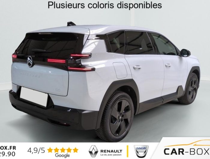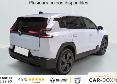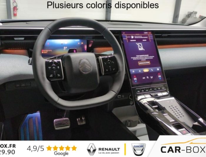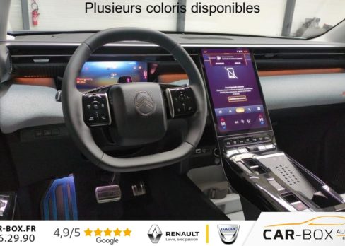 Hors frais de dossierNOUVEAU Hybride 145 ch e-DCS6 Max, hybride, blanc, 02/01/2026, Accès et démarrage mains libres Proximity 2 Télécommandes 3 boutons (verrouillage, coffre et déverrouillage)., Accoudoir central AV avec rangement fermé et réfrigéré, Aérateurs de climatisation centraux pour les passagers AR, Affichage Tête Haute Etendu, Aide au stationnement AR, Aide au stationnement AV avec VisioPark 360° Comprend 4 caméras haute définition ainsi que 8 capteurs répartis autour du véhicule, offrant une vision à 360° de l’environnement., Allumage adaptative des feux de croisement, Ambiance Hype Grey : Garnissage Toile enduite premium avec perforations Gris/Tissu Gris + Appuie-tête avant à réglages intégrés + Sellerie "Sofa Design" avec insert textile Sofa Gris sur la planche de bord et les panneaux de portes + Sièges avant à réglage électrique (10 voies) + Siège conducteur avec fonction mémorisation + Sièges avant massants (8 poches) et ventilés (3 niveaux de vitesse) avec maintien latéral adaptatif + Sièges avant et arrière chauffants, Apple CarPlay et Android Auto sans fil, Banquette AR avec dossier rabattable 40/20/40, Banquette AR avec dossiers inclinables et accoudoir central, Bluetooth (connexion simultanée 2 télephones), Boîte automatique 6 rapports, Calandre Noir Brillant, Clean Cabin avec détecteur de qualité de l’air Le système détecte les particules fines et active automatiquement le recyclage de l’air ambiant., Climatisation automatique bizone étendue, Color Clip Gold Satin, Combiné numérique 10" personnalisable, Coques de rétroviseurs extérieurs Noir Brillant, Démarrage mains libres, Direction assistée, Eclairage d’ambiance étendu, 8 couleurs Éclairage d’ambiance étendu le long de la planche de bord, des tweeters, des panneaux de porte AV et sous l’écran cascade, Eclairage intérieur LED Comprend l’éclairage à LED des plafonniers AV et AR, ainsi que l’éclairage des miroirs de courtoisie., Ecran Cascade avec Navigation 3D Connectée Comprend le système de navigation TomTom, la reconnaissance vocale. Jusqu’à 8 profils., Ecran central vertical 13" tactile, Equipements de sécurité ABS avec répartiteur électronique de freinage (REF), Freinage d’urgence automatique post-collision (AFU), ESP avec aide au démarrage en côte, Airbags (frontaux, latéraux AV et rideaux), Détection de sous-gonflage, Fixations ISOFIX et Top Tether sur les sièges latéraux AR, Essuie-vitres AV automatique Magic Wash, Feux AR à LED Citroën Light Wings, Feux diurnes avec clignotants à LED, Frein de stationnement électrique, Garnissage Toile enduite premium avec perforations Gris/Tissu Gris, Hayon motorisé mains libres, Jantes alliage 19" ZIRCONE, Kit de dépannage provisoire des pneumatiques, Lève-vitres électriques AV/AR séquentiels anti-pincement, Pack Design – Décors de pare-chocs AV et AR Noir Brillant – Lame AV peinture satinée, Pack Drive Assist 2.0 – Aide au positionnement dans la voie – Alerte de trafic en marche AR (jusqu’à 40 mètres) – Assistance semi-automatique au changement de voie – Caméra d’alerte attention conducteur – Préconisation anticipée des limitations de vitesse – Système de surveillance d’angle mort longue distance (jusqu’à 75 mètres), Pack Hiver étendu : Grip Control + Pare-brise chauffant, Pack Safety – Affichage de la limitation de vitesse – Alerte active de Franchissement Involontaire de Ligne – Alerte attention conducteur – Coffee Break Alert – Reconnaissance étendue des panneaux de signalisation et recommandation de vitesse, Pare-brise acoustique, Pare-brise feuilleté, Pédalier et repose pieds aluminium, Plancher de coffre modulable à 2 positions, Poignées de maintien couleur chrome, Poignées de portes extérieures couleur caisse, Prédisposition attelage, Projecteurs Citroën Matrix LED, Recharge sans fil pour smartphone, Rétroviseur intérieur électrochrome frameless, Rétroviseurs extérieurs électriques dégivrants, Rétroviseurs extérieurs rabattables électriquement avec éclairage d’accueil à LED, Sélecteur de mode de conduite, Sellerie "Sofa Design" avec insert textile Sofa Gris sur la planche de bord et les panneaux de portes, Sièges avant à réglage électrique (10 voies), Sièges avant et arrière chauffants, Suspension Citroën Advanced Comfort, Système audio 6 HP (DAB+), Teinte de caisse métallisée Blanc Okénite, Vitres AR, vitres de custode et lunette AR surteintées, Volant chauffant, Volant gainé multifonctions avec décor Noir Brillant, 1 prise USB type-C rétroéclairées à l’AV (charge), 2 prises USB type-C rétroéclairées à l’AR console centrale (charge), 3 prises 12V Prises situées dans le Rang 1 console centrale, rang 2 AR console centrale et coffre