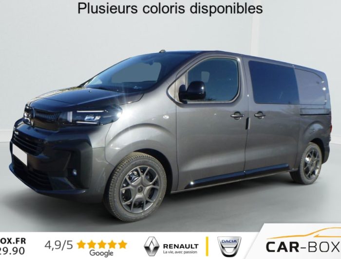 ABS, AFU, ASR et ESP avec aide au demarrage en pente, Aide au stationnement arriere, Airbags frontaux conducteur et passager, Airbags lateraux avant tete-thorax en rang 1, Allumage automatique des feux de croisement + essuie-vitre avant auto, Anneaux d'arrimage 4 repartis uniformement sur la zone de chargement, Banquette fixe 3 places en rang 2 avec appui-tete reglables et 2 accoudoirs,, Banquette passager 2 places avec appuis-tetes reglables en hauteur avec rangement sous assise, Climatisation manuelle regulee en temperature, Cloison pleine PVC avec vitre plexiglass, Combine numerique LCD noir et blanc, Commandes au volant du systeme audio et du regulateur-limiteur de vitesse, Commandes radio au volant, Condamnation centralisee des portes, Connectivite via BTA (appel d'urgence et d'assistance localisees + offres services connectes), Controle de la pression des pneus, Deux prises USB-C a l'avant, Direction assistee, Eclairage d'accueil et d'accompagnement, Garnitures pavillon habitacle en rang 2, Jeu de clefs: 2 plips HF 3 boutons avec fonction selectivite, Leve-vitres avant electriques impulsionnels, Pack Connectivite + Camera (Camera de recul 180 avec affichage sur ecran tactile 10'' HD couleur, Ecran tactile 10'' HD couleur, Mirror Screen (compatible avec Android Auto et Apple CarPlay), Navigation 3D connectee avec reconnaissance vocale Cartographie Europe, Services de Navigation connectee TomTom (TomTomTraffic, Prix Carburant, Parkings, Meteo, Recherche Locale) et Alertes Zones de Danger,Compatible avec Android Auto et Apple CarPlay), Prise 12 V dans la zone de chargement, Projecteurs antibrouillard, Reconnaissance vocale, Retroviseurs exterieurs rabattables electriquement) : option incluse (valeur : 1 620 Eur TTC), Pack Look exterieur (Baguettes laterales et coques de retroviseurs exterieurs couleur caisse, Boucliers couleur caisse, Enjoliveur(s) de rail de porte laterale coulissante couleur caisse, Jantes tole 17'' noires avec enjoliveurs, Poignees de portes exterieures couleur caisse, Prise 12 V dans la zone de chargement, Projecteurs antibrouillard, Retroviseurs exterieurs rabattables electriquement) : option incluse (valeur : 600 Eur TTC), Pack Securite (Assistance au maintien dans la voie, Commutation automatique des feux de route, Detection inattention conducteur. Freinage automatique d'urgence avec alerte risque de collision, Reconnaissance des panneaux de vitesse et recommandation), Plancher bois anti-derapant 9 mm avec baguette aluminium et habillages lateraux et coffrage des : option incluse (valeur : 840 Eur TTC), Poignee(s) interieure(s) de porte(s) laterale(s) coulissante(s), Porte laterale coulissante droite, Porte laterale gauche coulissante : option incluse (valeur : 480 Eur TTC), Portes arriere battantes 50/50 tolees a ouverture a 180, Prise 12 V dans la zone de chargement, Prise 12V (1200 W max) dans la boite a gants, Projecteurs antibrouillard, Projecteurs full LED avec feux diurnes a LED : option incluse (valeur : 480 Eur TTC), Radio DAB Bluetooth avec ecran tactile 5'' monochrome + 4 HP (2 tweeters + 2 woofers), Regulateur - limiteur de vitesse, Retroviseurs exterieurs electriques et degivrants, Roue de secours homogene (jante tole noire) : option incluse (valeur : 216 Eur TTC), Siege conducteur individuel avec appui-tete reglable en hauteur et avec accoudoir, Vitres laterales fixes en rang 2, Vitres laterales surteintees en Rang 2, Volant reglable en hauteur et en profondeur