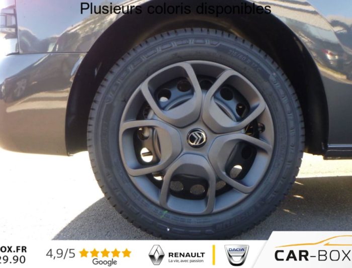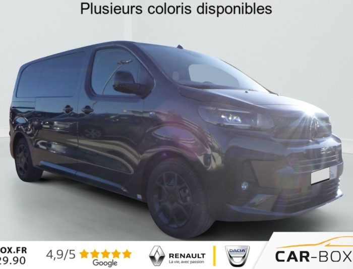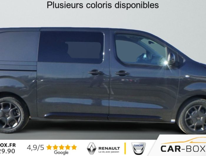 Deux prises USB-C a l'avant, Eclairage d'accueil et d'accompagnement, Airbags frontaux conducteur et passager, Regulateur - limiteur de vitesse, Aide au stationnement arriere, Projecteurs antibrouillard, Porte laterale coulissante droite, Prise 12 V dans la zone de chargement, Porte laterale gauche coulissante : option incluse (valeur : 480 Eur TTC), Direction assistee, Retroviseurs exterieurs electriques et degivrants, Airbags lateraux avant tete-thorax en rang 1, Vitres laterales surteintees en Rang 2, Plancher bois anti-derapant 9 mm avec baguette aluminium et habillages lateraux et coffrage des : option incluse (valeur : 840 Eur TTC), Climatisation manuelle regulee en temperature, Jeu de clefs: 2 plips HF 3 boutons avec fonction selectivite, Pack Securite (Assistance au maintien dans la voie, Commutation automatique des feux de route, Detection inattention conducteur. Freinage automatique d'urgence avec alerte risque de collision, Reconnaissance des panneaux de vitesse et recommandation), Roue de secours homogene (jante tole noire) : option incluse (valeur : 216 Eur TTC), Cloison pleine PVC avec vitre plexiglass, Banquette passager 2 places avec appuis-tetes reglables en hauteur avec rangement sous assise, Anneaux d'arrimage 4 repartis uniformement sur la zone de chargement, Siege conducteur individuel avec appui-tete reglable en hauteur et avec accoudoir, Vitres laterales fixes en rang 2, Projecteurs full LED avec feux diurnes a LED : option incluse (valeur : 480 Eur TTC), ABS, AFU, ASR et ESP avec aide au demarrage en pente, Combine numerique LCD noir et blanc, Connectivite via BTA (appel d'urgence et d'assistance localisees + offres services connectes), Leve-vitres avant electriques impulsionnels, Garnitures pavillon habitacle en rang 2, Banquette fixe 3 places en rang 2 avec appui-tete reglables et 2 accoudoirs,, Prise 12V (1200 W max) dans la boite a gants, Pack Connectivite + Camera (Camera de recul 180 avec affichage sur ecran tactile 10'' HD couleur, Ecran tactile 10'' HD couleur, Mirror Screen (compatible avec Android Auto et Apple CarPlay), Navigation 3D connectee avec reconnaissance vocale Cartographie Europe, Services de Navigation connectee TomTom (TomTomTraffic, Prix Carburant, Parkings, Meteo, Recherche Locale) et Alertes Zones de Danger,Compatible avec Android Auto et Apple CarPlay), Prise 12 V dans la zone de chargement, Projecteurs antibrouillard, Reconnaissance vocale, Retroviseurs exterieurs rabattables electriquement) : option incluse (valeur : 1 620 Eur TTC), Portes arriere battantes 50/50 tolees a ouverture a 180, Radio DAB Bluetooth avec ecran tactile 5'' monochrome + 4 HP (2 tweeters + 2 woofers), Pack Look exterieur (Baguettes laterales et coques de retroviseurs exterieurs couleur caisse, Boucliers couleur caisse, Enjoliveur(s) de rail de porte laterale coulissante couleur caisse, Jantes tole 17'' noires avec enjoliveurs, Poignees de portes exterieures couleur caisse, Prise 12 V dans la zone de chargement, Projecteurs antibrouillard, Retroviseurs exterieurs rabattables electriquement) : option incluse (valeur : 600 Eur TTC), Controle de la pression des pneus, Commandes au volant du systeme audio et du regulateur-limiteur de vitesse, Volant reglable en hauteur et en profondeur, Condamnation centralisee des portes, Allumage automatique des feux de croisement + essuie-vitre avant auto