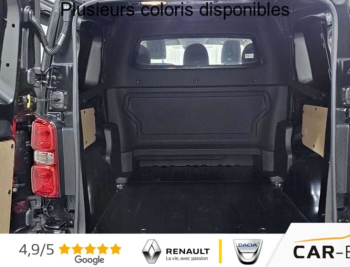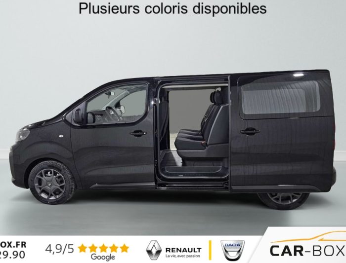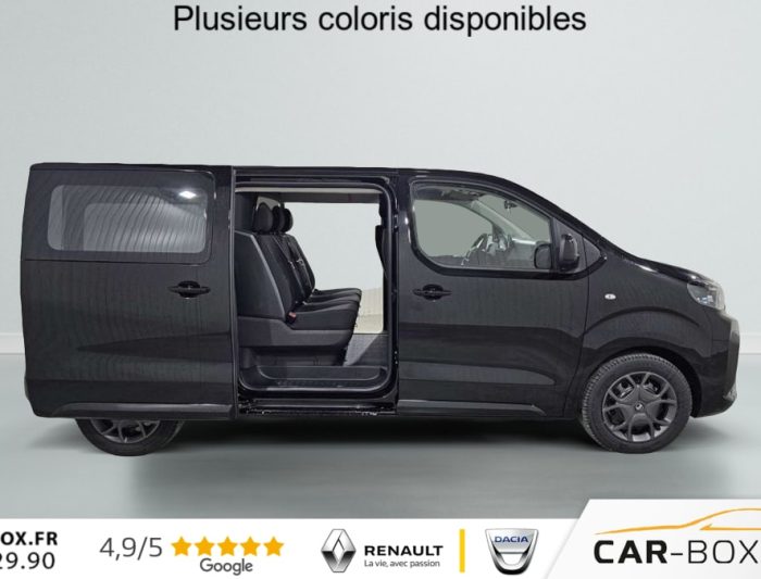 Airbags frontaux conducteur et passager, Régulateur - limiteur de vitesse, Aide au stationnement AR, Porte latérale coulissante droite, Airbags latéraux AV tête-thorax en rang 1, Siège passager individuel avec accoudoir (configuration 2 places AV) : option incluse (valeur : 0 Eur TTC), Porte latérale gauche coulissante : option incluse (valeur : 480 Eur TTC), Direction assistée, Rétroviseurs extérieurs électriques et dégivrants, Prédisposition "temoin de non-bouclage R2" (faisceau + afficheur), sans ceintures, Climatisation manuelle régulée en température, Jeu de clefs: 2 plips HF 3 boutons avec fonction selectivité, Kit de regonflage pneumatiques (Compresseur 12V + Cartouche de produit de colmatage), Pack Sécurité, Pack Sécurité : Assistance au maintien dans la voie Commutation automatique des feux de route Détection inattention conducteur Freinage automatique d'urgence avec alerte risque de collision Reconnaissance des panneaux de vitesse et recommandation , Pare-brise feuilleté acoustique, Revêtement de sol TPO en rangs 1 et 2, Cloison pleine PVC avec vitre plexiglass, Anneaux d'arrimage 4 répartis uniformément sur la zone de chargement, Détection de sous-gonflage indirecte, Siège conducteur individuel avec appui-tête réglable en hauteur et avec accoudoir Réglage : longueur, inclinaison, réhausse et rabattable (si 1 PLC) ou lombaire (si 2 PLC), Allumage automatique des feux de croisement et des essuie-vitres AV, Teinte métallisée : option incluse (valeur : 648 Eur TTC), ABS, AFU, ASR et ESP avec aide au démarrage en pente, Combiné numérique LCD noir et blanc, Lève-vitres AV électriques impulsionnels, Panneaux de garniture de type Isorel en rang 2 et 3, Garnitures pavillon habitacle en rang 2, Rétroviseur intérieur prismatique, Prise 12V (1200 W max) dans la boîte à gants, Sécurité enfants mécanique, Boucliers, Poignées de portes extérieures, Enjoliveur(s) de rail de porte latérale coulissante Baguettes latérales et Coques de rétroviseurs extérieurs noirs teintés masse, Portes AR battantes 50/50 tôlées à ouverture à 180°, Projecteurs halogène (H15) avec feux diurnes intégrés, Radio DAB Bluetooth avec écran tactile 5'' monochrome + 4 HP (2 tweeters + 2 woofers) + 1 prise USB-A, Sellerie Tissu bi-ton noir-gris, Pack Look extérieur : Baguettes latérales et coques de rétroviseurs extérieurs couleur Noir Perla Nera Boucliers couleur caisse Enjoliveur(s) de rail de porte latérale coulissante couleur caisse Jantes tôle 17" noires avec enjoliveurs Poignées de portes extérieures couleur caisse Prise 12V (120W max) dans la zone de chargement Projecteurs antibrouillard Rétroviseurs extérieurs rabattables électriquement : option incluse (valeur : 600 Eur TTC), Boîte automatique 8 vitesses, Commandes au volant du système audio et du régulateur-limiteur de vitesse, Boitier télématique appel d'urgence et d'assistance géolocalisés + offres de services connectés), Pack Caméra : Apple CarPlay et Android Auto sans fil Caméra de recul 180° avec affichage sur écran tactile 10'' HD couleur Ecran tactile 10'' HD couleur Planche de bord avec bandeau décor Liquid Palladium : option incluse (valeur : 960 Eur TTC), Pack Connectivité : Apple CarPlay et Android Auto sans fil Combiné numérique 10'' HD couleur Ecran tactile 10'' HD couleur Navigation 3D connectée avec reconnaissance vocale Cartographie Europe, Services de Navigation connectée TomTom (TomTomTraffic, Prix Carburant, Parkings, Météo, Recherche Locale) et Alertes Zones de Danger,Compatible avec Android Auto et Apple CarPlay) Planche de bord avec bandeau décor Liquid Palladium Prise 12V (120W max) dans la zone de chargement Projecteurs antibrouillard Reconnaissance vocale Rétroviseurs extérieurs rabattables électriquement : option incluse (valeur : 1 320 Eur TTC), Banquette fixe 3 places en rang 2 avec appui-tête réglables et 2 accoudoirs, position unique conforme à la réglementation fiscale, avec coffre de rangement sous les 3 assises accessible depuis la cabine et avec espace pour charge longue sous les 3 assises, Pack Visibilité : Prise 12V (120W max) dans la zone de chargement Projecteurs antibrouillard Rétroviseurs extérieurs rabattables électriquement : option incluse (valeur : 240 Eur TTC), Volant réglable en hauteur et en profondeur