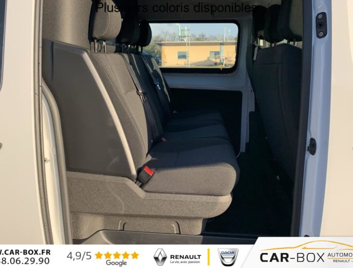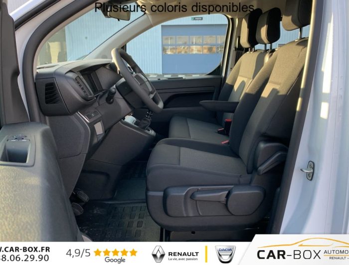 Airbags frontaux conducteur et passager, Régulateur - limiteur de vitesse, Aide au stationnement AR, Porte latérale coulissante droite, Rétroviseurs extérieurs électriques et dégivrants, Charge utile majorée, Vitres latérales surteintées en Rang 2, Prédisposition "temoin de non-bouclage R2" (faisceau + afficheur), sans ceintures, Climatisation manuelle régulée en température, Jeu de clefs: 2 plips HF 3 boutons avec fonction selectivité, Pack Sécurité : Reconnaissance des panneaux de vitesse et recommandation Freinage automatique d'urgence avec alerte risque de collision Assistance au maintien dans la voie Commutation automatique des feux de route Détection inattention conducteur, Pare-brise feuilleté acoustique, Roue de secours homogène (jante tôle noire) : option incluse (valeur : 216 Eur TTC), Revêtement de sol TPO en rangs 1 et 2, Vitres latérales fixes surteintées acoustiques en rang 2, Teinte de caisse opaque, Détection de sous-gonflage indirecte, Siège conducteur individuel avec appui-tête réglable en hauteur et avec accoudoir Réglage : longueur, inclinaison, réhausse , Allumage automatique des feux de croisement et des essuie-vitres AV, Vitres latérales fixes en rang 2, ABS, AFU, ASR et ESP avec aide au démarrage en pente, Connectivité via BTA (appel d'urgence et d'assistance localisées) SOS: Appel d'urgence automatique ou manuel par push SOS, Lève-vitres AV électriques impulsionnels, Banquette fixe 3 places en rang 2 avec appui-tête réglables et 2 accoudoirs, position unique conforme aux réglementations fiscales pays, avec coffre de rangement amovible sous assises gauche et centrale (accessible depuis habitacle) et avec zone pour charge longue sous assise droite (accessible par la zone de chargement), Prise 12V (1200 W max) dans la boîte à gants, Jantes tôle 16" grises avec cabochon noir, Portes AR battantes 50/50 tôlées à ouverture à 180°, Projecteurs halogène (H15) avec feux diurnes intégrés, Sellerie Tissu bi-ton noir-gris, Pack Caméra : Mirror Screen (compatible avec Android Auto et Apple CarPlay) Combiné numérique 10'' Ecran tactile 10'' HD Caméra de recul 180° : option incluse (valeur : 960 Eur TTC), Poignée(s) intérieure(s) de porte(s) latérale(s) coulissante(s)