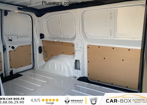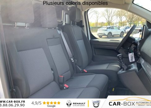 Airbags frontaux conducteur et passager, Régulateur - limiteur de vitesse, Aide au stationnement AR, Porte latérale coulissante droite, Cloison pleine tôlée, Revêtement de sol TPO dans l'habitacle, Direction assistée, Rétroviseurs extérieurs électriques et dégivrants, Climatisation manuelle régulée en température, Jeu de clefs: 2 plips HF 3 boutons avec fonction selectivité, Pack Sécurité : Reconnaissance des panneaux de vitesse et recommandation Freinage automatique d'urgence avec alerte risque de collision Assistance au maintien dans la voie Commutation automatique des feux de route Détection inattention conducteur, Pare-brise feuilleté acoustique, Siège conducteur individuel avec appui-tête réglable en hauteur et avec accoudoir Réglage : longueur, inclinaison, réhausse et lombaire, Roue de secours homogène (jante tôle noire) : option incluse (valeur : 216 Eur TTC), Banquette passager 2 places avec appuis-têtes réglables en hauteur avec rangement sous assise, Teinte de caisse opaque, Détection de sous-gonflage indirecte, Allumage automatique des feux de croisement et des essuie-vitres AV, Pack Visibilité : Rétroviseurs extérieurs rabattables électriquement Projecteurs antibrouillard : option incluse (valeur : 240 Eur TTC), ABS, AFU, ASR et ESP avec aide au démarrage en pente, Anneaux d'arrimage 6 répartis uniformément sur la zone de chargement, Lève-vitres AV électriques impulsionnels, Jantes tôle 16" grises avec cabochon noir, Pack Moduwork : Tablette écritoire Siège latéral droit relevable Trappe de charge longue sous banquette passagers Banquette passager 2 places avec appuis-têtes réglables en hauteur avec rangement sous assise : option incluse (valeur : 480 Eur TTC), Portes AR battantes 50/50 tôlées à ouverture à 180°, Projecteurs halogène (H15) avec feux diurnes intégrés, Sellerie Tissu bi-ton noir-gris, Pack Caméra : Caméra de recul 180° avec affichage sur écran tactile 10'' HD couleur : option incluse (valeur : 960 Eur TTC), Pack Connectivité : Reconnaissance vocale Mirror Screen (compatible avec Android Auto et Apple CarPlay) Navigation 3D connectée avec reconnaissance vocale Cartographie Europe Ecran tactile 10'' HD couleur : option incluse (valeur : 1 320 Eur TTC), Contrôle de la pression des pneus, Commandes au volant du système audio et du régulateur-limiteur de vitesse, Boitier télématique appel d'urgence, Volant réglable en hauteur et en profondeur, Condamnation centralisée des portes