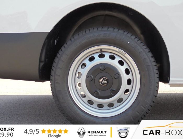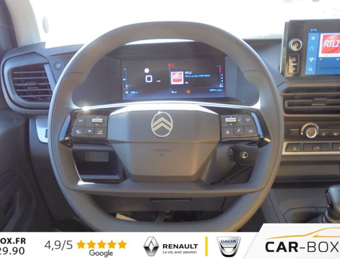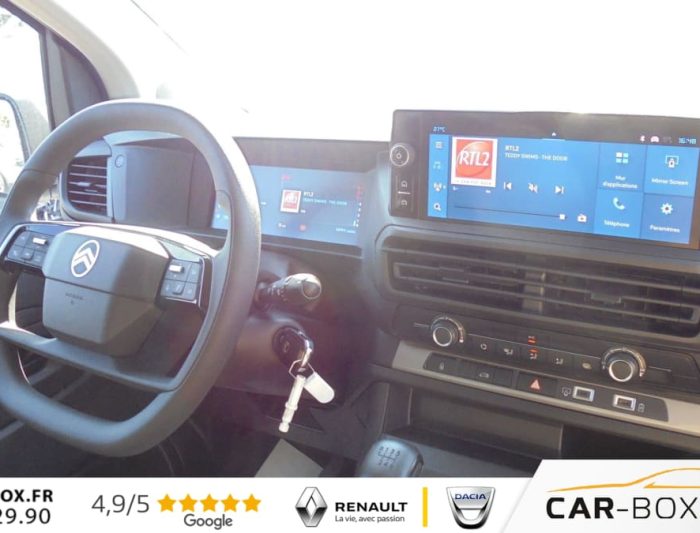 ABS, AFU, ASR et ESP avec aide au demarrage en pente, Aide au stationnement arriere, Airbags frontaux conducteur et passager, Airbags lateraux avant tete-thorax en rang 1, Allumage automatique des feux de croisement + Essuie-vitre avant auto, Anneaux d'arrimage 8 repartis uniformement sur la zone de chargement, Banquette passager 2 places avec appuis-tetes reglables en hauteur avec fonction Moduwork : option incluse (valeur : 480 Eur TTC), Boucliers avant et arriere teintes masse, Charge utile majoree, Climatisation manuelle, Cloison pleine tolee, Commandes radio au volant, Connectivite via BTA (appel d'urgence et d'assistance localisees + offres services connectes), Detection de sous-gonflage indirecte, Jantes acier 16'' avec cabochon noir, Kit de regonflage pneumatiques, Leve-vitres avant electriques impulsionnels, Mirror Screen , Pack Camera (Combine numerique 10'' couleur, VisioPark1 (vue zenithale arriere a 180) avec affichage sur ecran tactile + Aide au stationnement arriere) : option incluse (valeur : 1 080 Eur TTC), Pack Securite (Assistance au maintien dans la voie, Commutation automatique des feux de route, Detection inattention conducteur, Freinage automatique d'urgence avec alerte risque de collision, Reconnaissance des panneaux de vitesse et recommandation), Pack Visibilite (Projecteurs antibrouillard, Retroviseurs exterieurs rabattables electriquement) : option incluse (valeur : 240 Eur TTC), Porte laterale coulissante droite, Portes arriere battantes 50/50 tolees a ouverture a 180 avec verrou sur porte gauche uniquement, Prises 12V: dans la boite a gants et dans l'espace de chargement - Longueur 7m, Projecteurs antibrouillard, Projecteurs halogenes , Radio RCE (DAB), ecran tactile + Bluetooth , Regulateur et limiteur de vitesse, Retroviseurs exterieurs electriques et degivrants, Revetement de sol TPO dans l'habitacle, Siege conducteur avec reglage lombaires , Siege conducteur individuel avec appui-tete reglable en hauteur et avec accoudoir, Volant reglable en hauteur et en profondeur, 2 prises USB-C avant