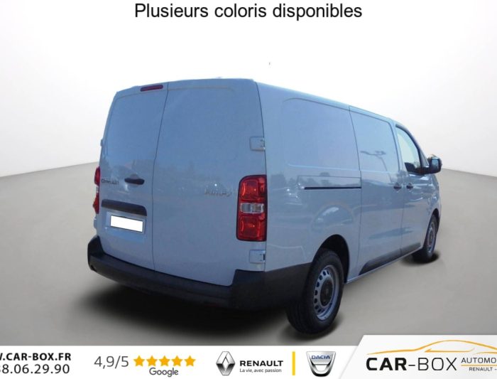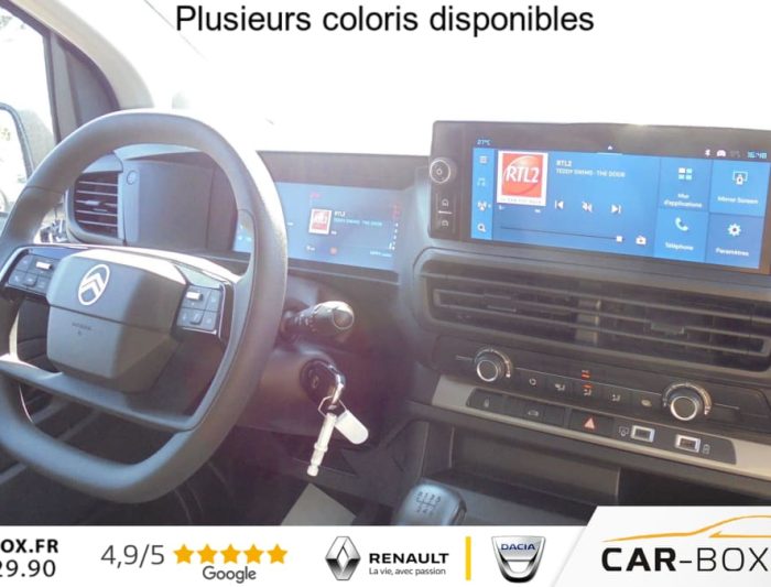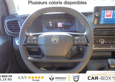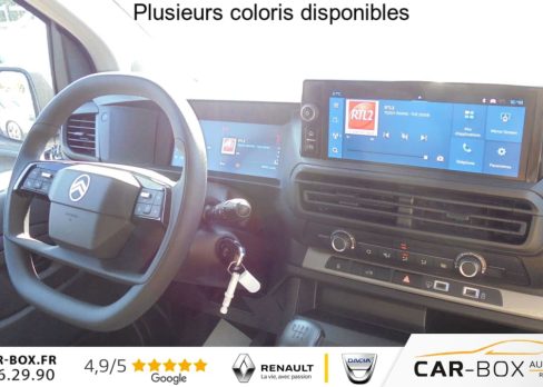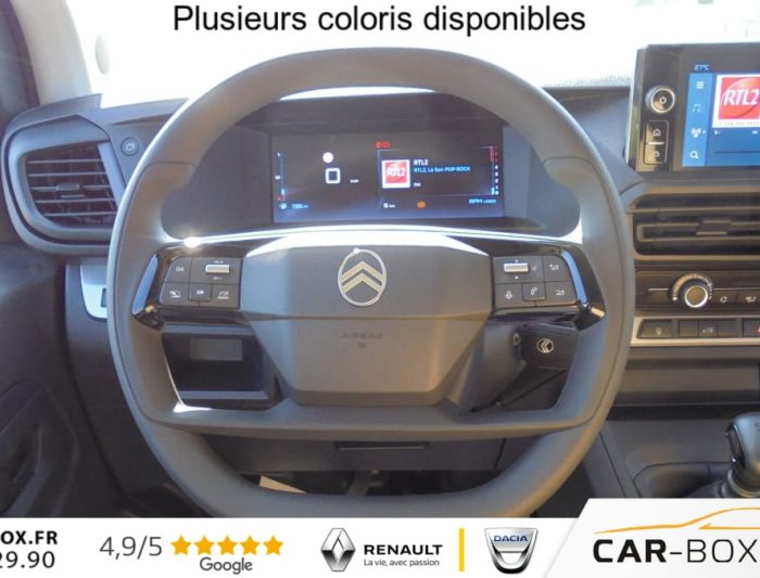ABS, AFU, ASR et ESP avec aide au demarrage en pente, Aide au stationnement arriere, Airbags frontaux conducteur et passager, Airbags lateraux avant tete-thorax en rang 1, Allumage automatique des feux de croisement + Essuie-vitre avant auto, Anneaux d'arrimage 8 repartis uniformement sur la zone de chargement, Banquette passager 2 places avec appuis-tetes reglables en hauteur avec fonction Moduwork : option incluse (valeur : 480 Eur TTC), Boucliers avant et arriere teintes masse, Charge utile majoree, Climatisation manuelle, Cloison pleine tolee, Commandes radio au volant, Connectivite via BTA (appel d'urgence et d'assistance localisees + offres services connectes), Detection de sous-gonflage indirecte, Jantes acier 16'' avec cabochon noir, Kit de regonflage pneumatiques, Leve-vitres avant electriques impulsionnels, Pack Camera (Combine numerique 10'' couleur, VisioPark1 (vue zenithale arriere a 180) avec affichage sur ecran tactile + Aide au stationnement arriere) : option incluse (valeur : 1 080 Eur TTC), Pack Securite (Assistance au maintien dans la voie, Commutation automatique des feux de route, Detection inattention conducteur, Freinage automatique d'urgence avec alerte risque de collision, Reconnaissance des panneaux de vitesse et recommandation), Pack Visibilite (Projecteurs antibrouillard, Retroviseurs exterieurs rabattables electriquement) : option incluse (valeur : 240 Eur TTC), Porte laterale coulissante droite, Portes arriere battantes 50/50 tolees a ouverture a 180 avec verrou sur porte gauche uniquement, Prises 12V: dans la boite a gants et dans l'espace de chargement - Longueur 7m, Projecteurs antibrouillard, Radio RCE (DAB), ecran tactile + Bluetooth , Regulateur et limiteur de vitesse, Retroviseurs exterieurs electriques et degivrants, Revetement de sol TPO dans l'habitacle, Siege conducteur avec reglage lombaires , Siege conducteur individuel avec appui-tete reglable en hauteur et avec accoudoir, Volant reglable en hauteur et en profondeur, 2 prises USB-C avant
