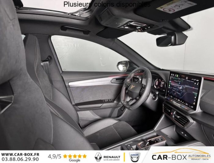Climatisation automatique tri-zone, Digital Cockpit 10,25, Jantes alliage 18, Jantes en alliage 18, Roue de secours compacte 18, Système d'info-divertissement avec écran tactile HD 12,9, Hayon électrique mains-libres ''Virtual Pedal'', Capteur de pluie et de luminosité, Vitres AR surteintées, Seuils de porte CUPRA rétro-éclairés, Ciel de pavillon Noir, Radio numérique DAB, Lane Assist Plus, Extension de garantie 1an / 30 000 km : option incluse (valeur : 328 Eur TTC), Caméra de recul, CUPRA Box, Toit ouvrant panoramique : option incluse (valeur : 1 150 Eur TTC), Pare-soleils avec miroirs de courtoisie éclairés, eCall - appel d'urgence, Fixations ISOFIX avec Top-Tether à l'AR, Direction dynamique, Aide au stationnement AV/AR, Rétroviseur intérieur électrochrome, Airbags latéraux, rideaux et central, Double sortie d'échappement Noire stylisée, Régulateur de vitesse adaptatif ACC, Smart Ambient Light (éclairage d'ambiance intérieur intelligent), Accès et démarrage mains-libres, CUPRA Connect, Kit de sécurité CUPRA, Front Assist avec détection des piétons et des cyclistes, Sign Assist - reconnaissance des panneaux de signalisation, Entourage de vitres et rails de toit Noir Piano, Peinture métallisée : option incluse (valeur : 800 Eur TTC), Peinture vernie, Full Link sans fil ( Android Auto + Apple CarPlay), Lampes de lecture LED à l'AV et à l'AR, Feux de route intelligents (Light Assist), Connectivité 4x USB-C et Bluetooth, Projecteurs full LED avec signature lumineuseTri-LED, Détection de fatigue et somnolence, Bandeau AR ''Infinite Light'' intégrant le logo CUPRA lumineux, avec signature lumineuse Tri-LED et cérémonie de bienvenue, Volant Supersports CUPRA en cuir avec boutons satellites, chauffant, avec palettes de changement de rapport, Système audio à 6 HP avec contrôle vocal, Pack Intérieur Dark Alu avec inserts cuivrés, Couleur contrastante Noir Obsidien (bas de caisses, entrées d'air AV, diffuseur, élargisseurs d'ailes et coques de rétroviseurs), Design intérieur Pure - Sièges sports bimatière textile et TEP Noir Asphalte - Planche de bord noire surpiquée avec inserts Dark Alu - Contre-portes en TEP noir surpiqués - Sièges conducteur et passager avec réglage manuel en hauteur et lombaire, Aide au maintien dans la voie (Lane Assist), Dossiers AR rabattables 2/3 - 1/3 et trappe à skis, Eclairage de bienvenue avec projection du logo CUPRA au sol et éclairage d'accompagnement, Projecteurs anti-brouillard triangulaires avec éclairage d'intersection, Connectivity Box - Amplification du signal et chargeur à induction, ABS, Boîte de vitesse séquentielle, Système de contrôle de la pression des pneus, Verrouillage centralisée, Vitres électriques AV, Contrôle de la traction (TCS), Accoudoir central AV réglable en hauteur et profondeur, Assistant d'intersection (Cross Traffic Assist)
