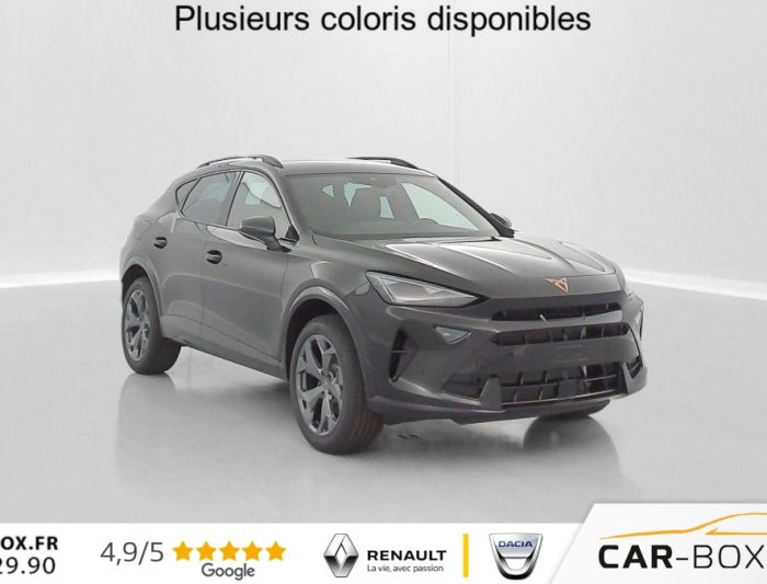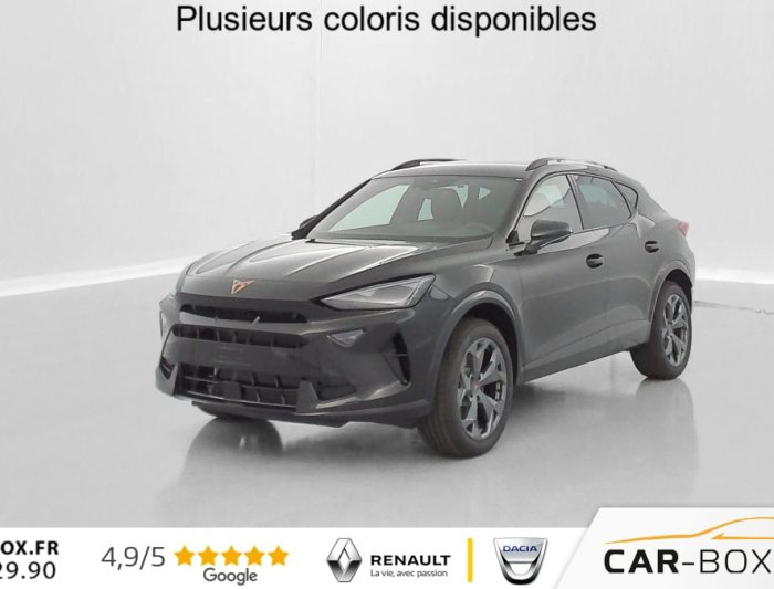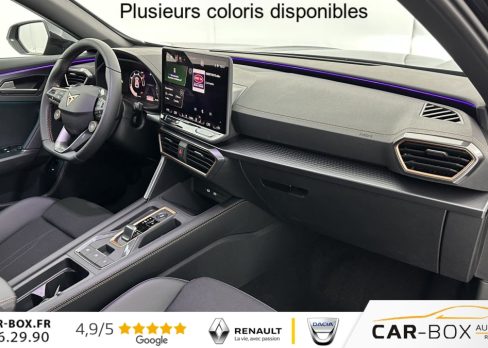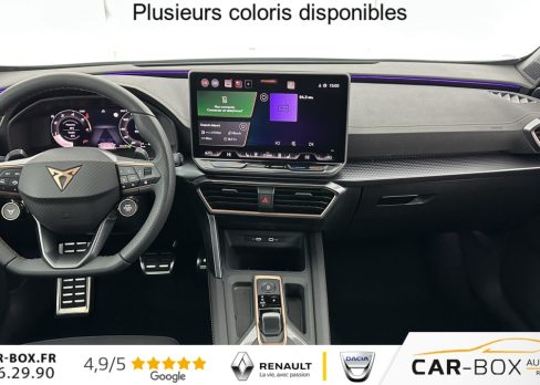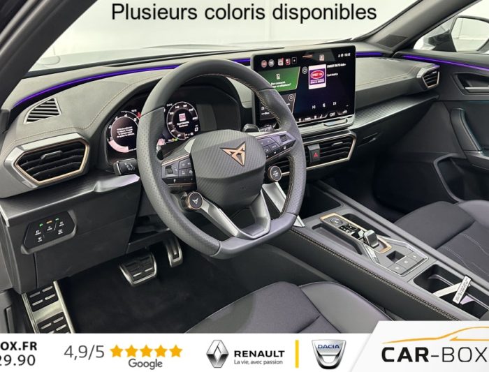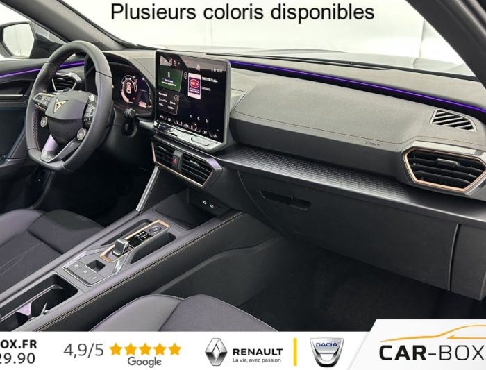 Accès et démarrage mains-libres, Aide au maintien dans la voie (Lane Assist), Aide au stationnement avant et arrière avec Caméra de recul, Bandeau arrière "Infinite Light" intégrant le logo CUPRA lumineux, avec signature lumineuse Tri-LED, Capteur de pluie et de luminosité, Climatisation automatique tri-zone « Climatronic », Connectivity Box avec chargeur à induction, Couleur contrastante Noir Obsidien, Digital Cockpit 10,25", Double-sortie d'échappement noire stylisée (version thermique), eCall - appel d'urgence, Éclairage de bienvenue avec projection du logo CUPRA au sol, Feux de route intelligents (Light Assist), Front Assist avec détetion de piétons et cyclistes, Full Link sans fil (Apple CarPlay® et Android Auto®), Hayon électrique mains-libres, Jantes 18" Tempest, Pack intérieur Dark Alu avec inserts cuivrés, Peinture métallisée : : option incluse (valeur : 760 Eur TTC), Projecteurs anti-brouillard triangulaires avec éclairage d'intersection, Projecteurs Full LED avec signature lumineuse Tri-LED, Rails de toit et entourages de vitres Noir Piano, Reconnaissance des panneux de signalisation (Sign Assist), Régulateur de vitesse adaptatif ACC, Rétroviseur intérieur électrochrome, Seuils de porte CUPRA rétro-éclairés, Smart Ambient Light - éclairage d'ambiance intérieur intelligent, Système d'info-divertissement avec écran tactile HD 12,9" (avec Radio DAB), Vitres arrière surteintées, Volant Supersports CUPRA en cuir avec boutons satellites, chauffant, avec palettes