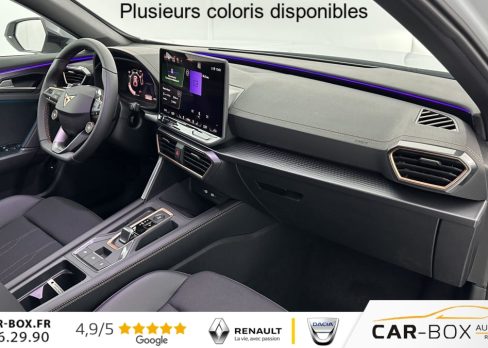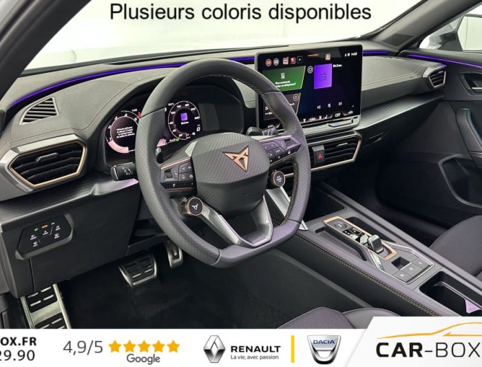 Accès et démarrage mains-libres, Aide au maintien dans la voie (Lane Assist), Aide au stationnement avant et arrière avec Caméra de recul, Bandeau arrière "Infinite Light" intégrant le logo CUPRA lumineux, avec signature lumineuse Tri-LED, Capteur de pluie et de luminosité, Climatisation automatique tri-zone « Climatronic », Connectivity Box avec chargeur à induction, Couleur contrastante Noir Obsidien, Digital Cockpit 10,25", Double-sortie d'échappement noire stylisée (version thermique), eCall - appel d'urgence, Éclairage de bienvenue avec projection du logo CUPRA au sol, Feux de route intelligents (Light Assist), Front Assist avec détetion de piétons et cyclistes, Full Link sans fil (Apple CarPlay® et Android Auto®), Hayon électrique mains-libres, Jantes 18" Tempest, Pack intérieur Dark Alu avec inserts cuivrés, Peinture métallisée : : option incluse (valeur : 760 Eur TTC), Projecteurs anti-brouillard triangulaires avec éclairage d'intersection, Projecteurs Full LED avec signature lumineuse Tri-LED, Rails de toit et entourages de vitres Noir Piano, Reconnaissance des panneux de signalisation (Sign Assist), Régulateur de vitesse adaptatif ACC, Rétroviseur intérieur électrochrome, Seuils de porte CUPRA rétro-éclairés, Smart Ambient Light - éclairage d'ambiance intérieur intelligent, Système d'info-divertissement avec écran tactile HD 12,9" (avec Radio DAB), Vitres arrière surteintées, Volant Supersports CUPRA en cuir avec boutons satellites, chauffant, avec palettes