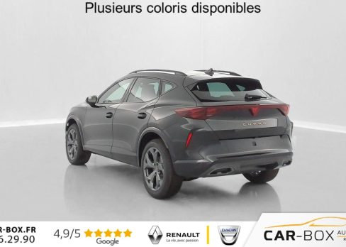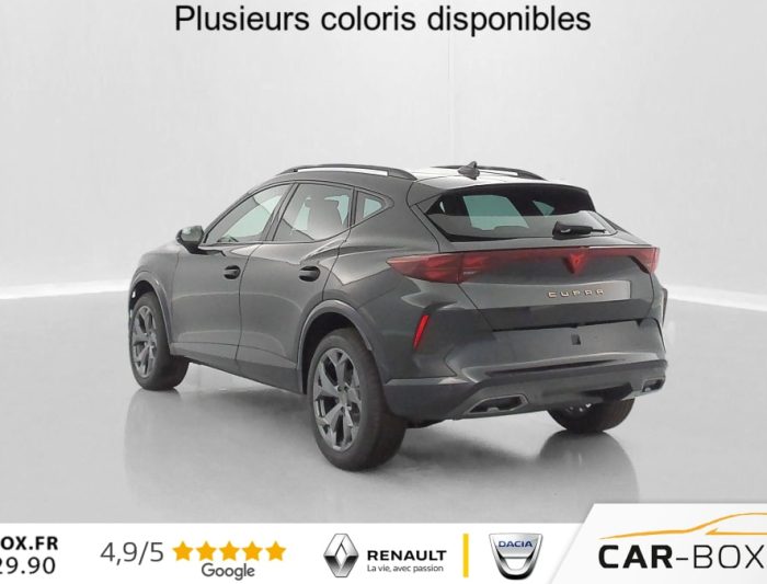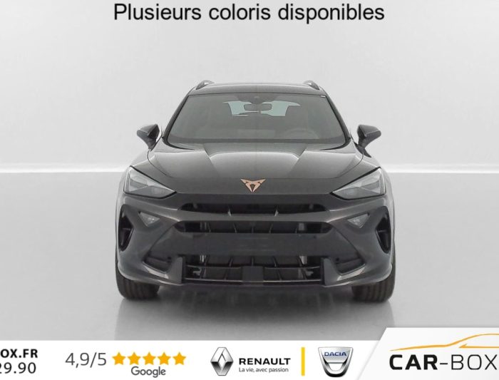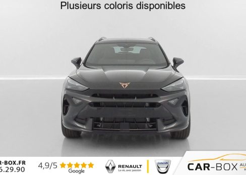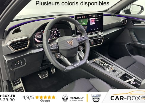 Accès et démarrage mains-libres, Aide au maintien dans la voie (Lane Assist), Aide au stationnement avant et arrière avec Caméra de recul, Bandeau arrière "Infinite Light" intégrant le logo CUPRA lumineux, avec signature lumineuse Tri-LED, Capteur de pluie et de luminosité, Climatisation automatique tri-zone « Climatronic », Connectivity Box avec chargeur à induction, Couleur contrastante Noir Obsidien, Digital Cockpit 10,25", Double-sortie d'échappement noire stylisée (version thermique), eCall - appel d'urgence, Éclairage de bienvenue avec projection du logo CUPRA au sol, Feux de route intelligents (Light Assist), Front Assist avec détetion de piétons et cyclistes, Full Link sans fil (Apple CarPlay® et Android Auto®), Hayon électrique mains-libres, Jantes 18" Tempest, Pack intérieur Dark Alu avec inserts cuivrés, Peinture métallisée : : option incluse (valeur : 760 Eur TTC), Projecteurs anti-brouillard triangulaires avec éclairage d'intersection, Projecteurs Full LED avec signature lumineuse Tri-LED, Rails de toit et entourages de vitres Noir Piano, Reconnaissance des panneux de signalisation (Sign Assist), Régulateur de vitesse adaptatif ACC, Rétroviseur intérieur électrochrome, Seuils de porte CUPRA rétro-éclairés, Smart Ambient Light - éclairage d'ambiance intérieur intelligent, Système d'info-divertissement avec écran tactile HD 12,9" (avec Radio DAB), Vitres arrière surteintées, Volant Supersports CUPRA en cuir avec boutons satellites, chauffant, avec palettes