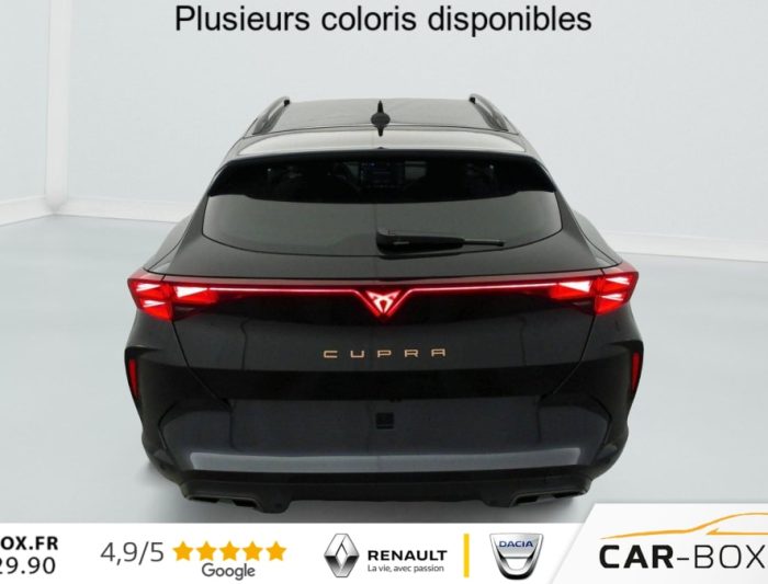 Pack "Hiver" : Sièges AV chauffants : option incluse (valeur : 395 Eur TTC), Système d'alarme antivol, dispositif de surveillance de l'habitacle, Back-up- Horn et protection antiremorquage, Hayon électrique mains-libres ''Virtual Pedal'', Capteur de pluie et de luminosité, Vitres AR surteintées, Seuils de porte CUPRA rétro-éclairés, Lane Assist - aide au maintien dans la voie, Ciel de pavillon Noir, Radio numérique DAB, Pré-installation pour attelage : option incluse (valeur : 190 Eur TTC), Caméra de recul, Pare-soleils avec miroirs de courtoisie éclairés, eCall - appel d'urgence, Fixations ISOFIX avec Top-Tether à l'AR, Direction dynamique, Climatisation automatique tri-zone "Climatronic", Aide au stationnement AV et AR, Rétroviseur intérieur électrochrome, Airbags latéreaux, rideaux et central, Double sortie d'échappement Noire stylisée, Régulateur de vitesse adaptatif ACC, Smart Ambient Light (éclairage d'ambiance intérieur intelligent), Accès et démarrage mains-libres, Front Assist avec détection des piétons et des cyclistes, Sign Assist - reconnaissance des panneaux de signalisation, Digital Cockpit 10,25'', Entourage de vitres et rails de toit Noir Piano, Peinture métallisée : option incluse (valeur : 760 Eur TTC), Full Link sans fil ( Android Auto + Apple CarPlay), Lampes de lecture LED à l'AV et à l'AR, Feux de route intelligents (Light Assist), Accoudoir central AV, Jantes en alliage 19" Sandstorm usinées : option incluse (valeur : 900 Eur TTC), Détection de fatigue et somnolence, Bandeau AR ''Infinite Light'' intégrant le logo CUPRA lumineux avec signature lumineuse Tri-LED et cérémonie de bienvenue, Volant Supersports CUPRA en cuir avec boutons satellites, chauffant avec palettes de changement de rapport, Système audio à 6 HP avec contrôle vocal, Couleur contrastante Noir Obsidien (bas de caisses, entrées d'air AV, diffuseur, élargisseurs d'ailes et coques de rétroviseurs), Système d'info-divertissement avec écran tactile HD 12,9'' et touches de commandes tactiles rétro-éclairées, Pack Advanced Drive : Régulation adaptative du châssis DCC Projecteurs Matrix LED avec signature lumineuse Tri-LED et cérémonie de bienvenue : option incluse (valeur : 1 235 Eur TTC), Pack Intelligent Drive Full : Top View Camera 360° Lane Assist Plus Pre-Crash : système de prévision des collisions Side Assist, Exit Assist et Exit Warning Travel Assist NaviSystem+ : système de navigation Europe 3D Intelligent Park Assist - système d'aide active au stationnement CUPRA Connect Plus 3 ans : option incluse (valeur : 1 440 Eur TTC), Dossiers AR rabattables 2/3 - 1/3 , Eclairage de bienvenue avec projection du logo CUPRA au sol et éclairage d'accompagnement, Projecteurs anti-brouillard triangulaires avec éclairage d'intersection, Connectivity Box - Amplification du signal et chargeur à induction