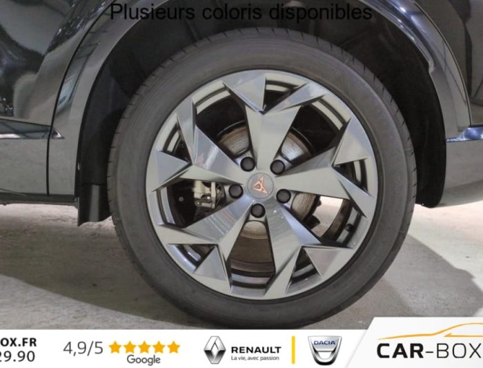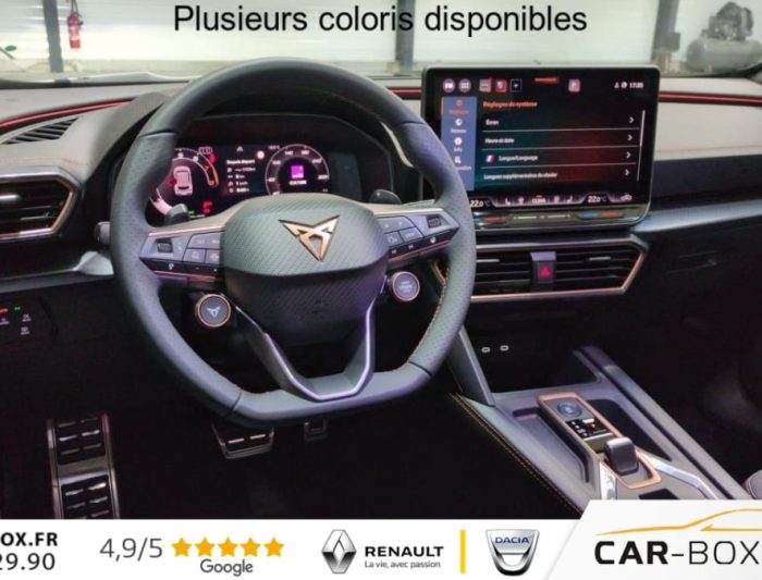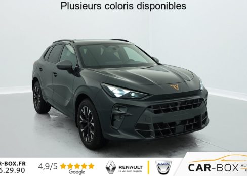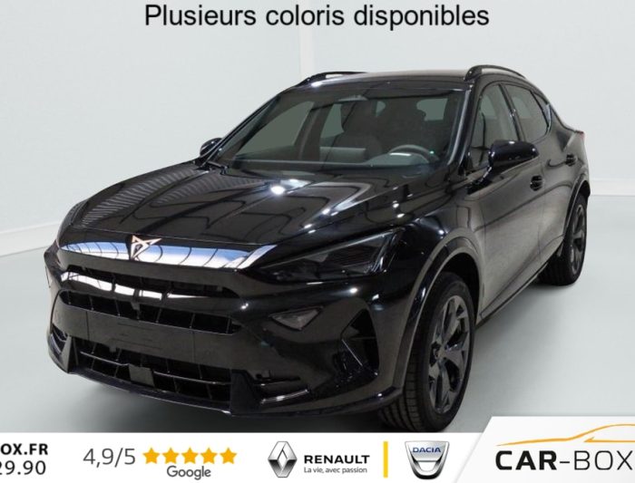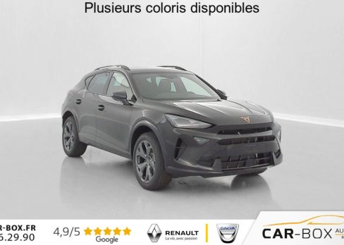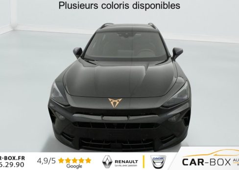 NOUVEAU 1.5 eTSI Hybrid 150 ch DSG7 V, essence, noir, 07/08/2025, ABS, Accès et démarrage mains-libres, Accoudoir central AV réglable en hauteur et profondeur, Aide au maintien dans la voie (Lane Assist), Aide au stationnement AV et AR, Airbags latéreaux, rideaux et central, Alarme antivol, Assistant d’intersection (Cross Traffic Assist), Bandeau AR  »Infinite Light » intégrant le logo CUPRA lumineux avec signature lumineuse Tri-LED et cérémonie de bienvenue, Boîte de vitesse séquentielle, Caméra de recul, Capteur de pluie et de luminosité, Ciel de pavillon Noir, Climatisation automatique tri-zone "Climatronic", Connectivité 4x USB-C et Bluetooth, Connectivity Box – Amplification du signal et chargeur à induction, Contrôle de la traction (TCS), Contrôle électronique de la trajectoire, Couleur contrastante Noir Obsidien (bas de caisses, entrées d’air AV, diffuseur, élargisseurs d’ailes et coques de rétroviseurs), CUPRA Box, CUPRA Connect, Design intérieur Pure – Sièges sports bimatière textile et TEP Noir Asphalte – Planche de bord noire surpiquée avec inserts Dark Alu – Contre-portes en TEP noir surpiqués – Sièges conducteur et passager avec réglage manuel en hauteur et lombaire, Détection de fatigue et somnolence, Digital Cockpit 10, 25 », Direction dynamique, Dossiers AR rabattables 2/3 – 1/3 et trappe à skis, Double sortie d’échappement Noire stylisée, eCall – appel d’urgence, Eclairage de bienvenue avec projection du logo CUPRA au sol et éclairage d’accompagnement, Entourage de vitres et rails de toit Noir Piano, Extension de garantie 3 ans / 100 000 km, Feux de route intelligents (Light Assist), Fixations ISOFIX avec Top-Tether à l’AR, Front Assist avec détection des piétons et des cyclistes, Full Link sans fil ( Android Auto + Apple CarPlay), Hayon électrique mains-libres  »Virtual Pedal », Jantes alliage 18" Tempest, Kit de sécurité CUPRA, Lampes de lecture LED à l’AV et à l’AR, Lane Assist Plus, Pack Intérieur Dark Alu avec inserts cuivrés, Pare-soleils avec miroirs de courtoisie éclairés, Peinture métallisée Noir Minuit, Pré-installation pour attelage, Projecteurs anti-brouillard triangulaires avec éclairage d’intersection, Projecteurs full LED avec signature lumineuseTri-LED, Radio numérique DAB, Régulateur de vitesse adaptatif ACC, Rétroviseur intérieur électrochrome, Rétroviseurs extérieurs électriques, dégivrants, et rabbattales électriquement, Seuils de porte CUPRA rétro-éclairés, Sièges avant chauffants, Sign Assist – reconnaissance des panneaux de signalisation, Smart Ambient Light (éclairage d’ambiance intérieur intelligent), Système audio à 6 HP avec contrôle vocal, Système de contrôle de la pression des pneus, Système d’info-divertissement avec écran tactile HD 12, 9 » et touches de commandes tactiles rétro-éclairées, Verrouillage centralisée, Vitres AR surteintées, Vitres électriques AV, Volant Supersports CUPRA en cuir avec boutons satellites, chauffant avec palettes de changement de rapport, Peinture métallisée : option incluse (valeur : 760 Eur TTC)