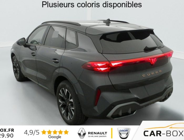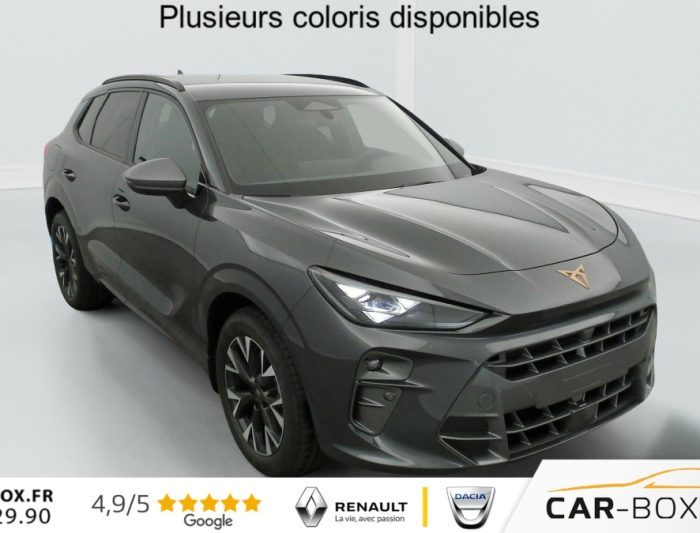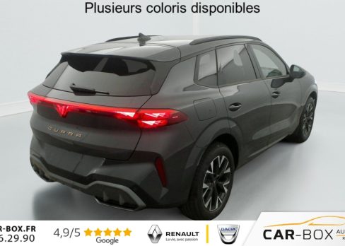 1.5 eHybrid 204 ch DSG6 V, hybride, gris, 29/09/2025, Sièges avant chauffant réglable séparément : option incluse (valeur : 320 Eur TTC), Crochet d’attelage escamotable électriquement : option incluse (valeur : 845 Eur TTC), Hayon électrique mains-libres  »Virtual Pedal », Capteur de pluie et de luminosité, Vitres AR surteintées, Seuils de porte CUPRA rétro-éclairés, Connectivity Box avec chargeur à induction, Reconnaissance des panneaux de signalisation (Sign Assist), Ciel de pavillon Noir, Radio numérique DAB, Eclairage de bienvenue avec projection du logo CUPRA au sol, Caméra de recul, Dossiers AR rabattables 2/3 – 1/3, Fixations ISOFIX avec Top-Tether à l’AR, Climatisation automatique tri-zone "Climatronic", Aide au stationnement AV et AR, Rétroviseur intérieur électrochrome, Airbags latéreaux, rideaux et central, Câble de recharge sur prise domestique, Régulateur de vitesse adaptatif ACC, Smart Ambient Light (éclairage d’ambiance intérieur intelligent), Kit de sécurité CUPRA, Peinture métallisée : option incluse (valeur : 760 Eur TTC), Full Link sans fil ( Android Auto + Apple CarPlay), Connectivité 4x USB-C et Bluetooth, Projecteurs full LED avec signature lumineuseTri-LED, Accoudoir central AV, Détection de fatigue et somnolence, Bandeau AR  »Infinite Light » intégrant le logo CUPRA lumineux avec signature lumineuse Tri-LED et cérémonie de bienvenue, Volant Supersports CUPRA en cuir avec boutons satellites, chauffant avec palettes de changement de rapport, Système d’info-divertissement avec écran tactile HD 12, 9 » et touches de commandes tactiles rétro-éclairées, Front Assist avec détection des piétons et cyclistes, Jantes 18 » Atomic usinées, Design Intérieur Deep Ocean (sièges baquets TEP + textile Bleu Acier) – Logos CUPRA estampés sur les appuie-têtes – Planche de bord bleu acier texturée avec aérateurs cuivrés – Contre-portes en TEP noir texturé – Ciel de pavillon noir – Sièges conducteur et passager avec réglage manuel en hauteur et lombaire, Câble de recharge Mode 3 type 2 : option incluse (valeur : 200 Eur TTC), Projecteurs anti-brouillard avec éclairage d’intersection et éclairage d’accompagnement, Alarme antivol avec fonction SAFE, Rails de toit Noir, Système audio à 9 HP avec contrôle vocal, Aide au maintien dans la voie (Lane Assist), Accès et démarrage mains-libres, Banquette AR coulissante 2/3 – 1/3, Digital Cockpit 10, 25" Medium avec 2 affichages personnalisables