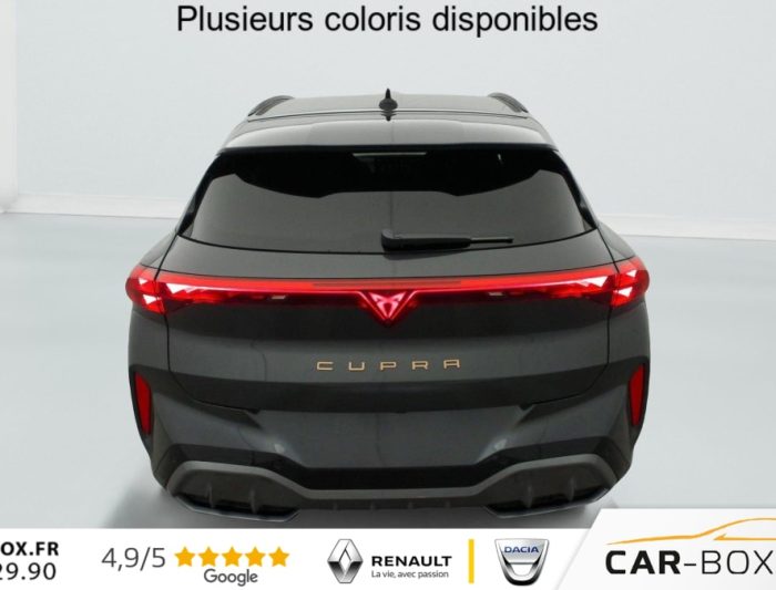 Sièges avant chauffant réglable séparément : option incluse (valeur : 320 Eur TTC), Crochet d'attelage escamotable électriquement : option incluse (valeur : 845 Eur TTC), Hayon électrique mains-libres ''Virtual Pedal'', Capteur de pluie et de luminosité, Vitres AR surteintées, Seuils de porte CUPRA rétro-éclairés, Connectivity Box avec chargeur à induction, Reconnaissance des panneaux de signalisation (Sign Assist), Ciel de pavillon Noir, Radio numérique DAB, Eclairage de bienvenue avec projection du logo CUPRA au sol, Caméra de recul, Dossiers AR rabattables 2/3 - 1/3, Fixations ISOFIX avec Top-Tether à l'AR, Climatisation automatique tri-zone "Climatronic", Aide au stationnement AV et AR, Rétroviseur intérieur électrochrome, Airbags latéreaux, rideaux et central, Câble de recharge sur prise domestique, Régulateur de vitesse adaptatif ACC, Smart Ambient Light (éclairage d'ambiance intérieur intelligent), Kit de sécurité CUPRA, Peinture métallisée : option incluse (valeur : 760 Eur TTC), Full Link sans fil ( Android Auto + Apple CarPlay), Connectivité 4x USB-C et Bluetooth, Projecteurs full LED avec signature lumineuseTri-LED, Accoudoir central AV, Détection de fatigue et somnolence, Bandeau AR ''Infinite Light'' intégrant le logo CUPRA lumineux avec signature lumineuse Tri-LED et cérémonie de bienvenue, Volant Supersports CUPRA en cuir avec boutons satellites, chauffant avec palettes de changement de rapport, Système d'info-divertissement avec écran tactile HD 12,9'' et touches de commandes tactiles rétro-éclairées, Front Assist avec détection des piétons et cyclistes, Jantes 18'' Atomic usinées, Design Intérieur Deep Ocean (sièges baquets TEP + textile Bleu Acier) - Logos CUPRA estampés sur les appuie-têtes - Planche de bord bleu acier texturée avec aérateurs cuivrés - Contre-portes en TEP noir texturé - Ciel de pavillon noir - Sièges conducteur et passager avec réglage manuel en hauteur et lombaire, Câble de recharge Mode 3 type 2 : option incluse (valeur : 200 Eur TTC), Projecteurs anti-brouillard avec éclairage d'intersection et éclairage d'accompagnement, Alarme antivol avec fonction SAFE, Rails de toit Noir, Système audio à 9 HP avec contrôle vocal, Aide au maintien dans la voie (Lane Assist), Accès et démarrage mains-libres, Banquette AR coulissante 2/3 - 1/3, Digital Cockpit 10,25" Medium avec 2 affichages personnalisables