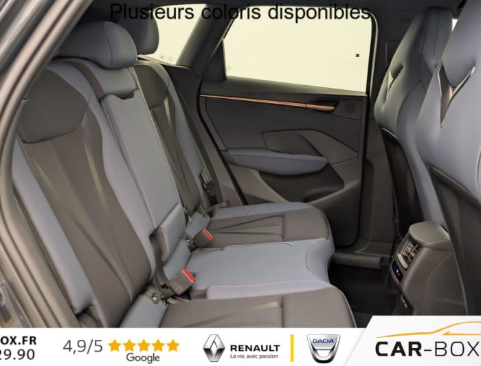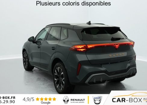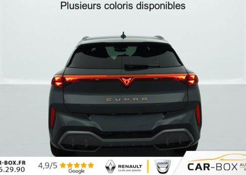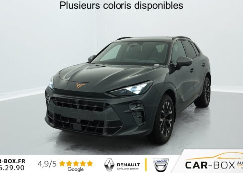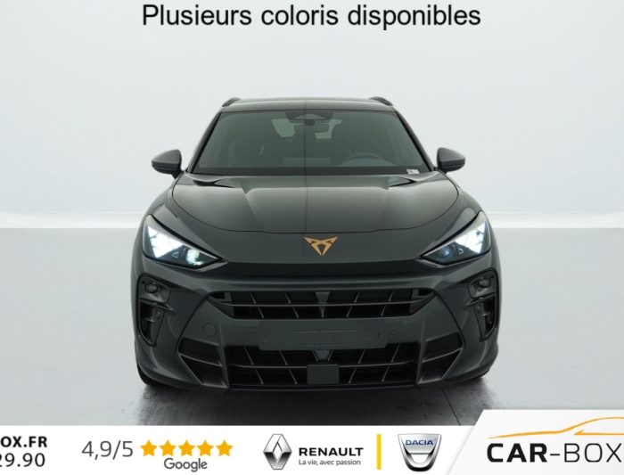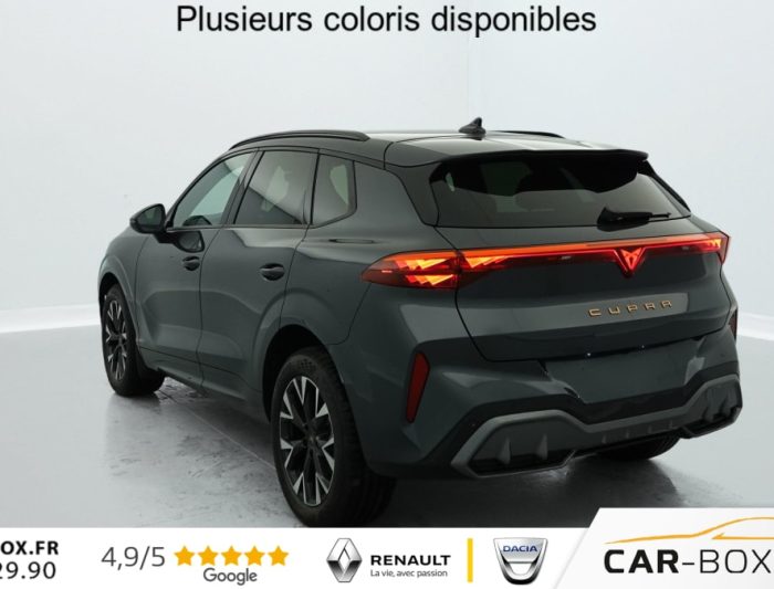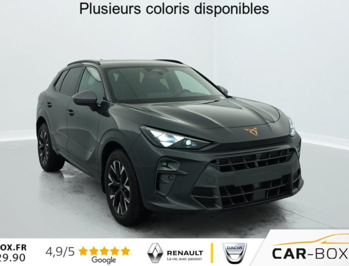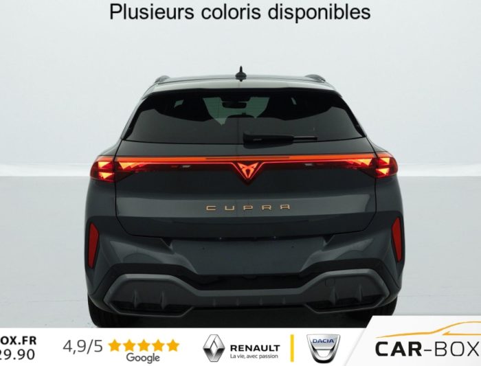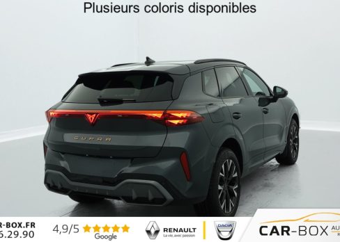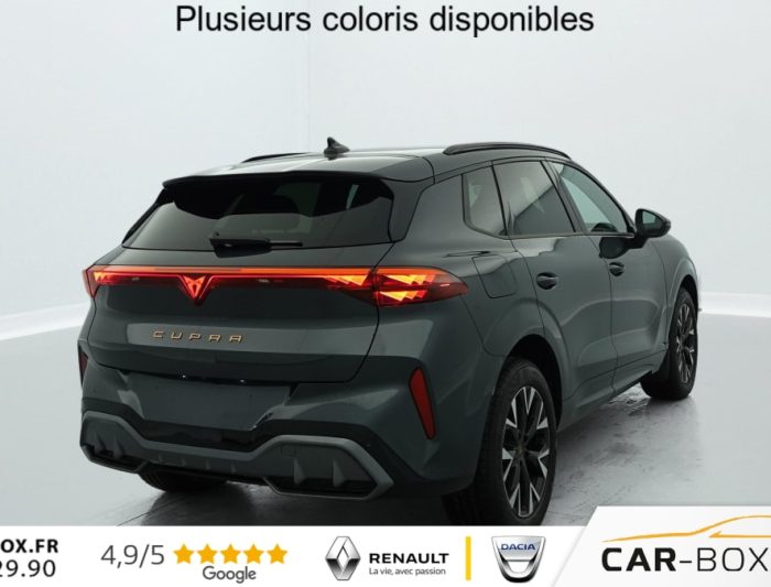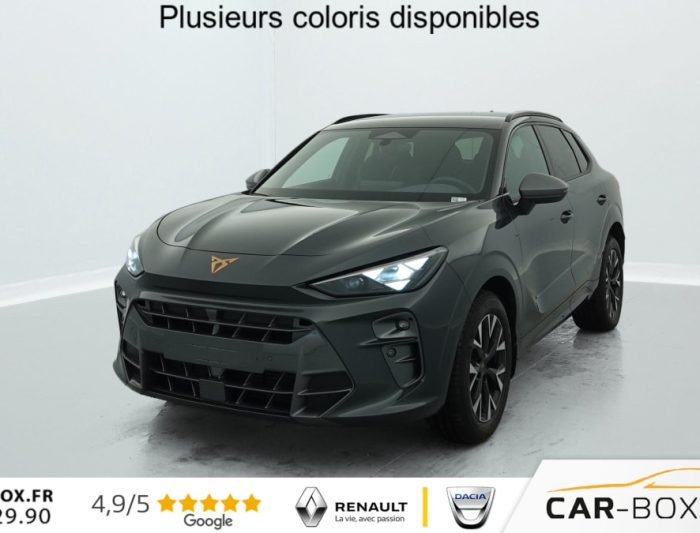 1.5 eTSI Hybrid 150 ch DSG7 V, hybride, gris, 29/04/2025, Rétroviseurs extérieurs réglables, rabatable électriquement, dégivant, avec abaissement passager avant, Sièges avant chauffant réglable séparément : option incluse (valeur : 350 Eur TTC), Hayon électrique mains-libres  »Virtual Pedal », Capteur de pluie et de luminosité, Vitres AR surteintées, Seuils de porte CUPRA rétro-éclairés, Connectivity Box avec chargeur à induction, Reconnaissance des panneaux de signalisation (Sign Assist), Ciel de pavillon Noir, Radio numérique DAB, Eclairage de bienvenue avec projection du logo CUPRA au sol, Caméra de recul, Dossiers AR rabattables 2/3 – 1/3, Fixations ISOFIX avec Top-Tether à l’AR, Climatisation automatique tri-zone "Climatronic", Aide au stationnement AV et AR, Rétroviseur intérieur électrochrome, Airbags latéreaux, rideaux et central, Régulateur de vitesse adaptatif ACC, Smart Ambient Light (éclairage d’ambiance intérieur intelligent), Peinture métallisée : option incluse (valeur : 760 Eur TTC), Full Link sans fil ( Android Auto + Apple CarPlay), Connectivité 4x USB-C et Bluetooth, Accoudoir central AV, Détection de fatigue et somnolence, Bandeau AR  »Infinite Light » intégrant le logo CUPRA lumineux avec signature lumineuse Tri-LED et cérémonie de bienvenue, Volant Supersports CUPRA en cuir avec boutons satellites, chauffant avec palettes de changement de rapport, Système d’info-divertissement avec écran tactile HD 12, 9 » et touches de commandes tactiles rétro-éclairées, Front Assist avec détection des piétons et cyclistes, Jantes 18 » Atomic usinées, Design Intérieur Deep Ocean (sièges baquets TEP + textile Bleu Acier) – Logos CUPRA estampés sur les appuie-têtes – Planche de bord bleu acier texturée avec aérateurs cuivrés – Contre-portes en TEP noir texturé – Ciel de pavillon noir – Sièges conducteur et passager avec réglage manuel en hauteur et lombaire, Pack Performance : Dynamic Chassis Control – DCC Feux Matrix LED Ultra : option incluse (valeur : 1 500 Eur TTC), Projecteurs anti-brouillard avec éclairage d’intersection et éclairage d’accompagnement, Alarme antivol avec fonction SAFE, Rails de toit Noir, Système audio à 9 HP avec contrôle vocal, Aide au maintien dans la voie (Lane Assist), Accès et démarrage mains-libres, Banquette AR coulissante 2/3 – 1/3, Digital Cockpit 10, 25" Medium avec 2 affichages personnalisables