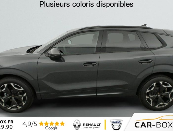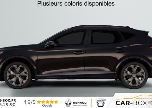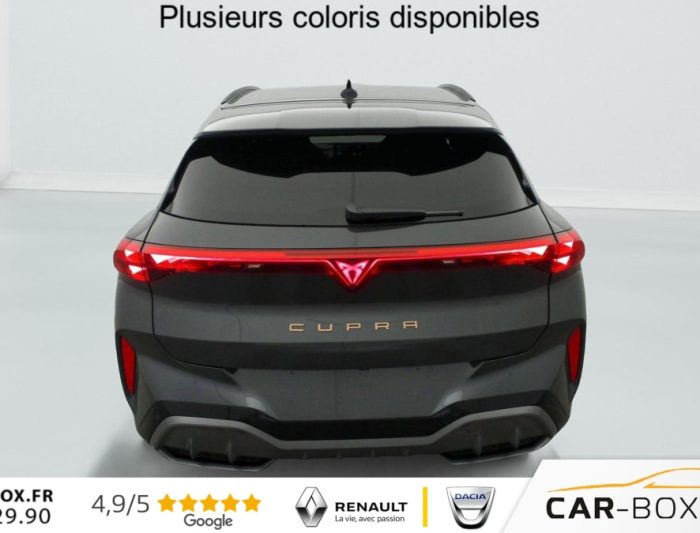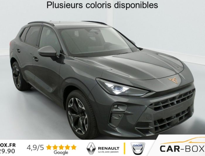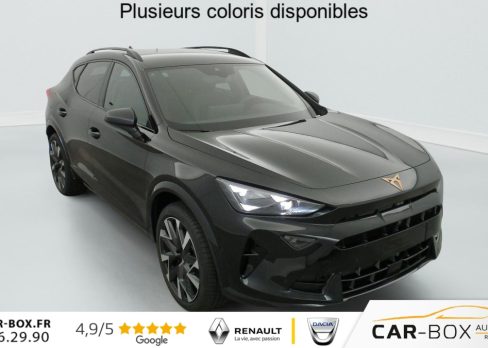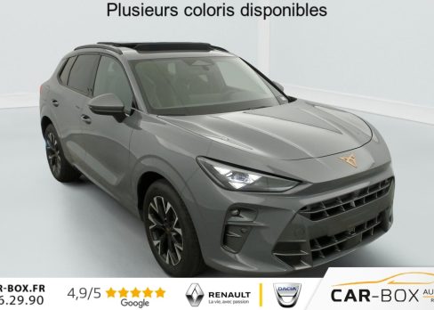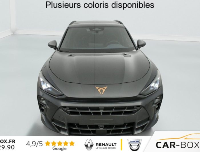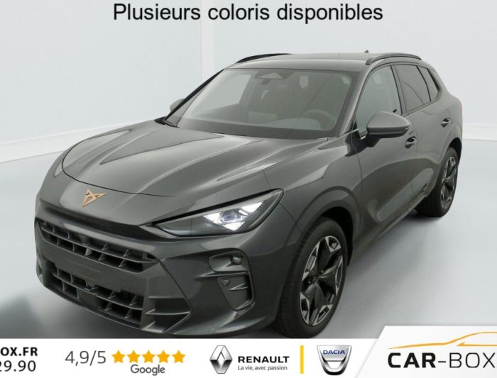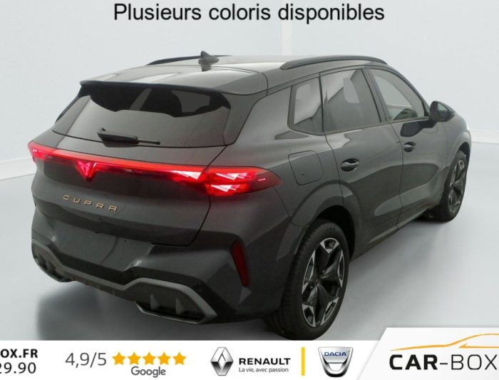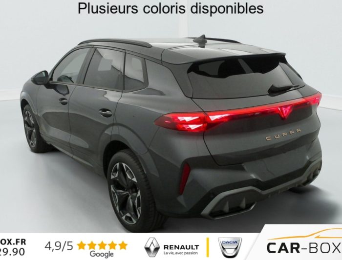 Hors frais de dossier1.5 eTSI Hybrid 150 ch DSG7 V, hybride, gris, 29/09/2025, Rétroviseurs extérieurs réglables, rabatable électriquement, dégivant, avec abaissement passager avant, Sièges avant chauffant réglable séparément : option incluse (valeur : 350 Eur TTC), Hayon électrique mains-libres »Virtual Pedal », Capteur de pluie et de luminosité, Vitres AR surteintées, Seuils de porte CUPRA rétro-éclairés, Connectivity Box avec chargeur à induction, Reconnaissance des panneaux de signalisation (Sign Assist), Ciel de pavillon Noir, Radio numérique DAB, Eclairage de bienvenue avec projection du logo CUPRA au sol, Caméra de recul, Dossiers AR rabattables 2/3 – 1/3, Fixations ISOFIX avec Top-Tether à l’AR, Direction dynamique, Climatisation automatique tri-zone "Climatronic", Aide au stationnement AV et AR, Rétroviseur intérieur électrochrome, Airbags latéreaux, rideaux et central, Régulateur de vitesse adaptatif ACC, Smart Ambient Light (éclairage d’ambiance intérieur intelligent), Kit de dépannage : compresseur 12 V et produit d’étanchéité de pneu, Peinture métallisée : option incluse (valeur : 760 Eur TTC), Peinture vernie, Full Link sans fil ( Android Auto + Apple CarPlay), Connectivité 4x USB-C et Bluetooth, Projecteurs full LED avec signature lumineuseTri-LED, Accoudoir central AV, Détection de fatigue et somnolence, Bandeau AR »Infinite Light » intégrant le logo CUPRA lumineux avec signature lumineuse Tri-LED et cérémonie de bienvenue, Volant Supersports CUPRA en cuir avec boutons satellites, chauffant avec palettes de changement de rapport, Système d’info-divertissement avec écran tactile HD 12, 9 » et touches de commandes tactiles rétro-éclairées, Front Assist avec détection des piétons et cyclistes, Jantes 19 » Cosmic usinées : option incluse (valeur : 600 Eur TTC), Design Intérieur Deep Ocean (sièges baquets TEP + textile Bleu Acier) – Logos CUPRA estampés sur les appuie-têtes – Planche de bord bleu acier texturée avec aérateurs cuivrés – Contre-portes en TEP noir texturé – Ciel de pavillon noir – Sièges conducteur et passager avec réglage manuel en hauteur et lombaire, Projecteurs anti-brouillard avec éclairage d’intersection et éclairage d’accompagnement, Alarme antivol avec fonction SAFE, Rails de toit Noir, Système audio à 9 HP avec contrôle vocal, Aide au maintien dans la voie (Lane Assist), Accès et démarrage mains-libres, Banquette AR coulissante 2/3 – 1/3, Digital Cockpit 10, 25" simple avec 2 affichages personnalisables