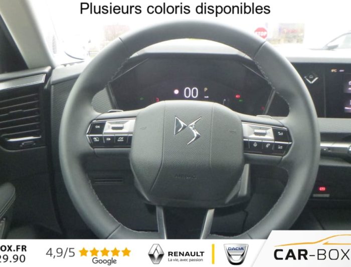 ABS avec repartiteur electronique de freinage (REF) et Aide au Freinage d'Urgence (AFU), Accoudoir central AR avec trappe a ski et 2 porte-gobelets, Accoudoir central AV, Adaptive Cruise Control Stop & Go, Aide au stationnement AV et AR et Camera de recul, Airbags frontaux (passager deconnectable), lateraux, rideaux , Alerte attention conducteur, Alerte de franchissement involontaire de ligne, Allumage automatique des feux, Antenne ''aileron de requin'', Avertisseur de risque de collision, Banquette AR 2/3 - 1/3 avec 3 appuie-tete, Clean Cabin avec Air Quality System, Climatisation automatique bi-zones , Combine numerique 7'', Commutation automatique des feux, Condamnation automatique des portes et du coffre en roulant, Console centrale avec rangement ferme, Controle dynamique de stabilite (ESP) avec antipatinage des roues (ASR), Coques de retroviseurs exterieurs noir brillant, Demarrage mains-libres, Detection de sous-gonflage, Diffuseur AR noir brillant, Drive mode , DS AIR (Aerateurs centraux invisibles avec sabre chrome), DS E-TOGGLE (Selecteur de vitesses), Eclairage d'ambiance a LED, Eclairage de boite a gants et de coffre a LED, Eclairage de cave a pieds a LED, Ecran tactile capacitif 10'' HD, Enjoliveurs de bas de porte noirs avec insert chrome, Enjoliveurs superieurs des vitres laterales chromes, Essuie-vitre AR, Essuie-vitre AV a declenchement et cadencement automatiques, Feux AR Full LED effet 3D avec traitement ecailles, Fixations ISOFIX aux places laterales AR, Frein de stationnement electrique automatique, Grille de calandre noir brillant avec pampilles chromees, Jantes alliage 19'' MINNEAPOLIS : option incluse (valeur : 400 Eur TTC), Kit de depannage provisoire de pneumatiques, Lecheurs de vitres laterales et enjoliveur de custode noir brillant, Leve-vitres AV et AR electriques, sequentiels et antipincement, Limiteur de vitesse/ Regulateur de vitesse adaptatif , Lunette AR chauffante, Mirror Screen sans fil , Monogramme DS chrome sur l'enjoliveur de custode lateral, Monogramme exterieur PALLAS sur le capot, Monogrammes AV/AR chromes, Pack Confort (Hayon motorise Fermeture motorisee par le coffre et ouverture par le coffre, la cle ou le bouton situe sur la planche de bord, Reglage lombaire pneumatique, Siege conducteur electrique a 10 voies avec memoire de position, nez de coussin reglable mecaniquement et fonction accueil, Sieges AV chauffants, Vitres AR et lunette AR surteintees, Vitres laterales AV et AR feuilletees acoustiques) : option incluse (valeur : 1 900 Eur TTC), Palettes au volant, Pares-soleil avec miroirs de courtoisie occultables eclaires a LED, Plafonnier I-Dome tactile, Poignees exterieures affleurantes chromees, Prises 12V avant et coffre , Projecteurs a LED, Radio numerique terrestre (DAB), Reconnaissance etendue des panneaux de circulation, Retroviseur interieur electrochrome sans cadre, Retroviseurs exterieurs electriques, degivrants, rabattables electriquement, Securite Enfants, SOS & ASSISTANCE, Systeme start and stop , Verins d'ouverture et de maintien du capot moteur, Vitres laterales AV feuilletees acoustiques, Volant reglable en hauteur et profondeur, 2 prises USB-C avant + 2 prises USB-C arriere