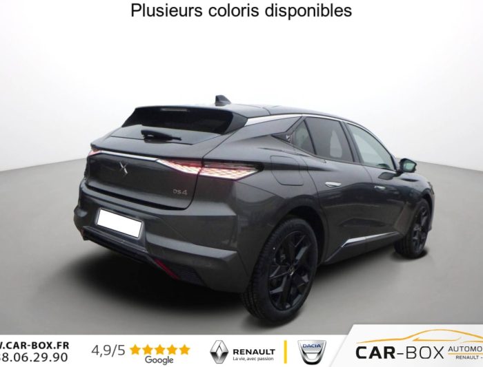 DS4 BlueHDi 130 EAT8 Pallas, diesel, gris, 23/12/2024, ABS avec repartiteur electronique de freinage (REF) et Aide au Freinage d’Urgence (AFU), Accoudoir central AR avec trappe a ski et 2 porte-gobelets, Accoudoir central AV avec compartiment de rangement, Adaptive Cruise Control Stop & Go, Aide au stationnement AV et AR et Camera de recul, Airbags frontaux (passager deconnectable), lateraux AV, rideaux aux places AV/AR et central, Alerte attention conducteur, Alerte de franchissement involontaire de ligne, Allumage automatique des feux, Antenne  »aileron de requin », Avertisseur de risque de collision, Banquette AR 2/3 – 1/3 avec 3 appuie-tete, Clean Cabin avec Air Quality System, Climatisation automatique bi-zones, Combine numerique 7 », Commutation automatique des feux, Console centrale avec rangement ferme, Controle dynamique de stabilite (ESP) avec antipatinage des roues (ASR), Coques de retroviseurs exterieurs noir brillant, Demarrage mains-libres, Detection de sous-gonflage, Diffuseur AR noir brillant, Drive mode, Drive mode, DS AIR (Aerateurs centraux invisibles avec sabre chrome), DS E-TOGGLE (Selecteur de vitesses), Eclairage d’ambiance a LED, Eclairage de boite a gants et de coffre a LED, Eclairage de cave a pieds a LED, Ecran tactile capacitif 10 » HD, Enjoliveurs de bas de porte noirs avec insert chrome, Enjoliveurs superieurs des vitres laterales chromes, Essuie-vitre AR, Essuie-vitre AV a declenchement et cadencement automatiques, Feux AR Full LED effet 3D avec traitement ecailles, Fixations ISOFIX aux places laterales AR, Frein de stationnement electrique automatique, Grille de calandre noir brillant avec pampilles chromees, Jantes alliage 19 » MINNEAPOLIS : option incluse (valeur : 400 Eur TTC), Kit de depannage provisoire de pneumatiques, Lecheurs de vitres laterales et enjoliveur de custode noir brillant, Leve-vitres AV et AR electriques, sequentiels et antipincement, Limiteur de vitesse/ Regulateur de vitesse adaptatif, Lunette AR chauffante, Mirror Screen sans fil, Monogramme DS chrome sur l’enjoliveur de custode lateral, Monogramme exterieur PALLAS sur le capot, Monogrammes AV/AR chromes, Pack Confort (Hayon motorise Fermeture motorisee par le coffre et ouverture par le coffre, la cle ou le bouton situe sur la planche de bord, Reglage lombaire, Siege conducteur electrique a 10 voies avec memoire de position, nez de coussin reglable mecaniquement et fonction accueil, Sieges AV chauffants, Vitres AR et lunette AR surteintees, Vitres laterales AV et AR feuilletees acoustiques) : option incluse (valeur : 1 900 Eur TTC), Palettes au volant, Pares-soleil avec miroirs de courtoisie occultables eclaires a LED, Plafonnier I-Dome tactile, Poignees exterieures affleurantes chromees, Prises 12V avant et coffre, Projecteurs a LED, Radio numerique terrestre (DAB), Reconnaissance etendue des panneaux de circulation, Retroviseur interieur electrochrome sans cadre, Retroviseurs exterieurs electriques, degivrants, rabattables electriquement, Securite Enfants, SOS & ASSISTANCE, Systeme start and stop, Systeme start and stop, Verins d’ouverture et de maintien du capot moteur, Vitres laterales AV feuilletees acoustiques, Volant reglable en hauteur et profondeur, 2 prises USB-C avant + 2 prises USB-C arriere, 2 prises USB-C avant + 2 prises USB-C arriere