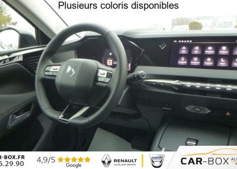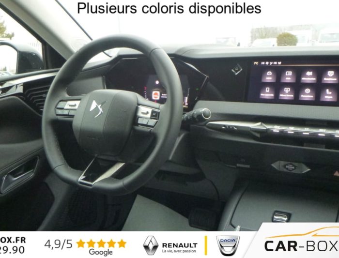 ABS avec repartiteur electronique de freinage (REF) et Aide au Freinage d'Urgence (AFU), Accoudoir central AR avec trappe a ski et 2 porte-gobelets, Accoudoir central AV avec compartiment de rangement , Adaptive Cruise Control Stop & Go, Aide au stationnement AV et AR et Camera de recul, Airbags frontaux (passager deconnectable), lateraux AV, rideaux aux places AV/AR et central, Alerte attention conducteur, Alerte de franchissement involontaire de ligne, Allumage automatique des feux, Antenne ''aileron de requin'', Avertisseur de risque de collision, Banquette AR 2/3 - 1/3 avec 3 appuie-tete, Clean Cabin avec Air Quality System, Climatisation automatique bi-zones , Combine numerique 7'', Commutation automatique des feux, Console centrale avec rangement ferme, Controle dynamique de stabilite (ESP) avec antipatinage des roues (ASR), Coques de retroviseurs exterieurs noir brillant, Demarrage mains-libres, Detection de sous-gonflage, Diffuseur AR noir brillant, Drive mode , Drive mode , DS AIR (Aerateurs centraux invisibles avec sabre chrome), DS E-TOGGLE (Selecteur de vitesses), Eclairage d'ambiance a LED, Eclairage de boite a gants et de coffre a LED, Eclairage de cave a pieds a LED, Ecran tactile capacitif 10'' HD, Enjoliveurs de bas de porte noirs avec insert chrome, Enjoliveurs superieurs des vitres laterales chromes, Essuie-vitre AR, Essuie-vitre AV a declenchement et cadencement automatiques, Feux AR Full LED effet 3D avec traitement ecailles, Fixations ISOFIX aux places laterales AR, Frein de stationnement electrique automatique, Grille de calandre noir brillant avec pampilles chromees, Jantes alliage 19'' MINNEAPOLIS : option incluse (valeur : 400 Eur TTC), Kit de depannage provisoire de pneumatiques, Lecheurs de vitres laterales et enjoliveur de custode noir brillant, Leve-vitres AV et AR electriques, sequentiels et antipincement, Limiteur de vitesse/ Regulateur de vitesse adaptatif , Lunette AR chauffante, Mirror Screen sans fil, Monogramme DS chrome sur l'enjoliveur de custode lateral, Monogramme exterieur PALLAS sur le capot, Monogrammes AV/AR chromes, Pack Confort (Hayon motorise Fermeture motorisee par le coffre et ouverture par le coffre, la cle ou le bouton situe sur la planche de bord, Reglage lombaire, Siege conducteur electrique a 10 voies avec memoire de position, nez de coussin reglable mecaniquement et fonction accueil, Sieges AV chauffants, Vitres AR et lunette AR surteintees, Vitres laterales AV et AR feuilletees acoustiques) : option incluse (valeur : 1 900 Eur TTC), Palettes au volant, Pares-soleil avec miroirs de courtoisie occultables eclaires a LED, Plafonnier I-Dome tactile, Poignees exterieures affleurantes chromees, Prises 12V avant et coffre , Projecteurs a LED, Radio numerique terrestre (DAB), Reconnaissance etendue des panneaux de circulation, Retroviseur interieur electrochrome sans cadre, Retroviseurs exterieurs electriques, degivrants, rabattables electriquement, Securite Enfants, SOS & ASSISTANCE, Systeme start and stop , Systeme start and stop , Verins d'ouverture et de maintien du capot moteur, Vitres laterales AV feuilletees acoustiques, Volant reglable en hauteur et profondeur, 2 prises USB-C avant + 2 prises USB-C arriere , 2 prises USB-C avant + 2 prises USB-C arriere