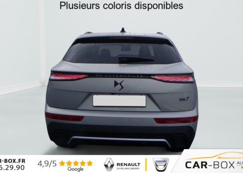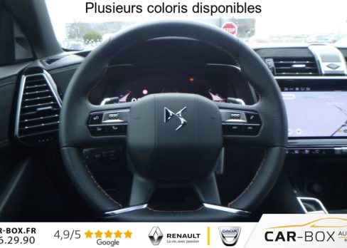 ABS avec repartiteur electronique de freinage (REF) et Aide au Freinage d'Urgence (AFU) + Aide au demarrage en pente, Acces et demarrage mains libres, Accoudoir central arriere avec double porte-gobelets et trappe a skis , Accoudoir central Toile DS avec rangement, Aide au stationnement avant et arriere, Airbags frontaux, lateraux avant et rideaux, Alarme avec supercondamnation des portes et securite enfant electrique Perimetrique, volumetrique, et fonction anti-soulevement. Inclut les ecrous antivol : option incluse (valeur : 500 Eur TTC), Alerte Attention Conducteur, Alerte de franchissement involontaire de ligne, Allumage automatique des feux avec Commutation automatique des feux de route, Appel d'urgence et d'assistance, Assistant vocal, Badge DS noir brillant sur le capot, Banquette arriere 2/3 - 1/3, Barres de toit noires brillantes : option incluse (valeur : 300 Eur TTC), Camera de recul : option incluse (valeur : 390 Eur TTC), Chargeur sans fils pour Smartphone : option incluse (valeur : 250 Eur TTC), Climatisation automatique bi-zones , Combine numerique 12.3'' HD, Controle dynamique de stabilite (ESP) avec antipatinage des roues (ASR), Detection de sous-gonflage, DS IRIS System, DS Wings noir brillant, Eclairage d'accueil et d'accompagnement, Eclairage de cave a pieds a LED, Ecran tactile capacitif 12,3'' HD, Entourage des vitres laterales Noir Brillant, Essuie-vitre avant a declenchement et cadencement automatiques + Buses de lavage, Feux antibrouillard arriere , Feux arriere 3D (traitement ecailles) avec indicateur de changement de direction defilant, Fixations Isofix aux places laterales AR et passager , Frein de stationnement electrique automatique, Freinage d'urgence automatique pilote par camera, Grille de calandre noir brillant, Hayon motorise avec acces bras charges : option incluse (valeur : 890 Eur TTC), Jantes alliage 19'' Silverstone, Kit de depannage, Leve-vitres avant et arriere electriques, sequentiels et avec fonction antipincement, Lunette arriere chauffante, Mirror Screen , Monogrammes arriere noir brillant, Navigation 3D Connectee , Pack Confort ( Sieges AV chauffants, Pare-brise chauffant, 2 prises USB Type C dans le rangement en AV de console ) : option incluse (valeur : 600 Eur TTC), Palettes au volant, Pares-soleil avec miroirs de courtoisie eclaires, Pedalier et le repose-pied aluminium, Poignees exterieures couleur caisse avec insert chrome, Predisposition Plancher modulable a 2 positions, Prises 12V avant et coffre, Projecteurs a LED Feux de croisement et de position a LED, Radio numerique terrestre (DAB), Reconnaissance etendue des panneaux de circulation, Reglage lombaire electrique uniquement cote conducteur, Regulateur/Limiteur de vitesse, Retroviseur interieur electrochrome sans cadre, Retroviseurs exterieurs electriques degivrants, rabattables electriquement , Selecteur de mode de conduite, Seuil de coffre chrome, Sieges avant confort, Reglage en hauteur et en longueur , Surveillance d'angles morts, Systeme start and stop, Vitres arriere surteintees, Volant reglable en hauteur et profondeur, 2 prises USB-A arriere, 2 prises USB-C avant