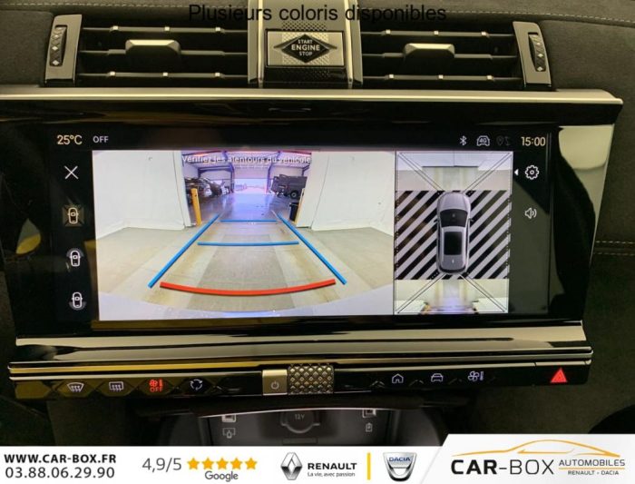 Allumage automatique des feux Avec commutation automatique des feux de route, Pédalier et le repose-pied aluminium, Sièges AV chauffants, Détection de sous-gonflage, Régulateur/Limiteur de vitesse, Frein de stationnement électrique automatique, Volant réglable en hauteur et profondeur, Vitres AR et lunette AR surteintées, Seuil de coffre chromé, Radio numérique terrestre (DAB), Lunette AR chauffante, Pare-brise chauffant, DS PIXEL LED VISION 3.0, Alerte Attention Conducteur, Alerte de franchissement involontaire de ligne, Lève-vitres AV/AR électriques, séquentiels et avec fonction antipincement, Rétroviseur intérieur électrochrome sans cadre, Contrôle dynamique de stabilité (ESP) avec antipatinage des roues (ASR), Palettes au volant, Vérins d'ouverture et de maintien du capot moteur, Surveillance d'angles morts, Sélecteur de mode de conduite, DS Wings noir brillant, Entourage des vitres latérales Noir Brillant, Feux AR 3D (traitement écailles) Avec indicateur de changement de direction défilant, Jonc supérieur de volet Noir brillant avec lettrage 'DS AUTOMOBILES' chromé, Freinage d'urgence automatique piloté par caméra et radar, ABS avec répartiteur électronique de freinage (REF) et Aide au Freinage d'Urgence (AFU) + Aide au démarrage en pente, Airbags frontaux (passager déconnectable), latéraux AV, rideaux AV/AR, DS LIGHT VEIL Feux de jour à LED, Kit de dépannage, Pare-brise teinté acoustique, Rétroviseurs extérieurs électriques dégivrants, rabattables électriquement Fonction électrochrome côté conducteur, Projection au sol du logo DS, Indexé à la marche AR côté passager, Accoudoir central AR, Banquette AR 2/3 - 1/3, Climatisation automatique bi-zone, Eclairage d'accueil et d'accompagnement, Grille de calandre noir brillant avec pampilles chromées, Jonc sur jupe AR chromé, Monogrammes AR chromé, Rétroviseurs extérieurs avec embase couleur caisse et coque noir brillant, Sabot AV chromé, Accoudoir central en Toile DS avec rangement, Eclairage d'ambiance à LED, Combiné numérique 12.3" HD, Double antennes, DS IRIS SYSTEM Système d'infotainment personnalisable de dernière génération, Mirror Screen sans fil via Wifi Compatible Apple CarPlay et Android Auto, Prises USB 1 prise USB type C dans le rangement de la console centrale et 2 prises USB type A pour les passagers AR, Prises 12 V 1 prise dans le rangement AV de la console centrale et 1 prise dans le coffre, Intérieur Alcantara Noir profond : Console centrale en Alcantara Noir Profond Panneaux de portes en Alcantara Noir Profond et surpiqûres Carmin et Or Planche de bord Alcantara Noir Profond et surpiqûres Carmin et Or Volant Cuir fleur perforé et coutures Carmin et Or Sièges Alcantara Noir Profond avec Toile DS, Essuie-vitre AV à déclenchement et cadencement automatiques + Buses de lavage, Centre de roue Noir brillant, Aide au stationnement AV et AR et Caméra de recul, Navigation 3D Connectée, Reconnaissance étendue des panneaux de signalisation, Barres de toit noir brillant, Prédisposition Plancher modulable à 2 positions, Black Pack, Teinte Caisse métallisée : option incluse (valeur : 900 Eur TTC), Jantes alliage 19'' EDINBURGH, pneus 235/50 R19 V, Ciel de pavillon Sombre, Boîte à gants ventilée, Contrôle électronique de stabilité de l'attelage, Ecran tactile capacitif 12'' HD, Logo DS de calandre Chromé, Pack Tech - L'Alarme - Le 360 Vision - Le Chargeur sans fil pour Smartphone - Le DS DRIVE ASSIST - Une seconde prise USB Type C dans le rangement en AV de console : DS Drive Assist Aide au stationnement AV/AR et 360 Vision Chargeur sans fil pour smartphone Alarme avec supercondamnation des portes et sécurité enfant électrique Périmétrique, volumétrique, et fonction anti-soulèvement. Inclut les écrous antivol. Seconde prise USB Type C dans le rangement en AV de console centrale : option incluse (valeur : 1 200 Eur TTC), Badge DS PALLAS spécifique sur le capot, Poignées extérieures couleur caisse, Sièges AV électriques avec mémorisation du siège conducteur, Accès et démarrage mains libres, Ceintures conducteur et passager à enrouleur pyrotechnique, réglage en hauteur avec limitation d'effort et prétension, Seuil de portes AV, Direction assistée, Verrouillage centralisée, Fixations ISOFIX aux places latérales AR Inclut TOP TEATHER, Boîte de vitesse automatique 8 vitesses