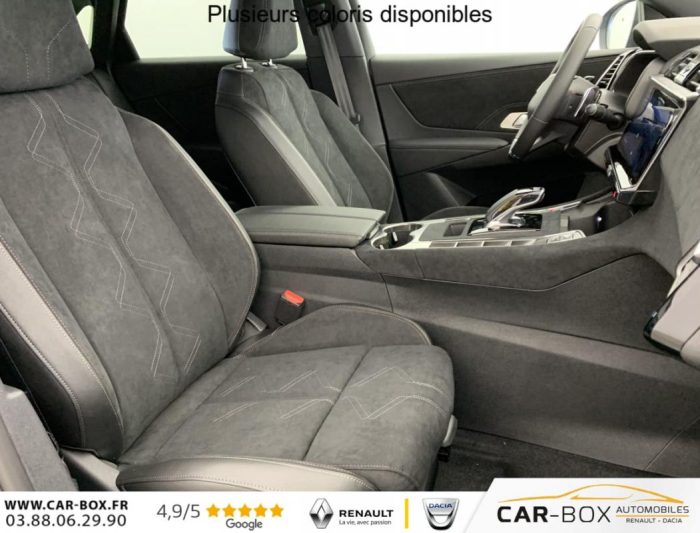 Allumage automatique des feux Avec commutation automatique des feux de route, Pédalier et le repose-pied aluminium, Sièges AV chauffants, Détection de sous-gonflage, Régulateur/Limiteur de vitesse, Frein de stationnement électrique automatique, Volant réglable en hauteur et profondeur, Vitres AR et lunette AR surteintées, Seuil de coffre chromé, Radio numérique terrestre (DAB), Lunette AR chauffante, Pare-brise chauffant, DS PIXEL LED VISION 3.0, Alerte Attention Conducteur, Alerte de franchissement involontaire de ligne, Lève-vitres AV/AR électriques, séquentiels et avec fonction antipincement, Rétroviseur intérieur électrochrome sans cadre, Contrôle dynamique de stabilité (ESP) avec antipatinage des roues (ASR), Palettes au volant, Vérins d'ouverture et de maintien du capot moteur, Surveillance d'angles morts, Sélecteur de mode de conduite, DS Wings noir brillant, Entourage des vitres latérales Noir Brillant, Feux AR 3D (traitement écailles) Avec indicateur de changement de direction défilant, Jonc supérieur de volet Noir brillant avec lettrage 'DS AUTOMOBILES' chromé, Freinage d'urgence automatique piloté par caméra et radar, ABS avec répartiteur électronique de freinage (REF) et Aide au Freinage d'Urgence (AFU) + Aide au démarrage en pente, Airbags frontaux (passager déconnectable), latéraux AV, rideaux AV/AR, DS LIGHT VEIL Feux de jour à LED, Kit de dépannage, Pare-brise teinté acoustique, Rétroviseurs extérieurs électriques dégivrants, rabattables électriquement Fonction électrochrome côté conducteur, Projection au sol du logo DS, Indexé à la marche AR côté passager, Accoudoir central AR, Banquette AR 2/3 - 1/3, Climatisation automatique bi-zone, Eclairage d'accueil et d'accompagnement, Grille de calandre noir brillant avec pampilles chromées, Jonc sur jupe AR chromé, Monogrammes AR chromé, Rétroviseurs extérieurs avec embase couleur caisse et coque noir brillant, Sabot AV chromé, Accoudoir central en Toile DS avec rangement, Eclairage d'ambiance à LED, Combiné numérique 12.3" HD, Double antennes, DS IRIS SYSTEM Système d'infotainment personnalisable de dernière génération, Mirror Screen sans fil via Wifi Compatible Apple CarPlay et Android Auto, Prises USB 1 prise USB type C dans le rangement de la console centrale et 2 prises USB type A pour les passagers AR, Prises 12 V 1 prise dans le rangement AV de la console centrale et 1 prise dans le coffre, Intérieur Alcantara Noir profond : Console centrale en Alcantara Noir Profond Panneaux de portes en Alcantara Noir Profond et surpiqûres Carmin et Or Planche de bord Alcantara Noir Profond et surpiqûres Carmin et Or Volant Cuir fleur perforé et coutures Carmin et Or Sièges Alcantara Noir Profond avec Toile DS, Essuie-vitre AV à déclenchement et cadencement automatiques + Buses de lavage, Centre de roue Noir brillant, Aide au stationnement AV et AR et Caméra de recul, Navigation 3D Connectée, Reconnaissance étendue des panneaux de signalisation, Barres de toit noir brillant, Prédisposition Plancher modulable à 2 positions, Black Pack, Teinte Caisse métallisée : option incluse (valeur : 900 Eur TTC), Jantes alliage 19'' EDINBURGH, pneus 235/50 R19 V, Ciel de pavillon Sombre, Boîte à gants ventilée, Contrôle électronique de stabilité de l'attelage, Ecran tactile capacitif 12'' HD, Logo DS de calandre Chromé, Pack Tech - L'Alarme - Le 360 Vision - Le Chargeur sans fil pour Smartphone - Le DS DRIVE ASSIST - Une seconde prise USB Type C dans le rangement en AV de console : DS Drive Assist Aide au stationnement AV/AR et 360 Vision Chargeur sans fil pour smartphone Alarme avec supercondamnation des portes et sécurité enfant électrique Périmétrique, volumétrique, et fonction anti-soulèvement. Inclut les écrous antivol. Seconde prise USB Type C dans le rangement en AV de console centrale : option incluse (valeur : 1 200 Eur TTC), Badge DS PALLAS spécifique sur le capot, Poignées extérieures couleur caisse, Sièges AV électriques avec mémorisation du siège conducteur, Accès et démarrage mains libres, Ceintures conducteur et passager à enrouleur pyrotechnique, réglage en hauteur avec limitation d'effort et prétension, Seuil de portes AV, Direction assistée, Verrouillage centralisée, Fixations ISOFIX aux places latérales AR Inclut TOP TEATHER, Boîte de vitesse automatique 8 vitesses