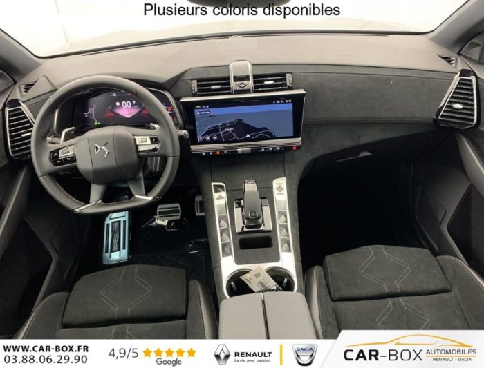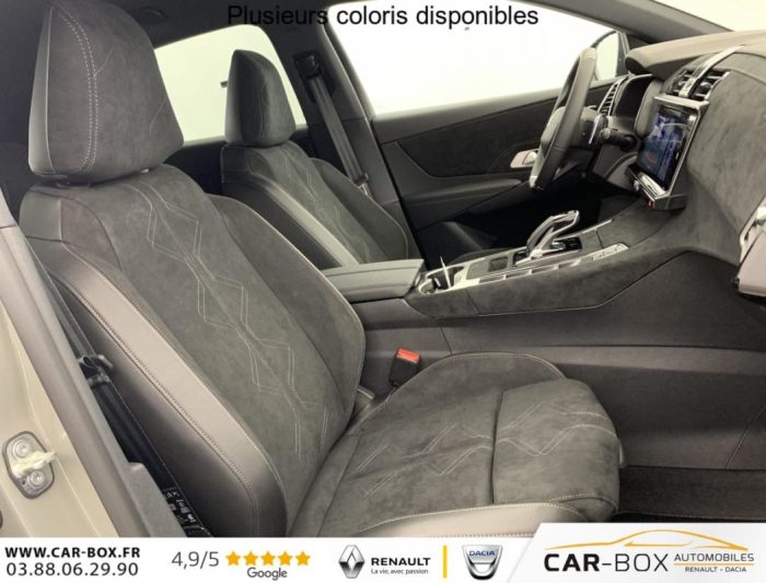 Allumage automatique des feux Avec commutation automatique des feux de route, Pédalier et le repose-pied aluminium, Sièges AV chauffants, Détection de sous-gonflage, Régulateur/Limiteur de vitesse, Frein de stationnement électrique automatique, Volant réglable en hauteur et profondeur, Vitres AR et lunette AR surteintées, Seuil de coffre chromé, Radio numérique terrestre (DAB), Lunette AR chauffante, Pare-brise chauffant, DS PIXEL LED VISION 3.0, Alerte Attention Conducteur, Alerte de franchissement involontaire de ligne, Lève-vitres AV/AR électriques, séquentiels et avec fonction antipincement, Rétroviseur intérieur électrochrome sans cadre, Contrôle dynamique de stabilité (ESP) avec antipatinage des roues (ASR), Palettes au volant, Vérins d'ouverture et de maintien du capot moteur, Surveillance d'angles morts, Sélecteur de mode de conduite, DS Wings noir brillant, Entourage des vitres latérales Noir Brillant, Feux AR 3D (traitement écailles) Avec indicateur de changement de direction défilant, Jonc supérieur de volet Noir brillant avec lettrage 'DS AUTOMOBILES' chromé, Freinage d'urgence automatique piloté par caméra et radar, ABS avec répartiteur électronique de freinage (REF) et Aide au Freinage d'Urgence (AFU) + Aide au démarrage en pente, Airbags frontaux (passager déconnectable), latéraux AV, rideaux AV/AR, DS LIGHT VEIL Feux de jour à LED, Fixations ISOFIX à la place passager AV et aux places latérales AR Inclut TOP TEATHER, Kit de dépannage, Pare-brise teinté acoustique, Rétroviseurs extérieurs électriques dégivrants, rabattables électriquement Fonction électrochrome côté conducteur, Projection au sol du logo DS, Indexé à la marche AR côté passager, Accoudoir central AR, Banquette AR 2/3 - 1/3, Climatisation automatique bi-zone, Eclairage d'accueil et d'accompagnement, Grille de calandre noir brillant avec pampilles chromées, Jonc sur jupe AR chromé, Monogrammes AR chromé, Rétroviseurs extérieurs avec embase couleur caisse et coque noir brillant, Sabot AV chromé, Accoudoir central en Toile DS avec rangement, Eclairage d'ambiance à LED, Combiné numérique 12.3" HD, Double antennes, DS IRIS SYSTEM Système d'infotainment personnalisable de dernière génération, Mirror Screen sans fil via Wifi Compatible Apple CarPlay et Android Auto, Navigation 3D Connectée, Prises USB 1 prise USB type C dans le rangement de la console centrale et 2 prises USB type A pour les passagers AR, Prises 12 V 1 prise dans le rangement AV de la console centrale et 1 prise dans le coffre, Intérieur Alcantara Noir profond : Console centrale en Alcantara Noir Profond Panneaux de portes en Alcantara Noir Profond et surpiqûres Carmin et Or Planche de bord Alcantara Noir Profond et surpiqûres Carmin et Or Volant Cuir fleur perforé et coutures Carmin et Or Sièges Alcantara Noir Profond avec Toile DS, Essuie-vitre AV à déclenchement et cadencement automatiques + Buses de lavage, Centre de roue Noir brillant, Aide au stationnement AV et AR et Caméra de recul, Reconnaissance étendue des panneaux de signalisation, Barres de toit noir brillant, Black Pack, Teinte Caisse métallisée : option incluse (valeur : 900 Eur TTC), Jantes alliage 19'' EDINBURGH, pneus 235/50 R19 V, Ciel de pavillon Sombre, SOS & Assistance , Boîte à gants ventilée, Contrôle électronique de stabilité de l'attelage, Ecran tactile capacitif 12'' HD, Logo DS de calandre Chromé, Badge DS PALLAS spécifique sur le capot, Poignées extérieures couleur caisse, Sièges AV électriques avec mémorisation du siège conducteur, Accès et démarrage mains libres, Ceintures conducteur et passager à enrouleur pyrotechnique, réglage en hauteur avec limitation d'effort et prétension, Seuil de portes AV