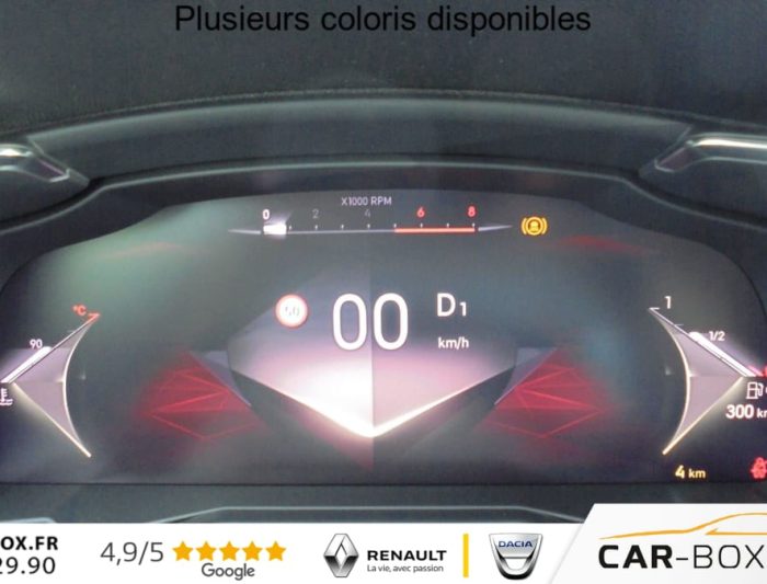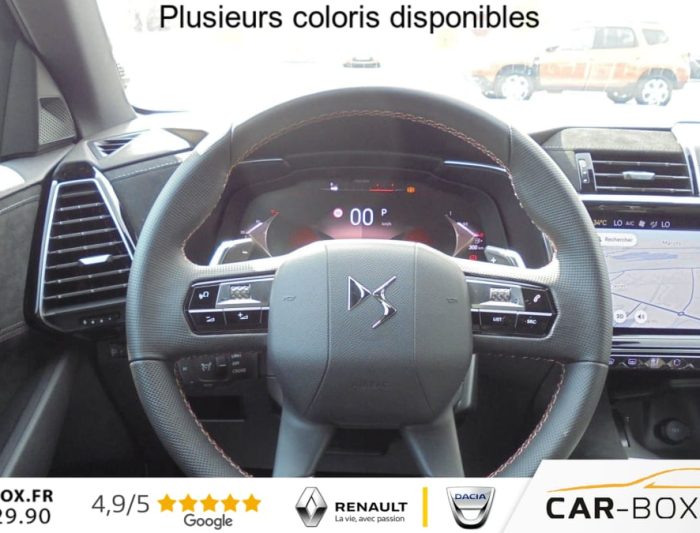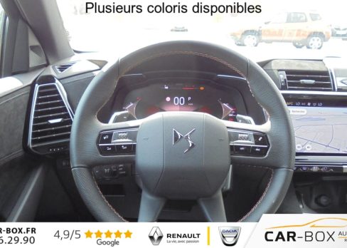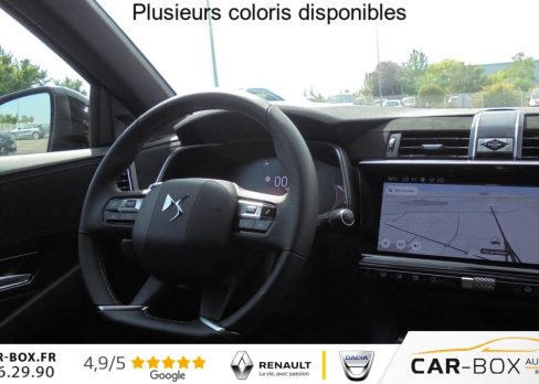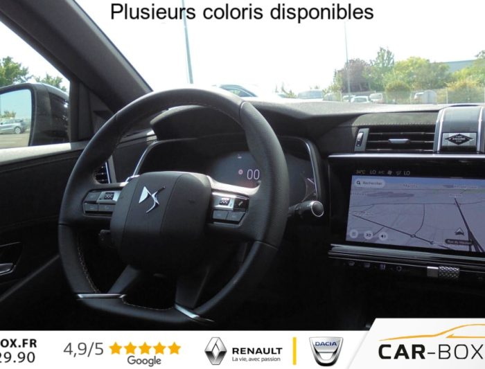ABS avec repartiteur electronique de freinage (REF) et Aide au Freinage d'Urgence (AFU) + Aide au demarrage en pente, Acces et demarrage mains libres, Accoudoir central arriere avec double porte-gobelets et trappe a skis , Accoudoir central Toile DS avec rangement, Aide au stationnement avant et arriere, Airbags frontaux, lateraux avant et rideaux, Alarme avec supercondamnation des portes et securite enfant electrique Perimetrique, volumetrique, et fonction anti-soulevement. Inclut les ecrous antivol : option incluse (valeur : 500 Eur TTC), Alerte Attention Conducteur, Alerte de franchissement involontaire de ligne, Allumage automatique des feux avec Commutation automatique des feux de route, Appel d'urgence et d'assistance, Assistant vocal , Badge DS noir brillant sur le capot, Banquette arriere 2/3 - 1/3, Barres de toit noires brillantes : option incluse (valeur : 300 Eur TTC), Camera de recul : option incluse (valeur : 390 Eur TTC), Chargeur sans fils pour Smartphone : option incluse (valeur : 250 Eur TTC), Climatisation automatique bi-zones , Combine numerique 12.3'' HD, Controle dynamique de stabilite (ESP) avec antipatinage des roues (ASR), Detection de sous-gonflage, DS IRIS System, DS Wings noir brillant, Eclairage d'accueil et d'accompagnement, Eclairage de cave a pieds a LED, Ecran tactile capacitif 12,3'' HD, Entourage des vitres laterales Noir Brillant, Essuie-vitre avant a declenchement et cadencement automatiques + Buses de lavage, Feux antibrouillard arriere , Feux arriere 3D (traitement ecailles) avec indicateur de changement de direction defilant, Fixations Isofix aux places laterales AR et passager , Frein de stationnement electrique automatique, Freinage d'urgence automatique pilote par camera, Grille de calandre noir brillant, Hayon motorise avec acces bras charges : option incluse (valeur : 890 Eur TTC), Jantes alliage 19'' Silverstone, Kit de depannage, Leve-vitres avant et arriere electriques, sequentiels et avec fonction antipincement, Lunette arriere chauffante, Mirror Screen , Monogrammes arriere noir brillant, Navigation 3D Connectee , Pack Confort ( Sieges AV chauffants, Pare-brise chauffant, 2 prises USB Type C dans le rangement en AV de console ) : option incluse (valeur : 600 Eur TTC), Palettes au volant, Pares-soleil avec miroirs de courtoisie eclaires , Pedalier et le repose-pied aluminium, Poignees exterieures couleur caisse avec insert chrome, Predisposition Plancher modulable a 2 positions, Prises 12V avant et coffre, Projecteurs a LED Feux de croisement et de position a LED, Radio numerique terrestre (DAB), Reconnaissance etendue des panneaux de circulation, Reglage lombaire electrique uniquement cote conducteur, Regulateur/Limiteur de vitesse, Retroviseur interieur electrochrome sans cadre, Retroviseurs exterieurs electriques degivrants, rabattables electriquement , Selecteur de mode de conduite, Seuil de coffre chrome, Sieges avant confort, Reglage en hauteur et en longueur , Surveillance d'angles morts, Systeme start and stop , Vitres arriere surteintees, Volant reglable en hauteur et profondeur, 2 prises USB-A arriere , 2 prises USB-C avant