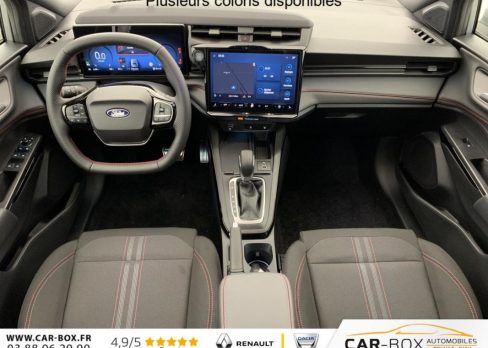 Aide au stationnement AR, Caméra de recul, Peinture métallisée : option incluse (valeur : 600 Eur TTC), Prolongation garantie constructeur de 24 à 36 mois : option incluse (valeur : 560 Eur TTC), Console centrale avec accoudoir coulissant, Vitres électriques AV et AR, Airbags frontaux et latéraux conducteur et passager AV, Air conditionné automatique, Siège Sport, Système de surveillance de la pression des pneus, Feux AR à LED, Lecture des panneaux de signalisation, Airbags rideaux, Pare-brise acoustique, Suspension Sport, Kit de réparation des pneumatiques, Rétroviseur intérieur électrochrome, Régulateur/limiteur de vitesse, Badge ST-Line, Pommeau de levier de vitesse gainé cuir avec surpiqures rouges, Alerte de véhicule en approche, Pédalier Aluminium, Pack Confort : Hayon mains libres Accès et démarrage mains libres Recharge smartphone sans fil Rétroviseurs extérieurs électriques, chauffants, et rabattables électriquement avec éclairage d'approche et répétieurs de clignotant intégré Sièges AV avec support lombaire et siège passager réglable en hauteur : option incluse (valeur : 750 Eur TTC), Rétroviseurs extérieurs électriques, chauffants avec répétiteur de clignotant et coque couleur carrosserie, Projecteurs LED avec feux de jour et commutateur de feux de route automatique, Freins à disques AV, Tambour AR, Planche de bord en vinyle Premium, Megabox (compartiment de rangement sous le plancher du coffre), Assistant de pré collision avec freinage post collision, Assistant de maintien dans la voie, Système d'infodivertissement SYNC4 avec écran tactile 12" et commandes vocales, 2 ports USB, navigation, Apple CarPlay et Android auto, 6 haut-parleurs, Combiné d'instrumentalisation numérique 12.8", Sélecteur de mode de conduite, Avertisseur de conduite à contre-sens, Assistance à la conduite économique, Système de contrôle de la trajectoire et de la stabilité avec assistant au freinage d'urgence et aide au démarrage en côte, Pneus eco 215/55 R17, Kit carrosserie ST-Line (bouclier AV sport et diffuseur AR), Arches de roue couleur carrosserie, Jupes latérales couleur carrosserie avec enjoliveur de porte argenté, Pommeau de levier de vitesse en Sensico, Plaques de seuil de portes en aluminium avec logo, Sièges AV en tissu avec surpiqûres rouges, Jantes alliage 17" ST-Line, Pack Hiver : Sièges AV chauffants Volant chauffant Pare-brise dégivrant QuickClear : option incluse (valeur : 500 Eur TTC), Siège conducteur à réglage lombaire, Vitres AR surteintées, Allumage automatique des phares, Siège conducteur à réglage manuel 4 positions, Siège conducteur à réglage manuel 2 positions