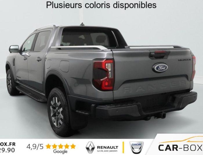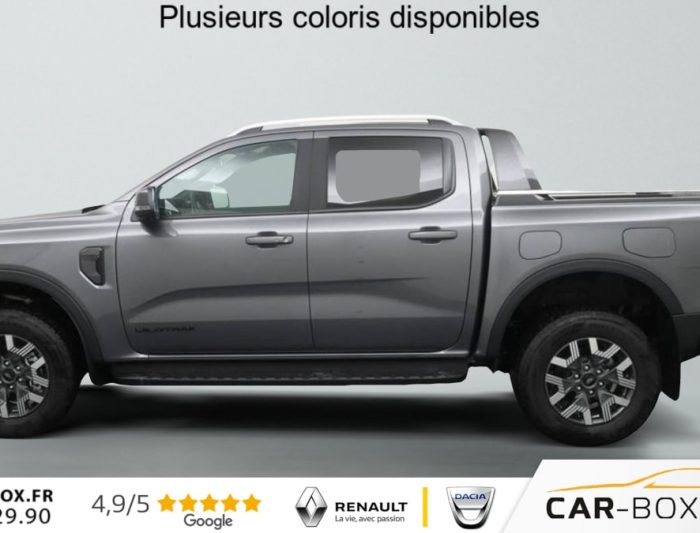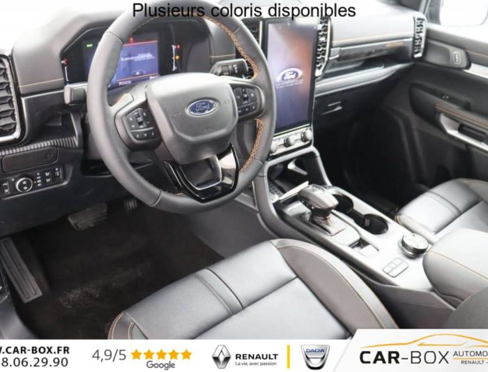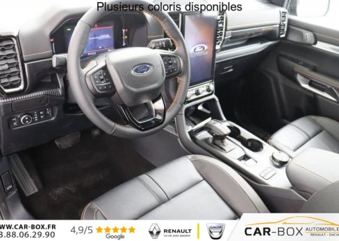 Freins à disques à l'AV et à l'AR, Plancher moquette, Réservoir 70 Litres, Poignées de portes couleur carrosserie, Feux de jour à LED, Eclairage de l'espace de chargement, Vitres AV électriques à impulsion haut/bas, Alarme volumétrique, Direction assistée à assitance éléctrique (EPAS), Dégivrage de la vitre AR, Essuie-glace AV automatique, Ridelle à verrouillage électrique, Pommeau de levier de vitesses gainé cuir, Crochets d'arrimage intérieurs de plateau, Phares anti-brouillard AV à LED, Miroir de courtoisie passager, Miroir de courtoisie conducteur, Barres de toit, Vitres surteintées, Volant chauffant, 2 Clés avec télécommande, Eclairage extérieur 360° du véhicule, Eclairage d'ambiance de la cabine à LED, Chargeur à induction, Marchepieds latéraux, Marche-pieds integre pare-chocs AR, Air conditionné automatique, Peinture métallisée : Gris carbone : option incluse (valeur : 660 Eur TTC), Sellerie cuir, ABS et contrôle dynamique de stabilité (ESP) avec amplificateur de freinage d'urgence, Capteur de pression des pneus, Faisceau attelage, Sélecteur rotatif des modes de conduite, Blocage de différentiel AR, Affichage écran tout terrain, Hayon à ouverture assistée, Protection du réservoir de carburant, Protection sous moteur, Ouverture et démarrage sans clé (Keyless), Démarrage à distance via FordPass, Modem embarqué FordPass, Vitres AR électriques à impulsion, Siège conducteur électrique réglable 8 positions, Siège passager réglable à 4 positions, Siège conducteur et siège passager chauffants, Appuis-tête central AR, Banquette 3 places rang 2, Console centrale avec espace de rangement double et accoudoir, 2 porte-gobelets, Ciel de toit anthracite, e-Shifter, Ancrage de siège AR - fixe, Arceau sport avec rails latéraux, Grille de calandre noire et Double Barres transversales noires, Pare-chocs AV bi-ton avec insert aluminium, Phares réflecteurs LED pour les feux de croisement et de route, Contrôle dynamique de trajectoire (ESP) avec ABS & Feux de freinage d'urgence (EBL) & Freinage automatique d'urgence (AEB), Double Anneau de remorquage à l'AV, Airbags frontaux, latéraux, rideaux et thorax conducteur et passager AV, Airbags genoux conducteur et passager AV, Pare-chocs AR contrastant avec marche-pied central, Protection de plateau avec prise 12V, Airbag situé au niveau de l'accoudoir central entre le conducteur et le passager AV, Séparateur de chargement coulissant et amovible comprend rails intérieur de benne avec crochets, comprend crochets coulissants avec 9 points d'ancrage : option incluse (valeur : 480 Eur TTC), Suppression de Protection de Plateau, Réglage manuel de la hauteur des phares, Prise de recharge à l'AV gauche du véhicule, Bas de la calandre avec volets de refroidissement actifs, Coques de rétroviseurs anthracites, Combiné d'instrumentation digital 8'', Compatibilité smartphone Apple CarPlay et Android Auto sans fil, Jantes aluminium 8x18'' avec pneumatiques 255/65R 18 A/T comprend roue de secours aluminium : option incluse (valeur : 240 Eur TTC), PACK TECHNOLOGIE 46 : BLIS TOW + ASSISTANT REMORQUAGE + REGULATEUR INTELLIGENT : Aide au maintien dans la voie Aide au stationnement AR Aide au stationnement AV Alerte angle mort avec remorque (BLIS Tow) Allumage automatique des feux avec commutation automatique entre feux de croisement et feux de route Assistance au freinage d'urgence en marche AR Assistance remorquage permet de reculer aisément avec une remorque Atténuation d'impact après collision Caméra 360° Frein de stationnement électrique Limiteur de vitesse intelligent Reconnaissance des panneaux de signalisation Régulateur de vitesse adaptatif intelligent Système anti-collision avec freinage d'urgence et aide à l'évitement Système audio Bang & Olufsen à 8 HP : option incluse (valeur : 900 Eur TTC), Rétroviseurs extérieurs réglables et rabattables électriquement et chauffants avec éclairage de courtoisie, Suspensions renforcées, Câble de charge 7 m avec prise domestique, Système Audio SYNC 4 : 12", 6 HP, Navigation, Volant multifonction en cuir avec surpiqures contrastantes, Suppression active du bruit dans la cabine et amplificateur du son moteur via les haut-parleurs, Pare-brise chauffant, Bavettes AV/AR, Rétroviseur intérieur électrochromatique